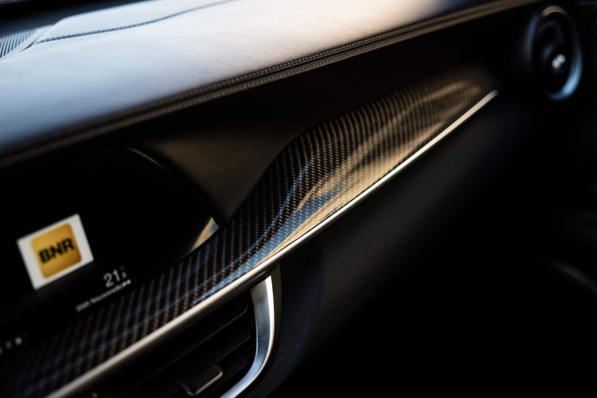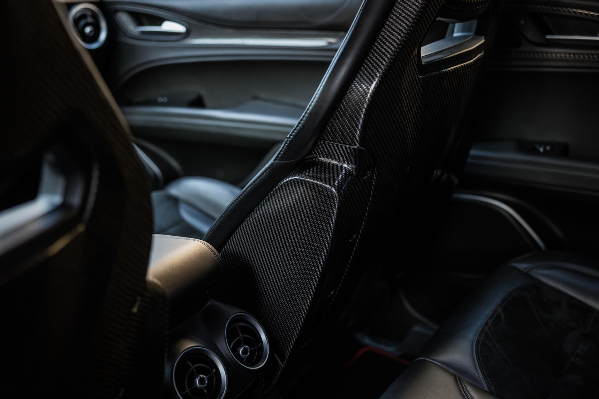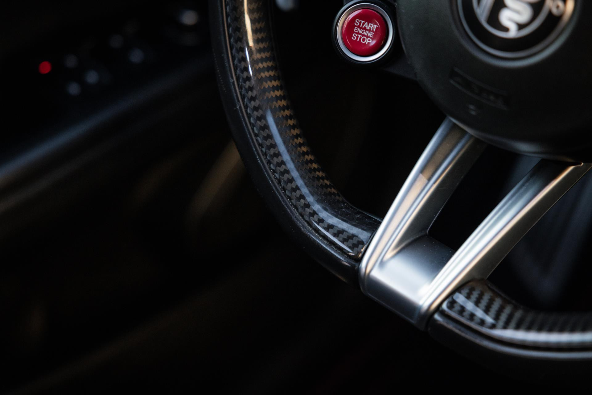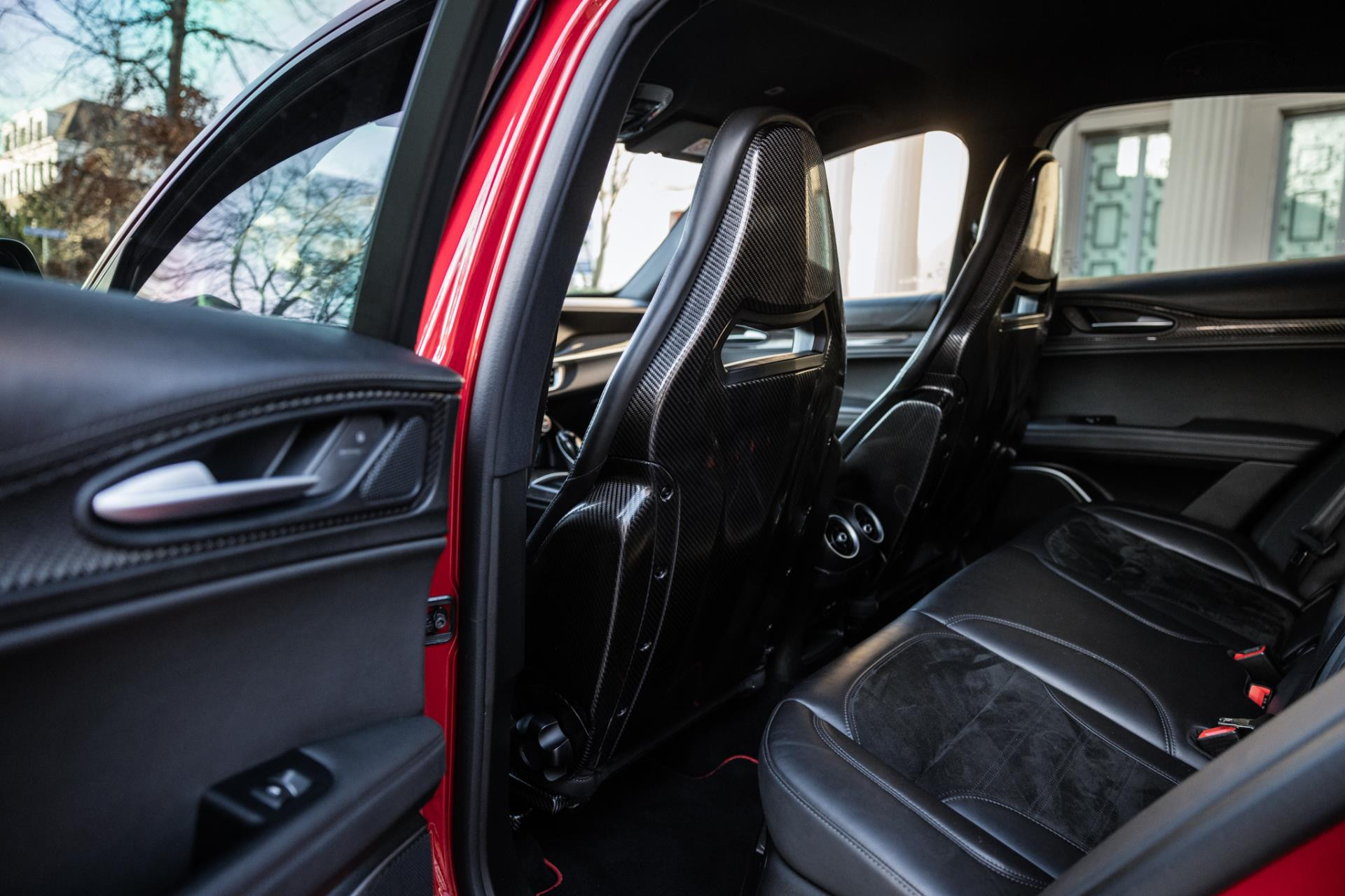 En dan het interieur. Deze Stelvio is voorzien van de zeldzame af fabriek geleverde Sparco carbon kuipstoelen. Bekleed met een dun laagje zwart leder en alcantara. Een perfecte zit met veel zijdelingse steun, maar tevens een lust voor het oog. Het is prachtig. De carbonelementen geven hem de racy uitstraling. Kijk eens naar het stuurwiel, de startknop, de uitstraling gaat perfect samen met de potentie.