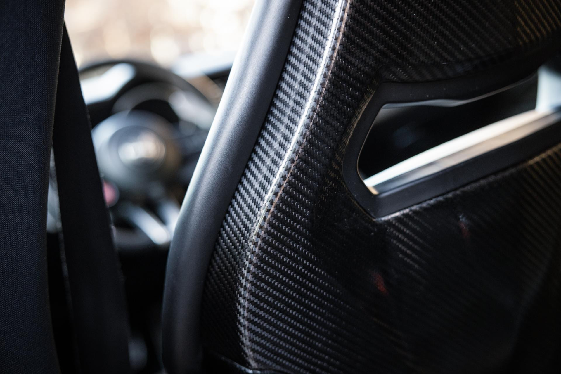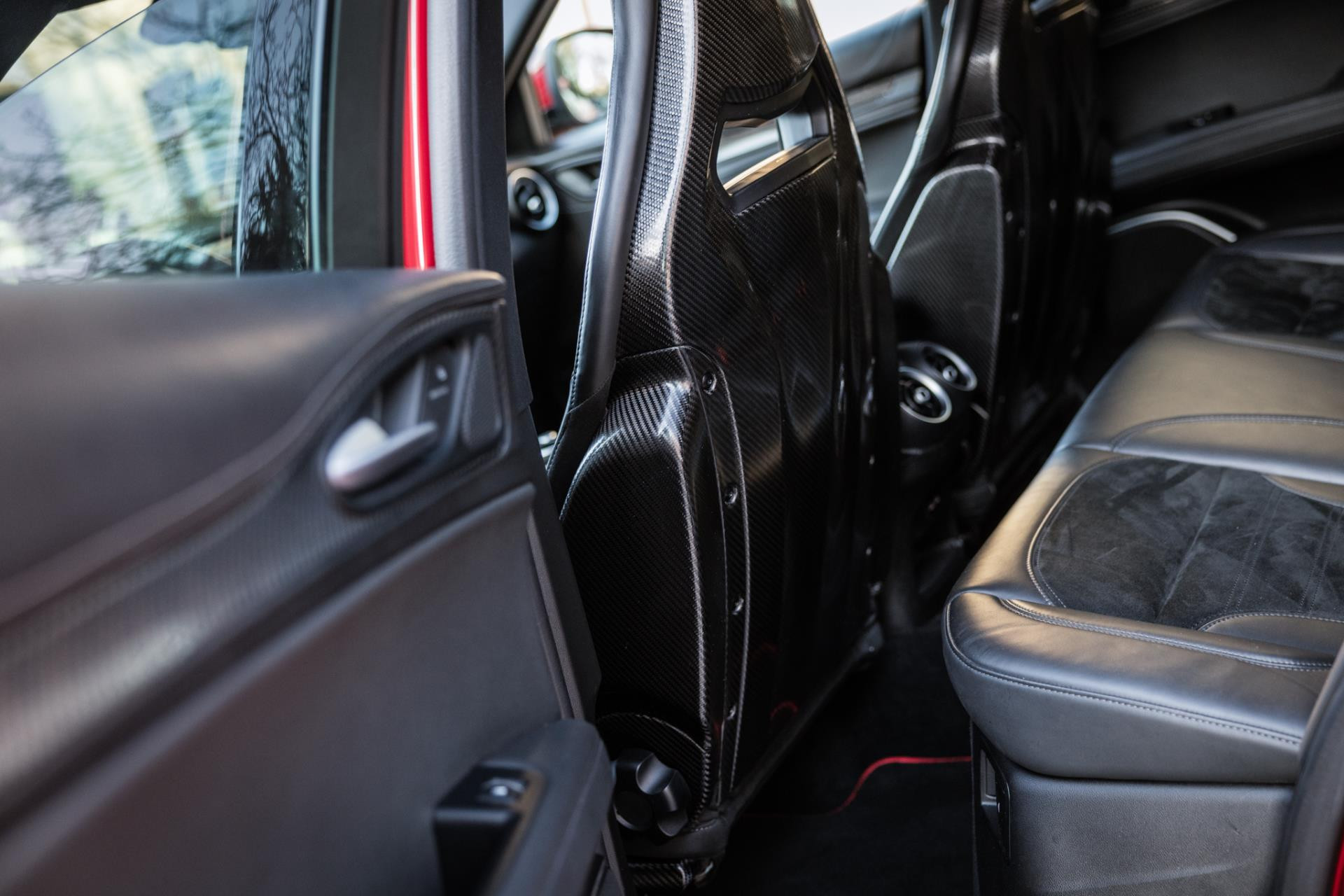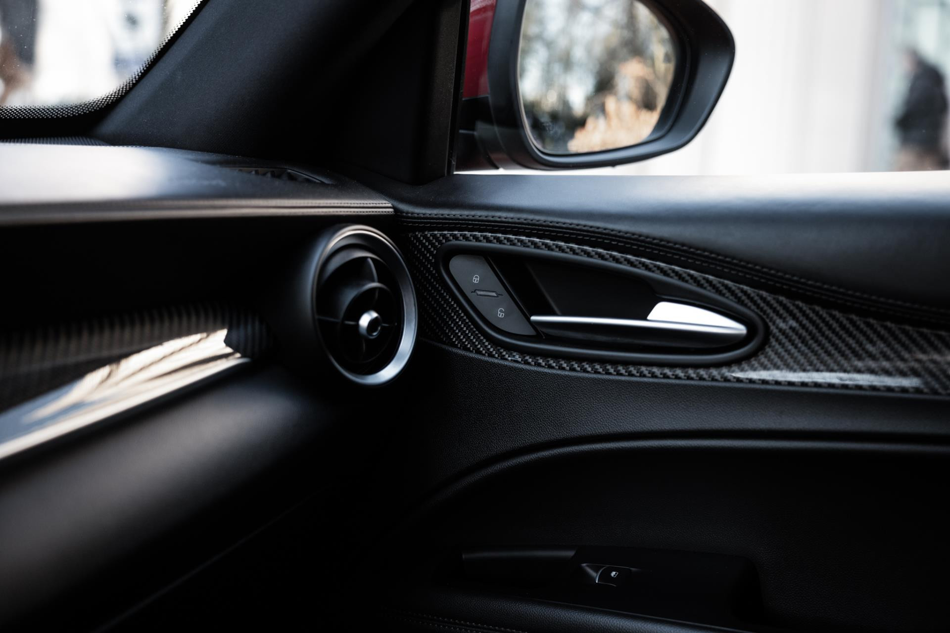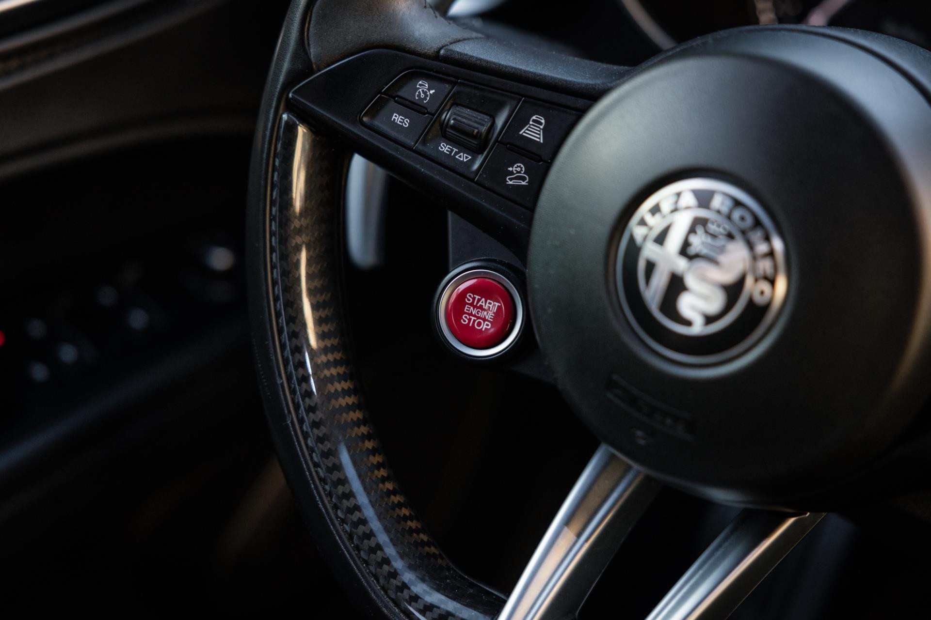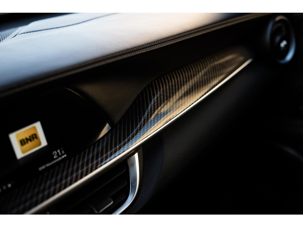 En dan het interieur. Deze Stelvio is voorzien van de zeldzame af fabriek geleverde Sparco carbon kuipstoelen. Bekleed met een dun laagje zwart leder en alcantara. Een perfecte zit met veel zijdelingse steun, maar tevens een lust voor het oog. Het is prachtig. De carbonelementen geven hem de racy uitstraling. Kijk eens naar het stuurwiel, de startknop, de uitstraling gaat perfect samen met de potentie.
