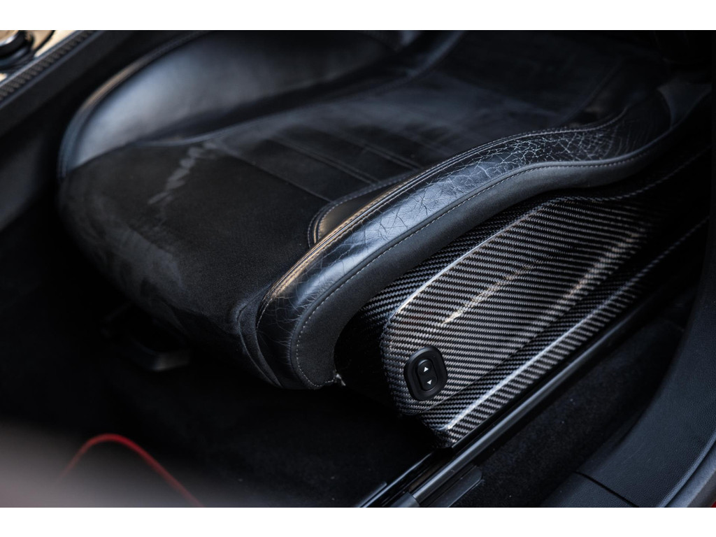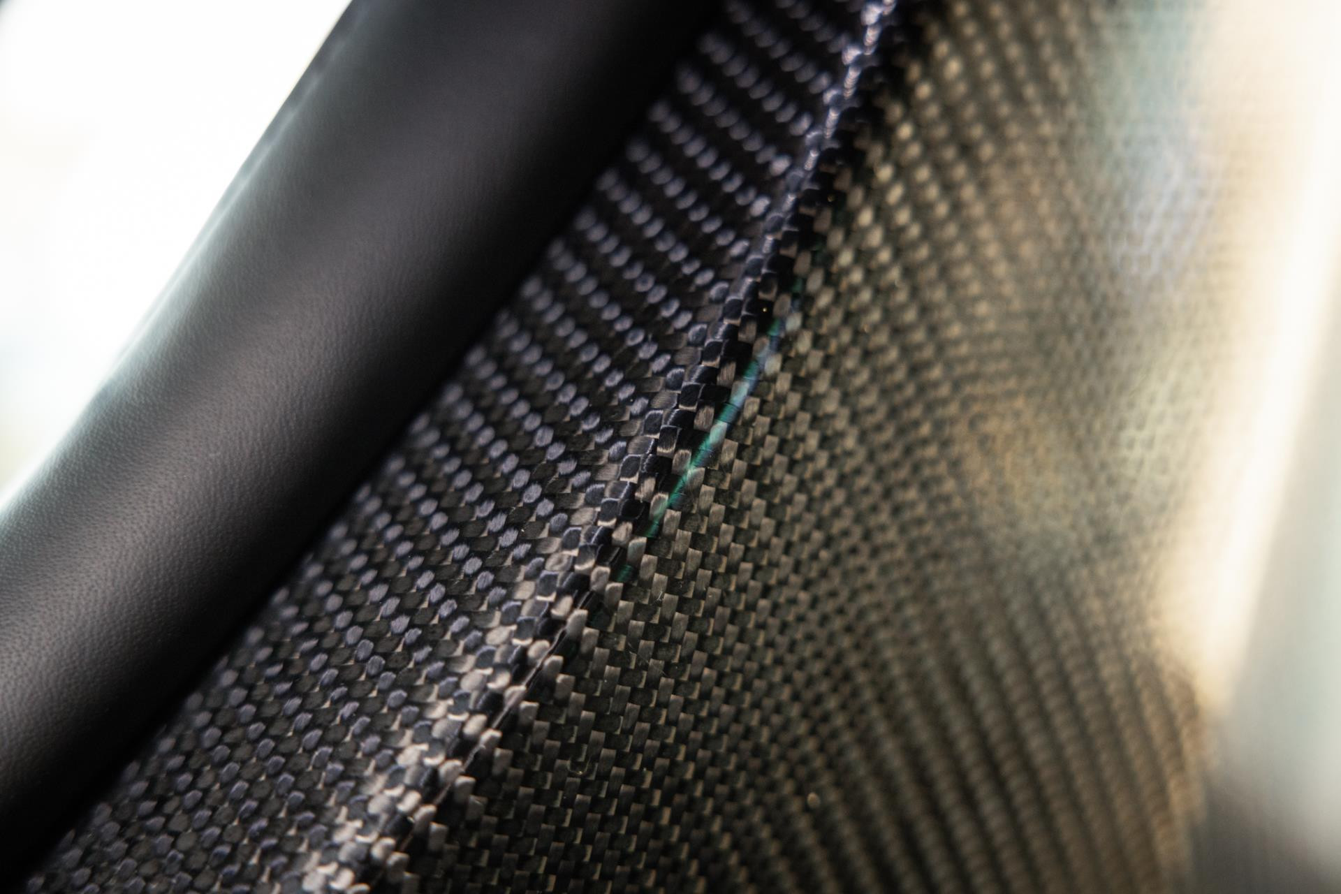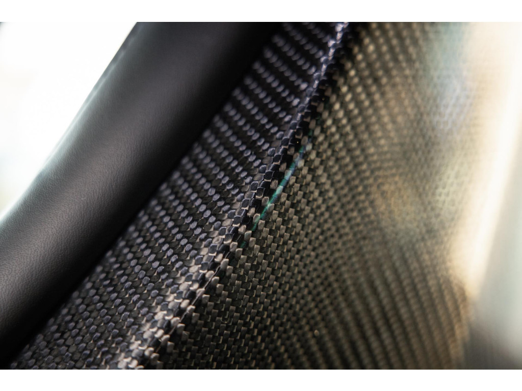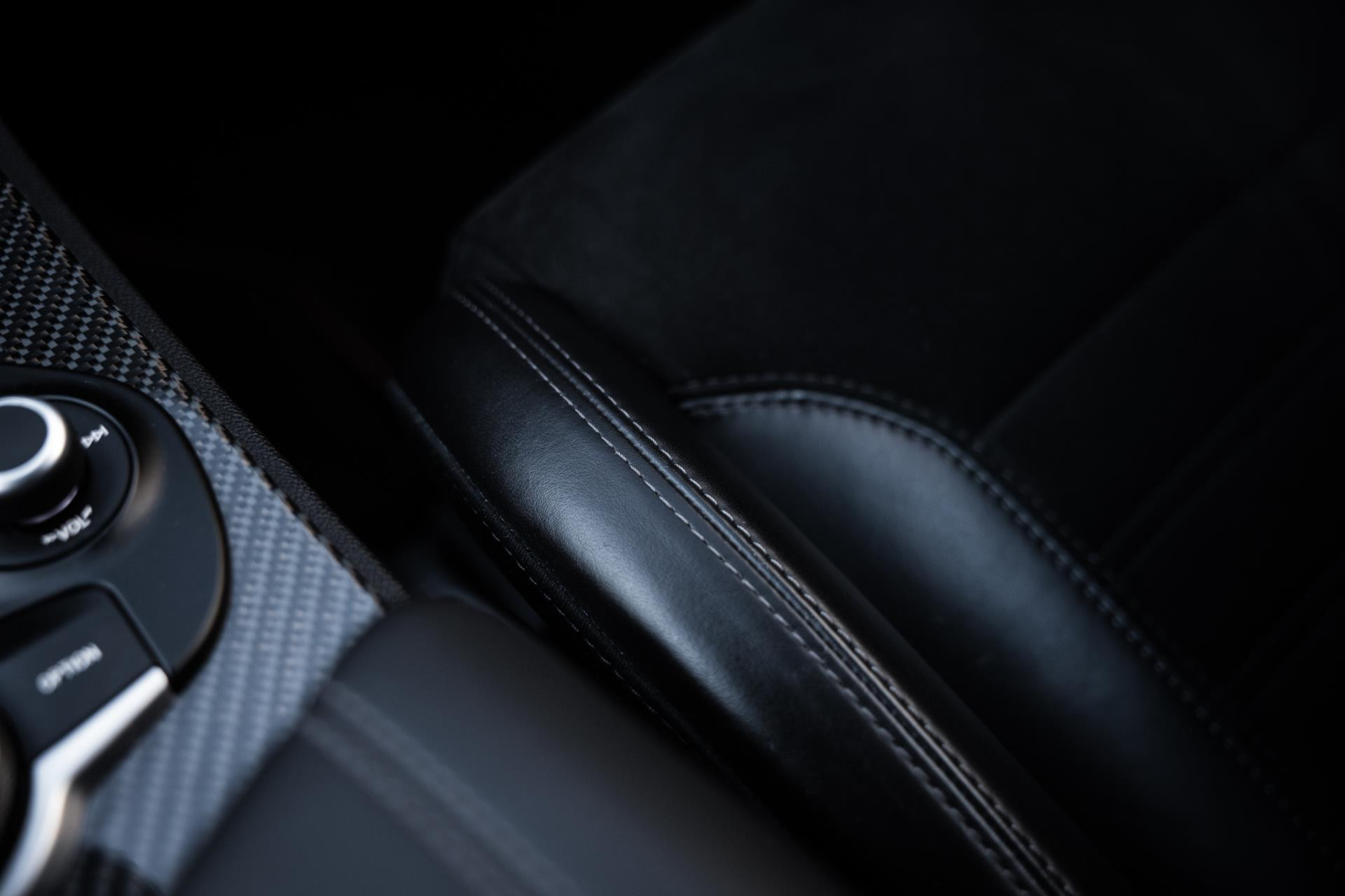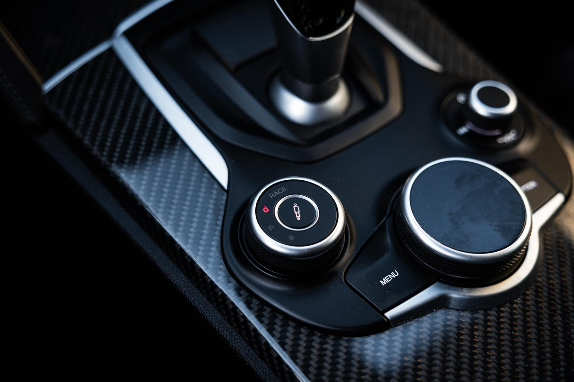En dan het interieur. Deze Stelvio is voorzien van de zeldzame af fabriek geleverde Sparco carbon kuipstoelen. Bekleed met een dun laagje zwart leder en alcantara. Een perfecte zit met veel zijdelingse steun, maar tevens een lust voor het oog. Het is prachtig. De carbonelementen geven hem de racy uitstraling. Kijk eens naar het stuurwiel, de startknop, de uitstraling gaat perfect samen met de potentie.