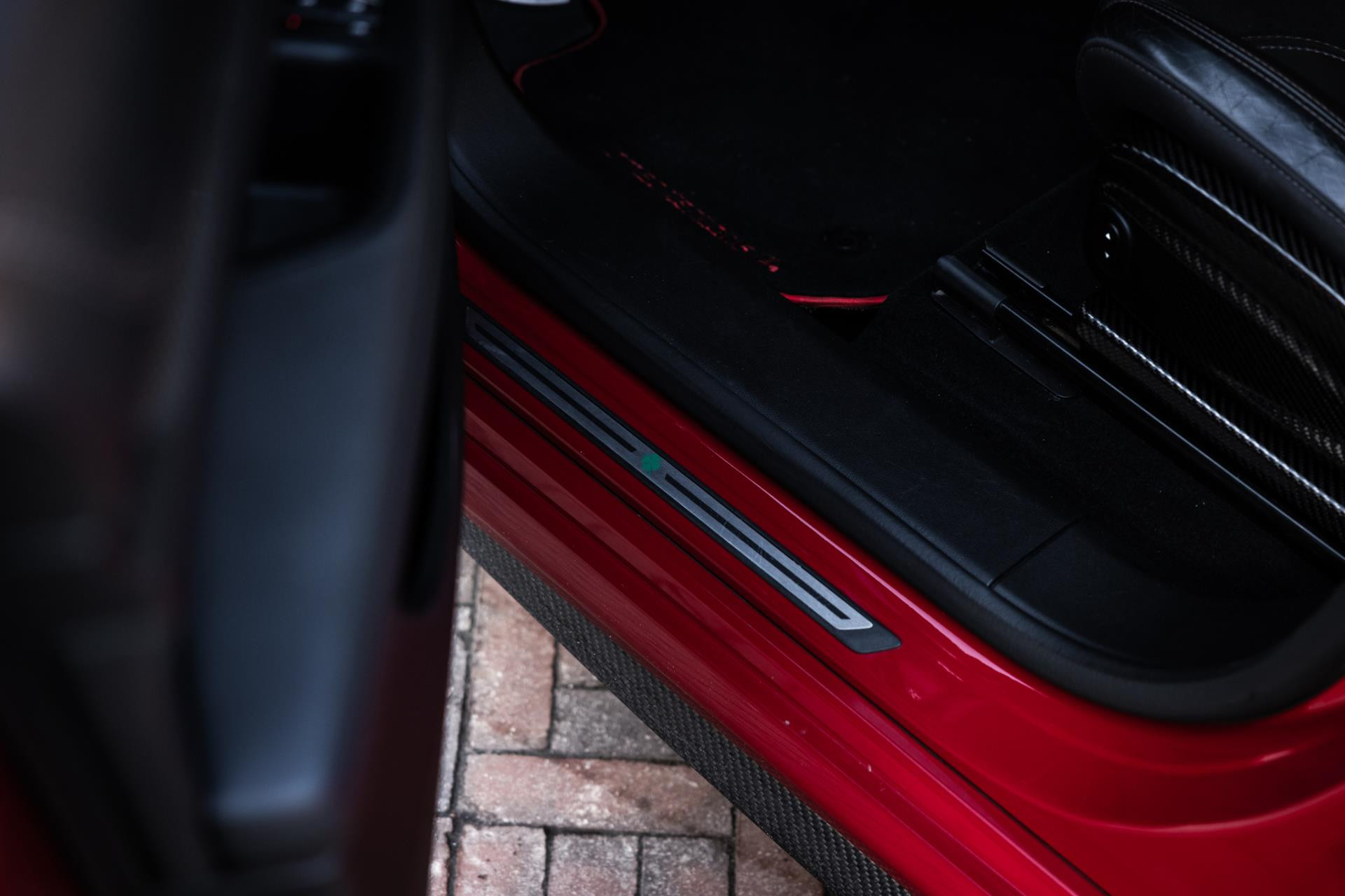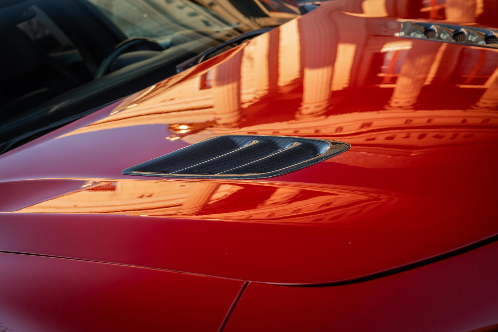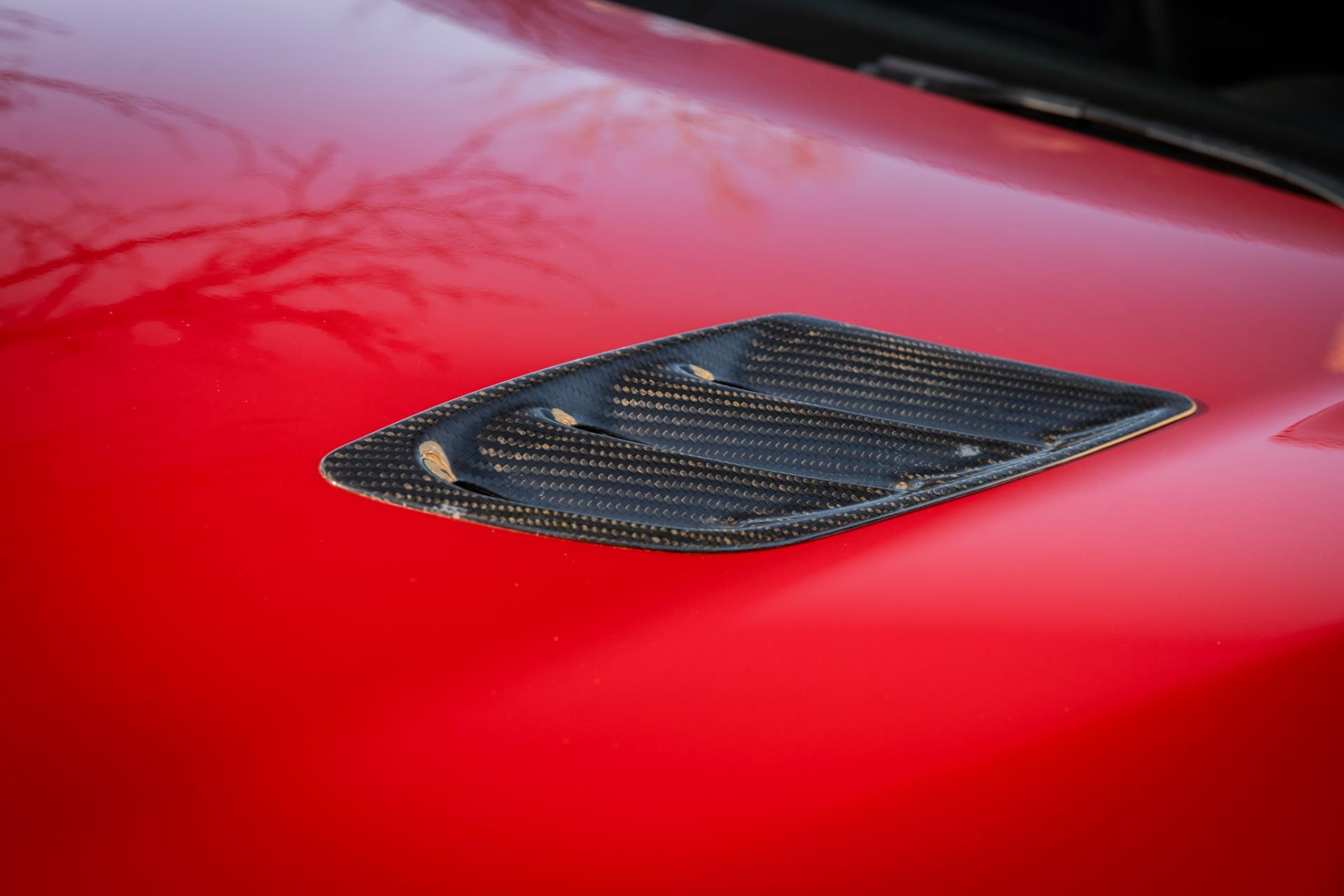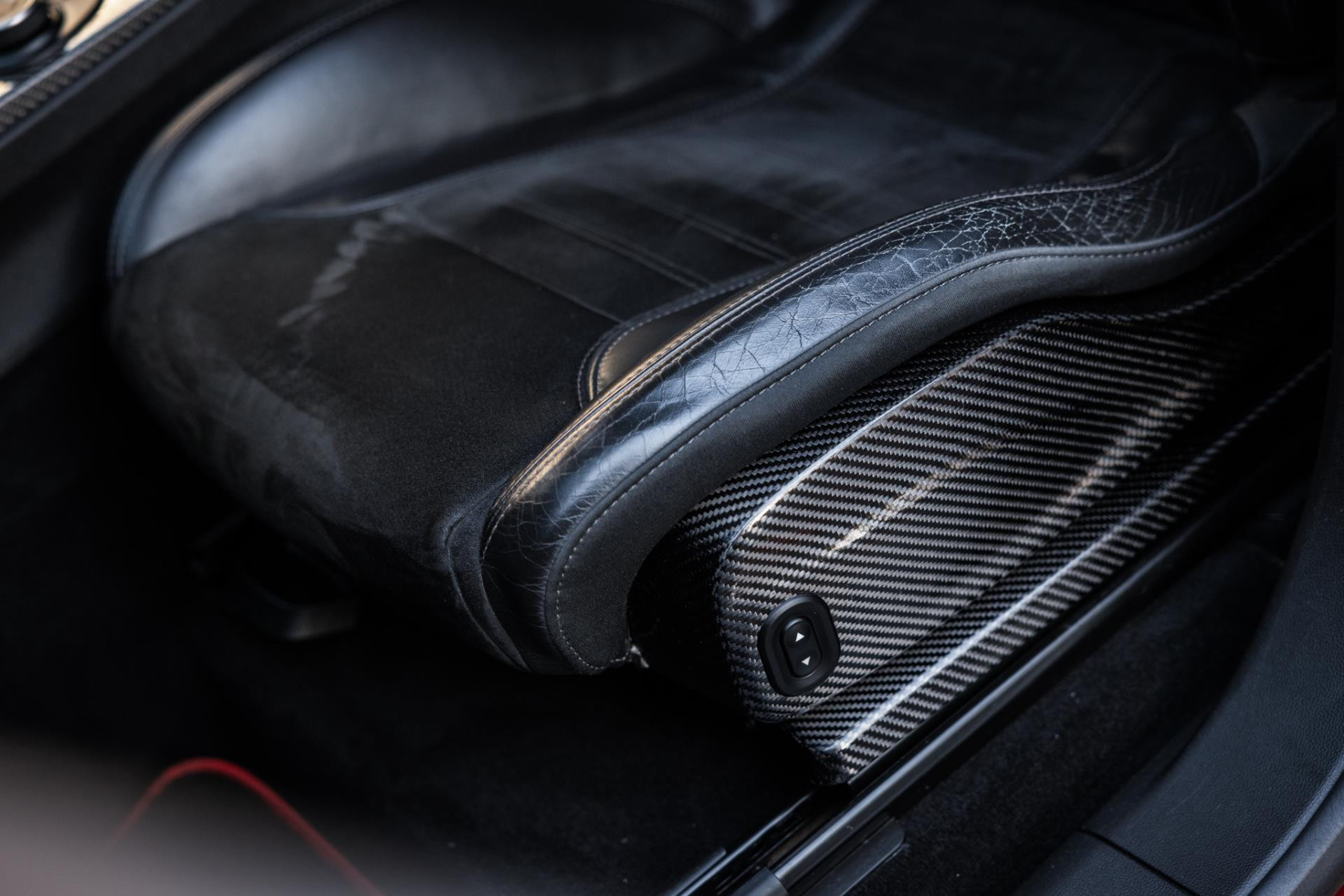 En dan het interieur. Deze Stelvio is voorzien van de zeldzame af fabriek geleverde Sparco carbon kuipstoelen. Bekleed met een dun laagje zwart leder en alcantara. Een perfecte zit met veel zijdelingse steun, maar tevens een lust voor het oog. Het is prachtig. De carbonelementen geven hem de racy uitstraling. Kijk eens naar het stuurwiel, de startknop, de uitstraling gaat perfect samen met de potentie.