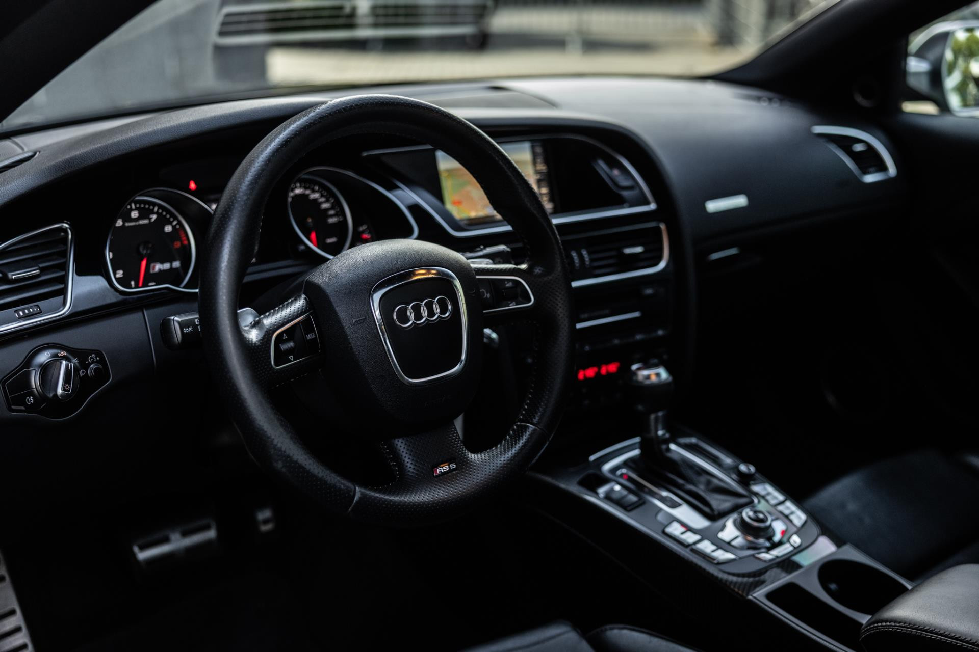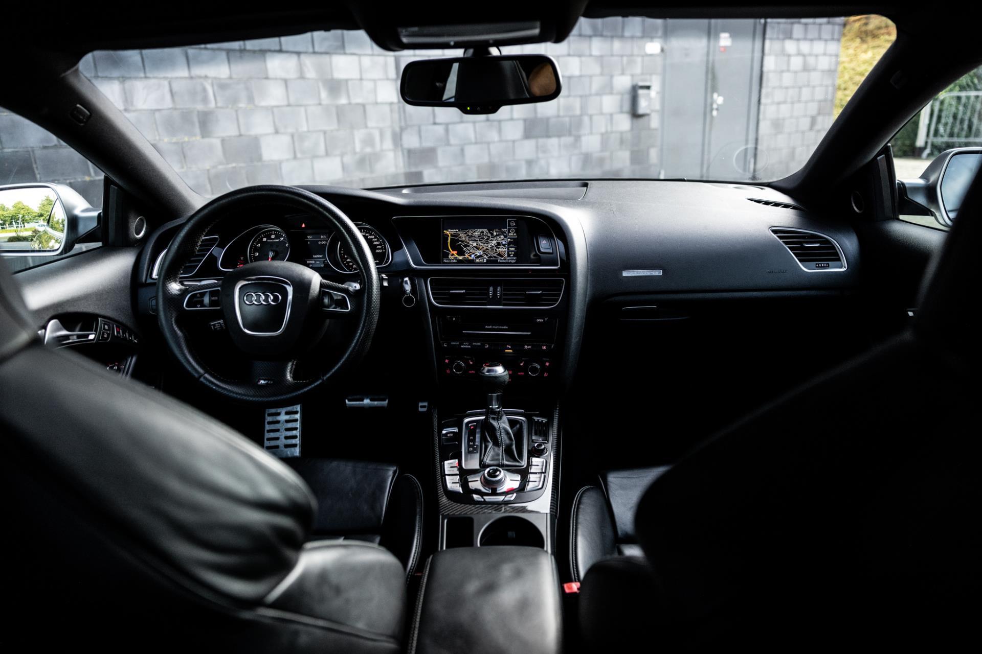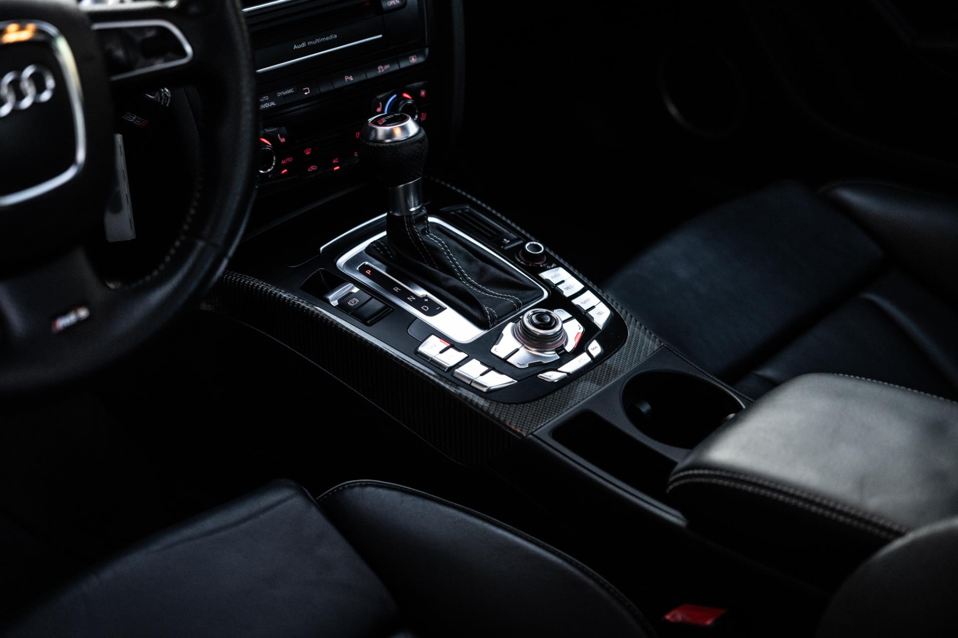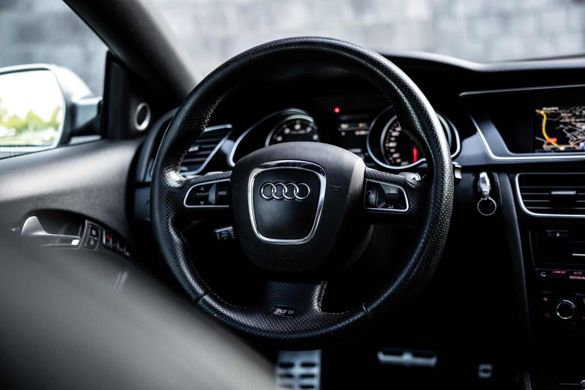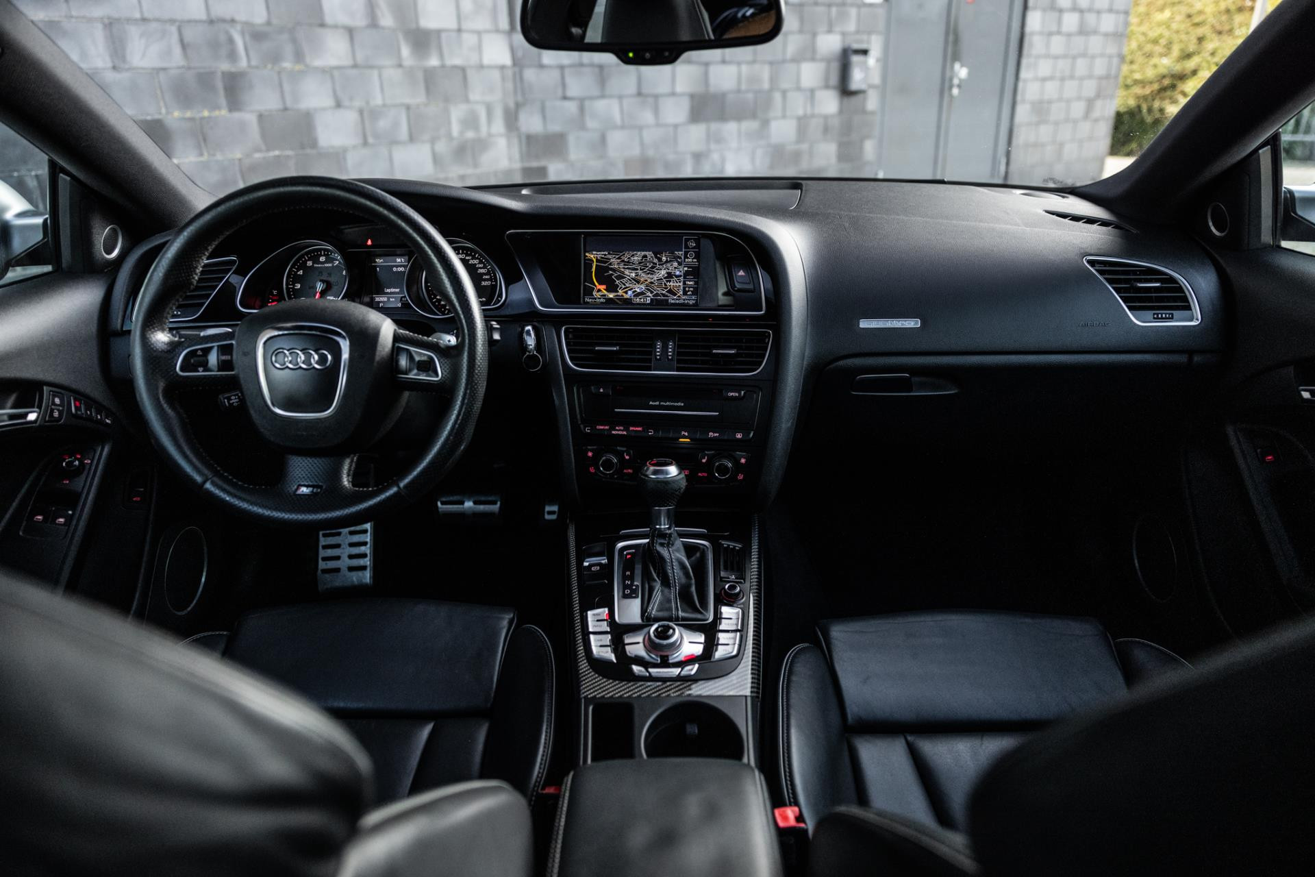 Rustig brengen we de 4.2 FSI op bedrijfstemperatuur. Alles ademt sportiviteit in de RS5. De carbon sierlijst, het RS sportstuurwiel met geperforeerd leder en de voortreffelijke S sportstoelen bekleed in Nappa leder en voorzien van elektrische stoelverstelling met memory en stoelverwarming. Dit exemplaar staat op de 20” originele Audi Rotor velgen met vrijwel nieuwe banden. Belangrijke optie is het Audi Drive Select systeem. Hiermee zijn de dempers elektronisch instelbaar en adaptief.