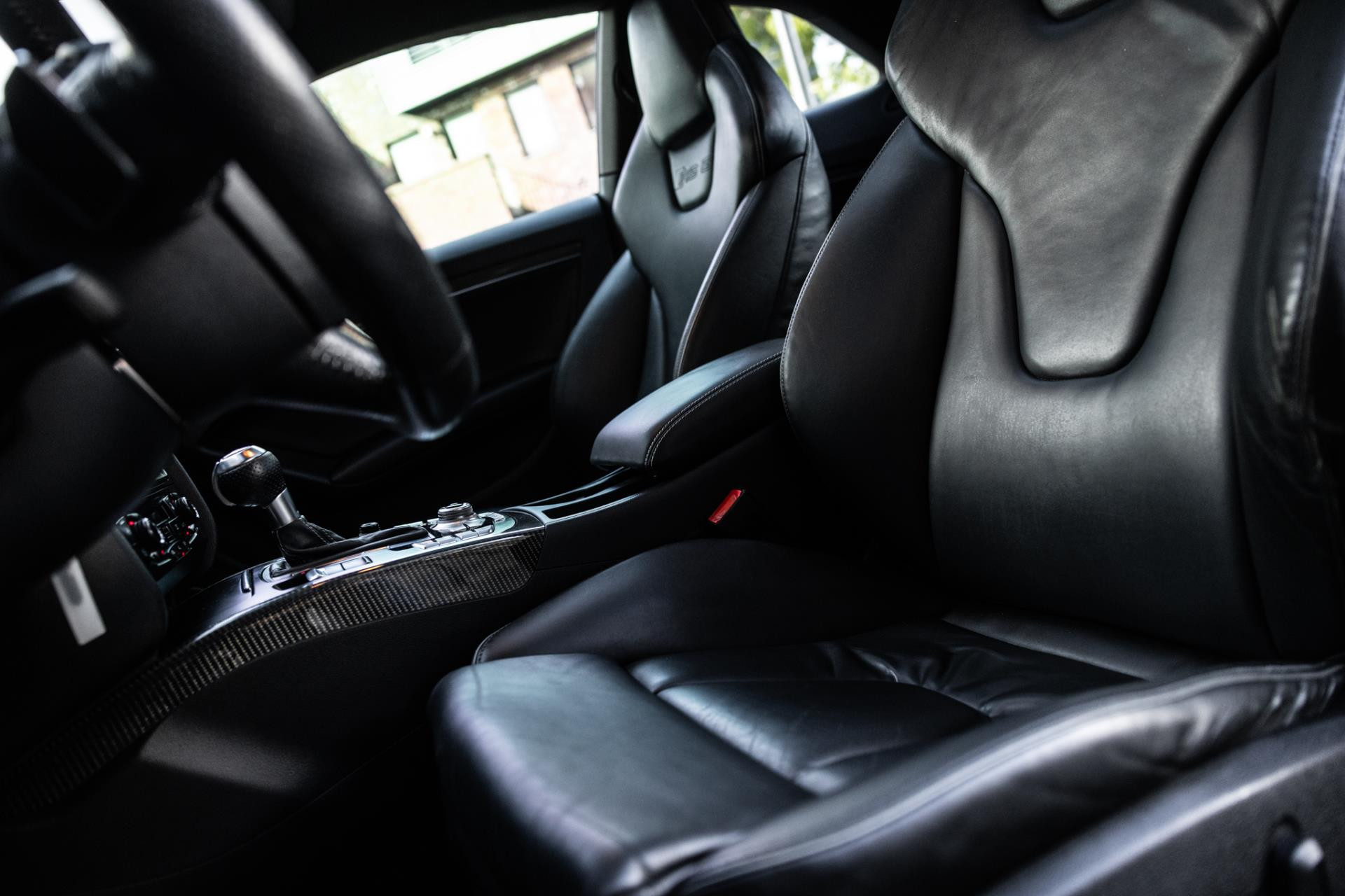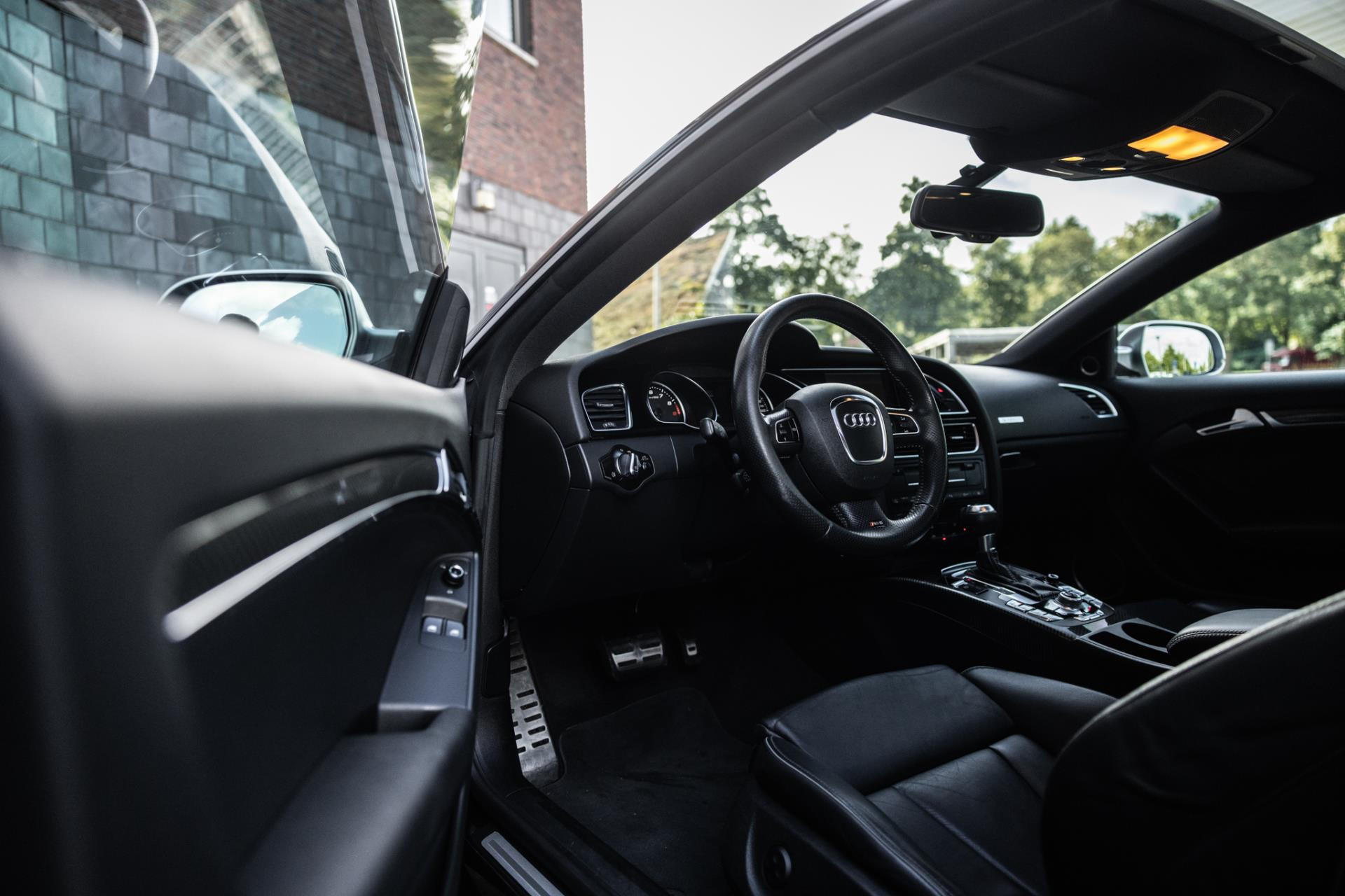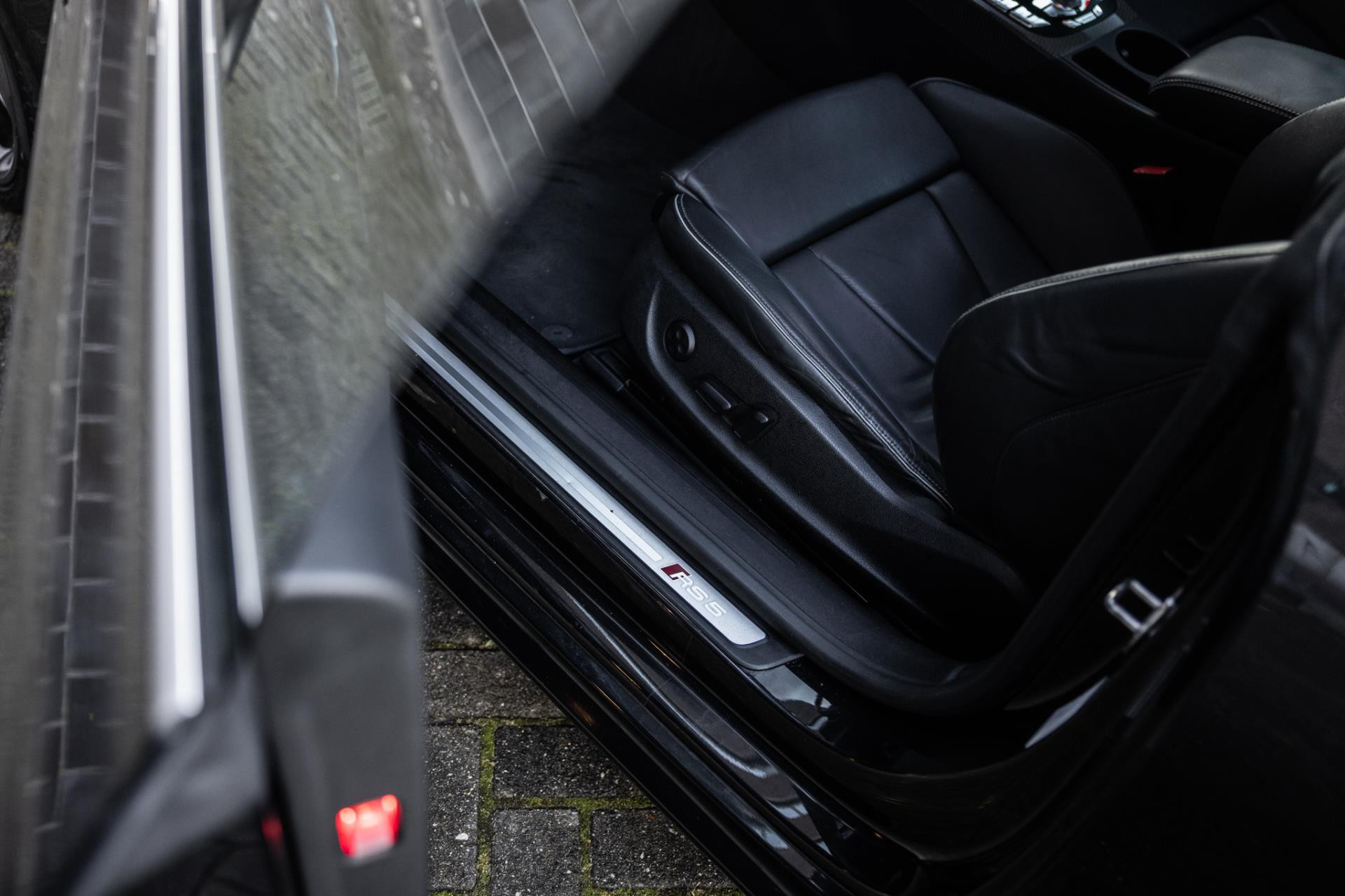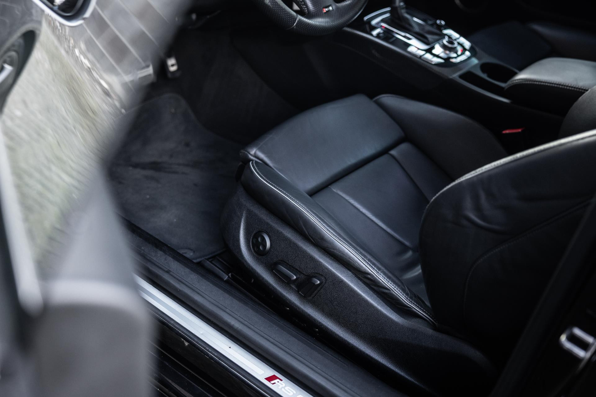 Rustig brengen we de 4.2 FSI op bedrijfstemperatuur. Alles ademt sportiviteit in de RS5. De carbon sierlijst, het RS sportstuurwiel met geperforeerd leder en de voortreffelijke S sportstoelen bekleed in Nappa leder en voorzien van elektrische stoelverstelling met memory en stoelverwarming. Dit exemplaar staat op de 20” originele Audi Rotor velgen met vrijwel nieuwe banden. Belangrijke optie is het Audi Drive Select systeem. Hiermee zijn de dempers elektronisch instelbaar en adaptief.