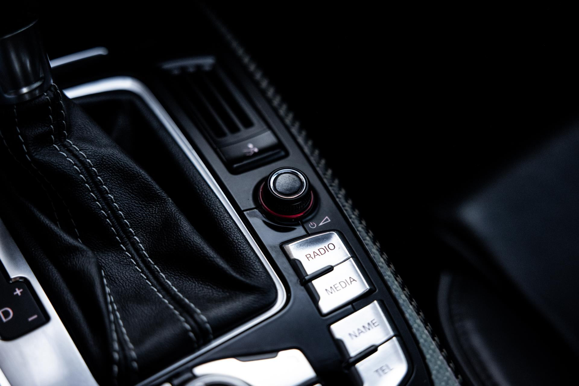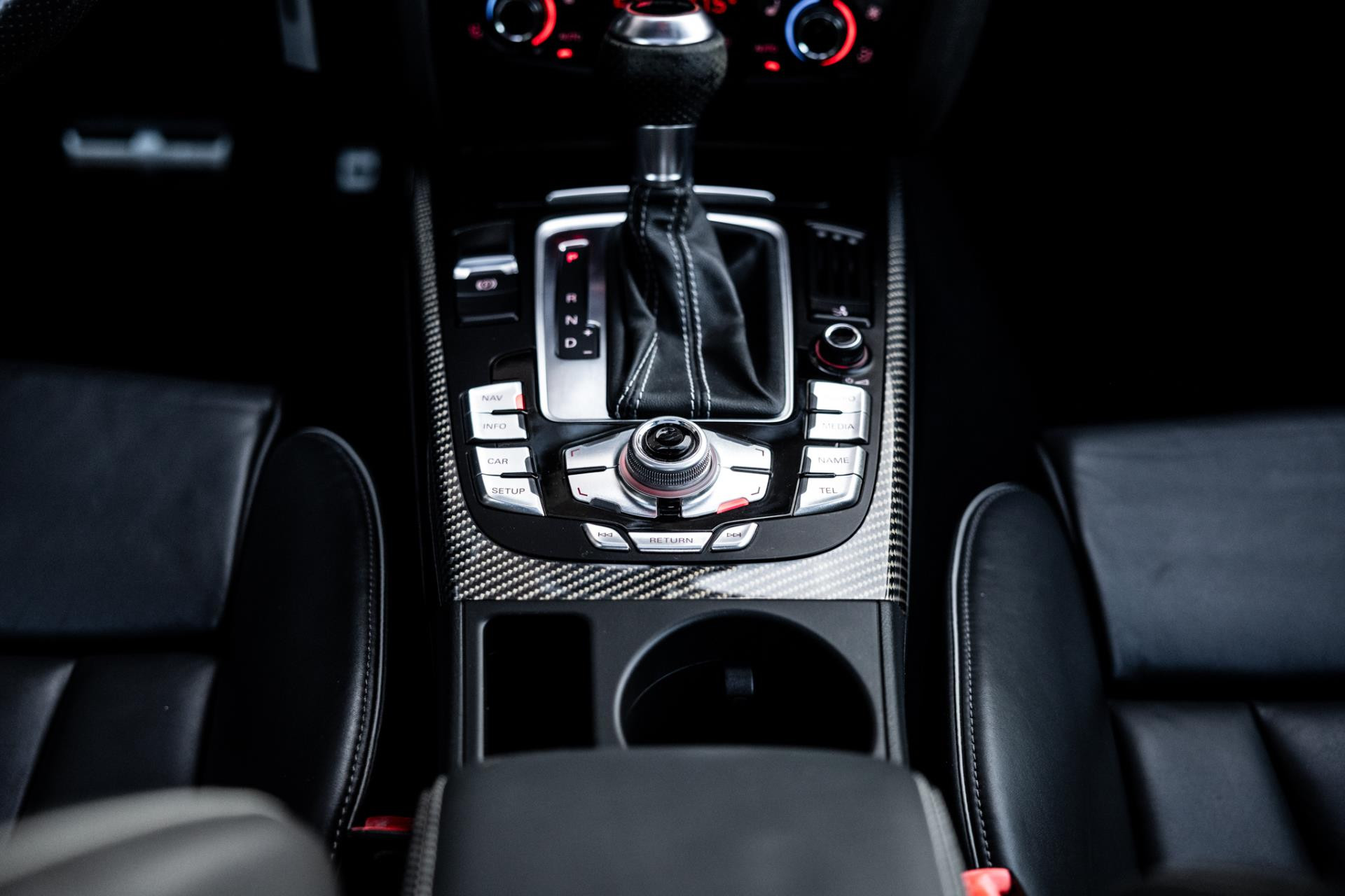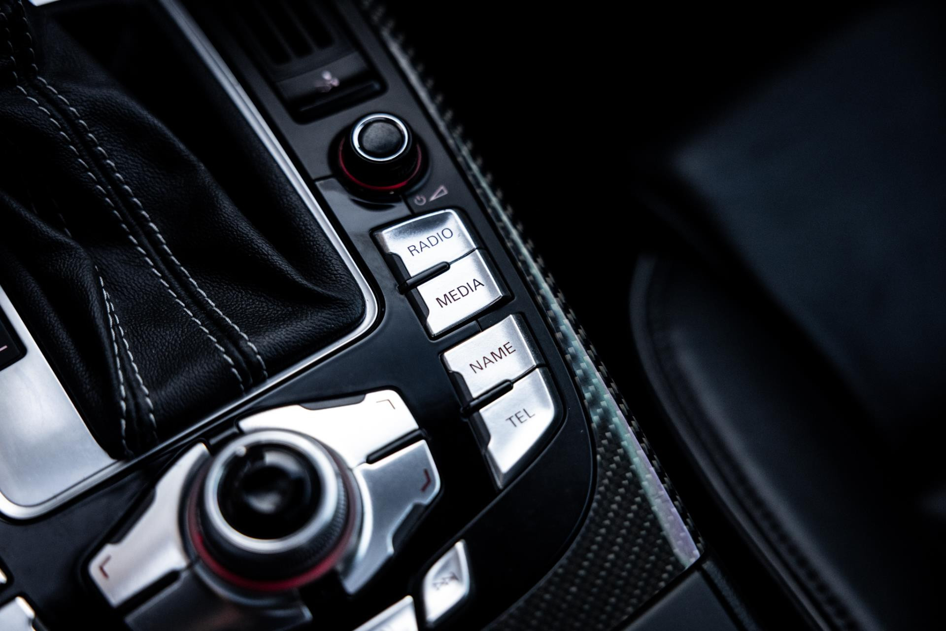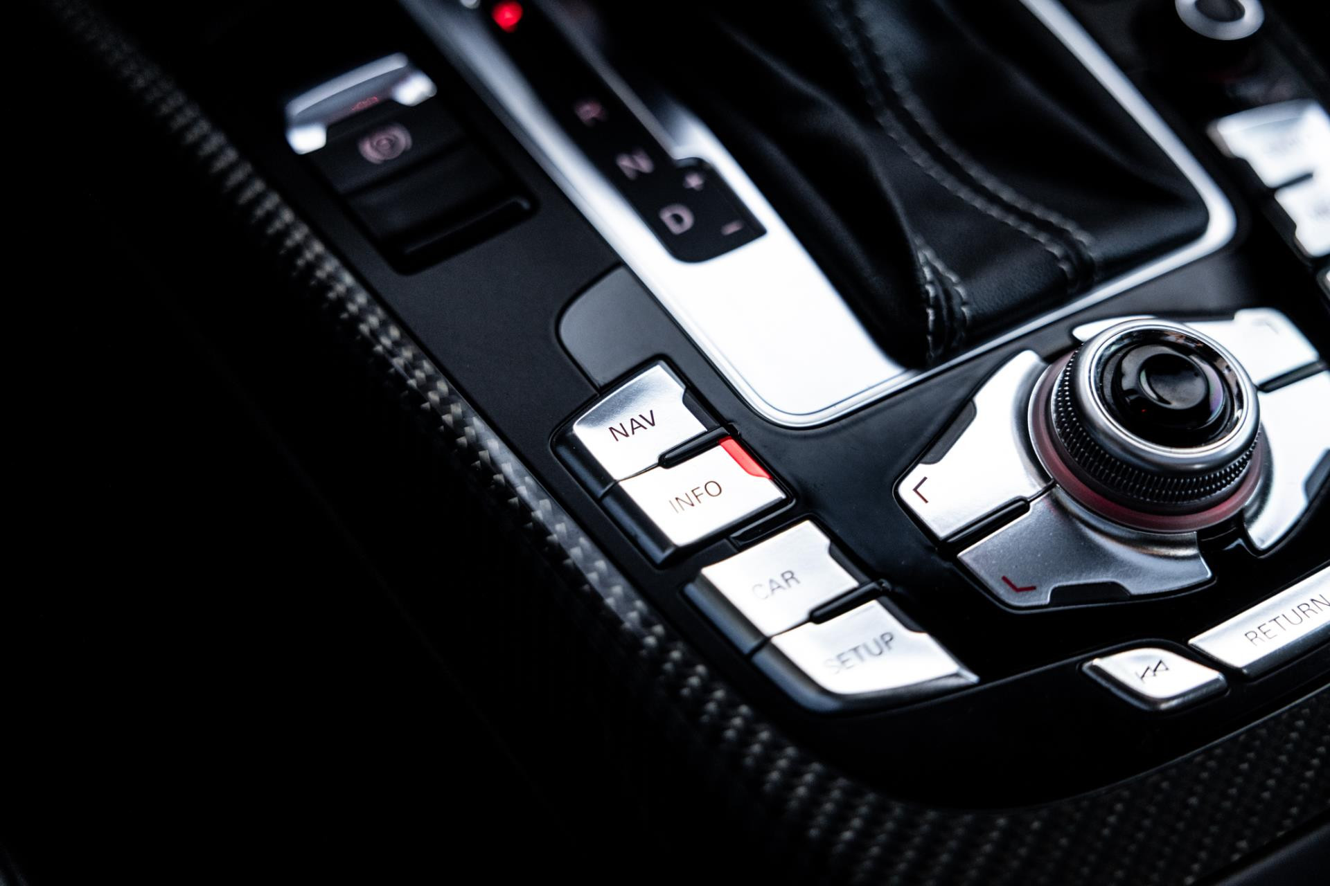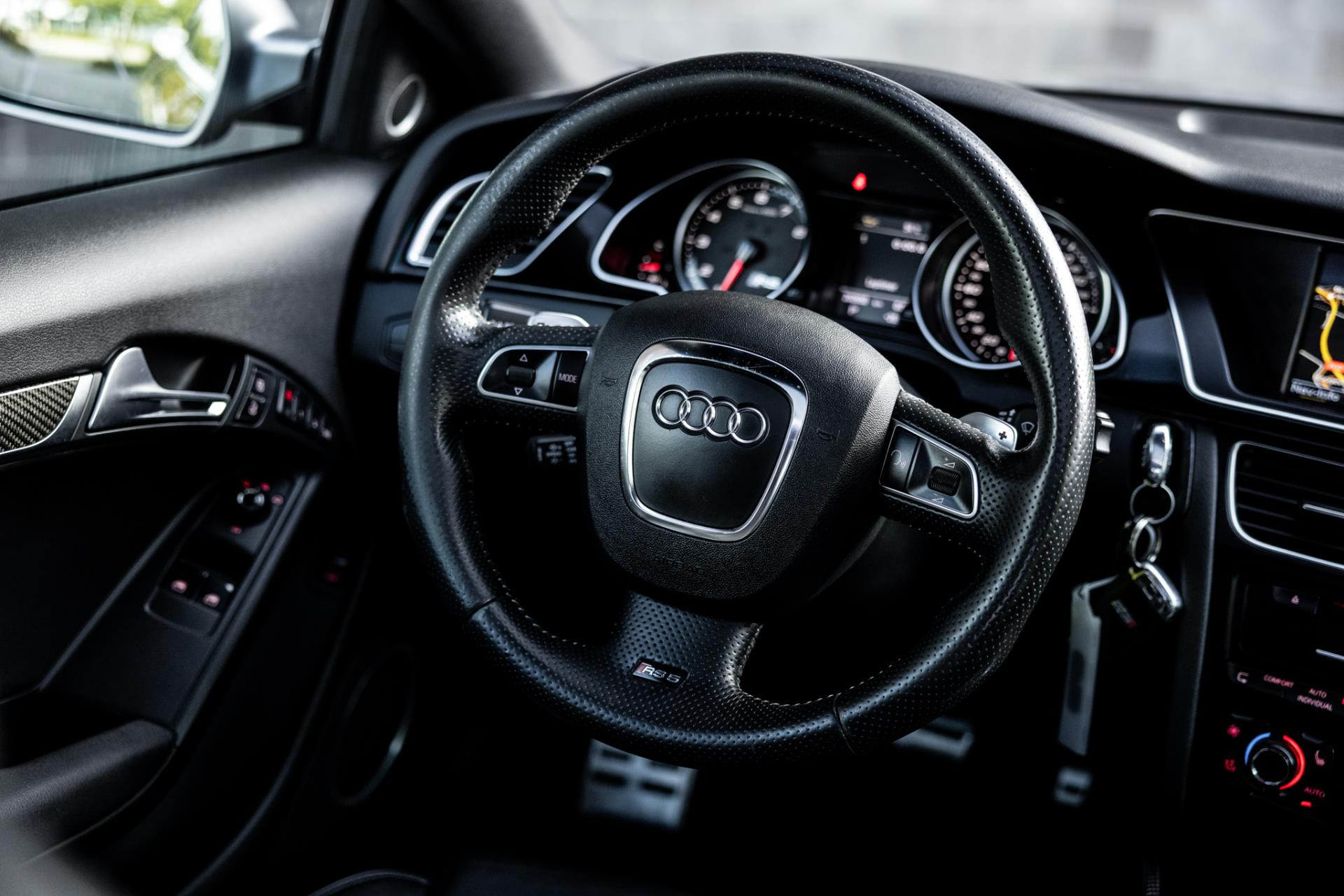 Rustig brengen we de 4.2 FSI op bedrijfstemperatuur. Alles ademt sportiviteit in de RS5. De carbon sierlijst, het RS sportstuurwiel met geperforeerd leder en de voortreffelijke S sportstoelen bekleed in Nappa leder en voorzien van elektrische stoelverstelling met memory en stoelverwarming. Dit exemplaar staat op de 20” originele Audi Rotor velgen met vrijwel nieuwe banden. Belangrijke optie is het Audi Drive Select systeem. Hiermee zijn de dempers elektronisch instelbaar en adaptief.