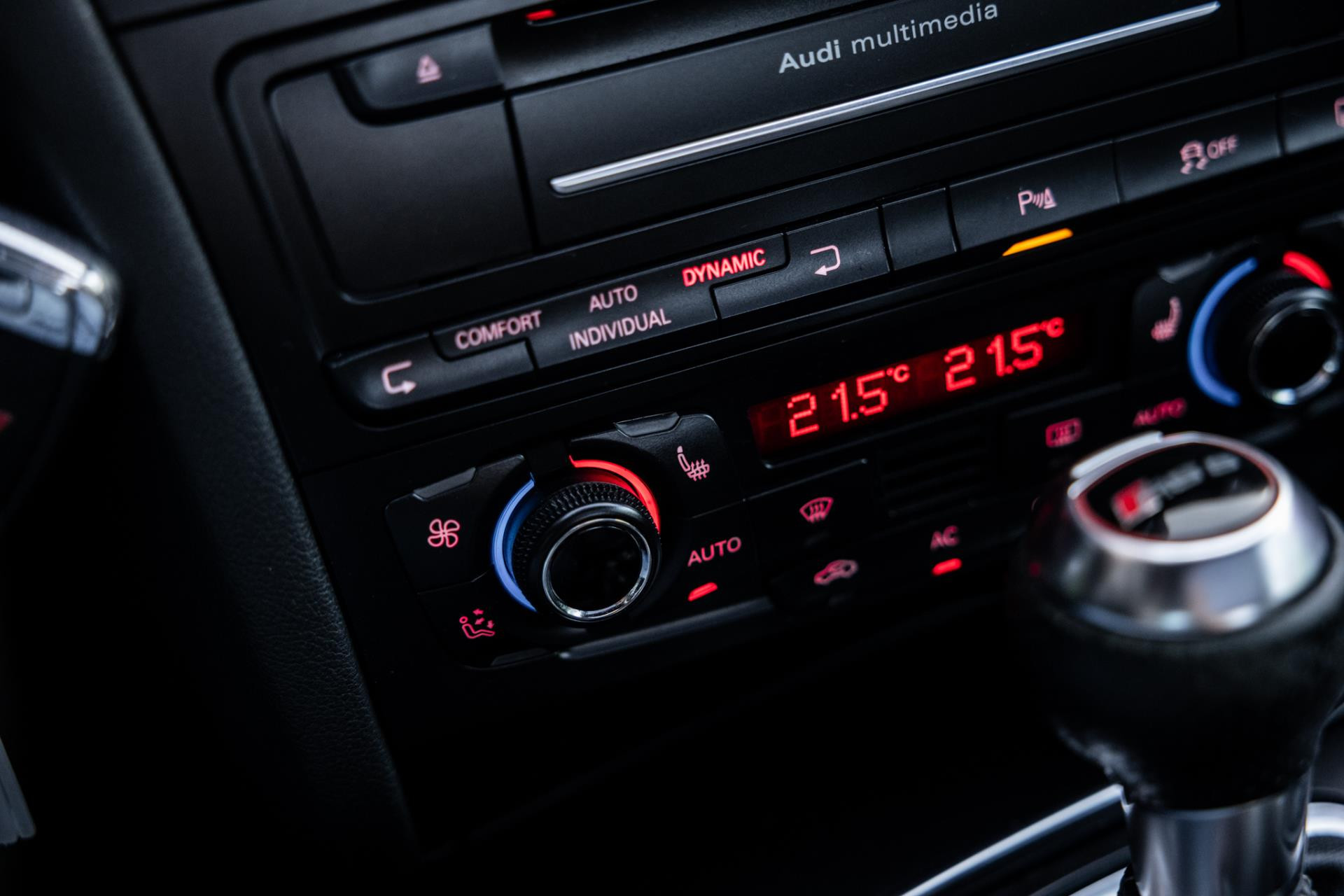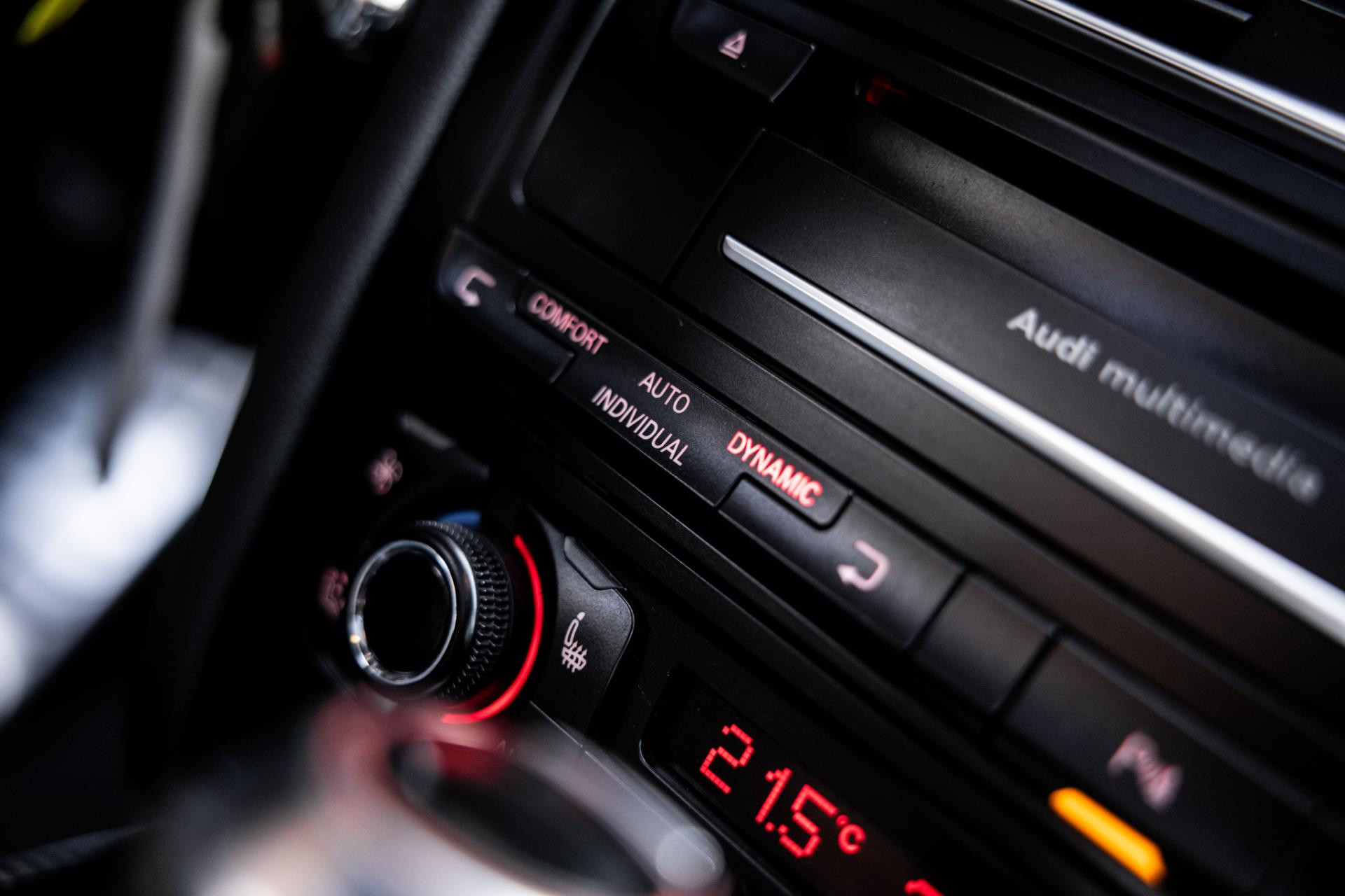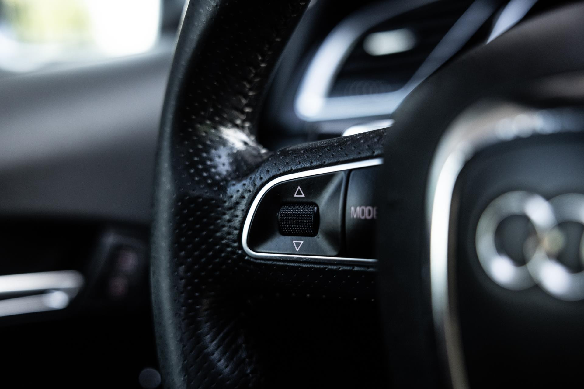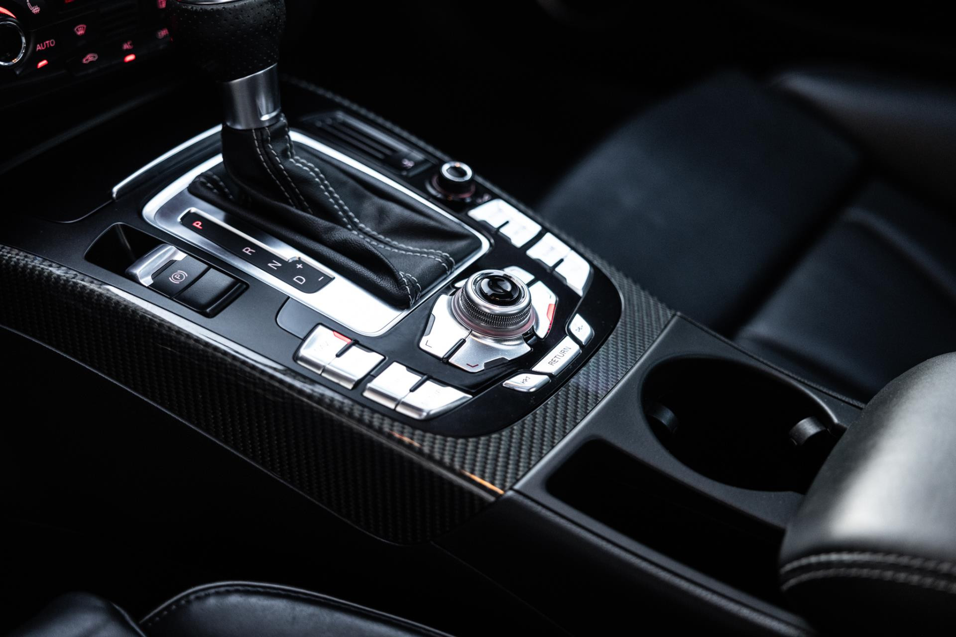 Rustig brengen we de 4.2 FSI op bedrijfstemperatuur. Alles ademt sportiviteit in de RS5. De carbon sierlijst, het RS sportstuurwiel met geperforeerd leder en de voortreffelijke S sportstoelen bekleed in Nappa leder en voorzien van elektrische stoelverstelling met memory en stoelverwarming. Dit exemplaar staat op de 20” originele Audi Rotor velgen met vrijwel nieuwe banden. Belangrijke optie is het Audi Drive Select systeem. Hiermee zijn de dempers elektronisch instelbaar en adaptief.
