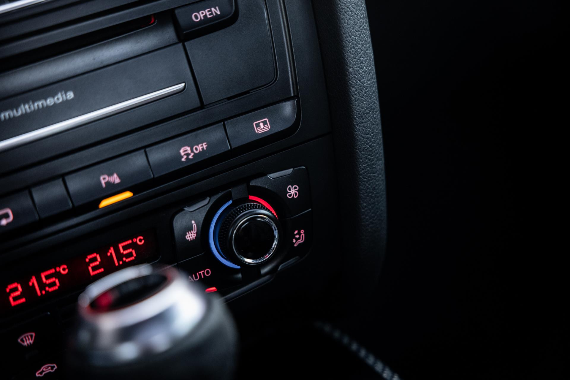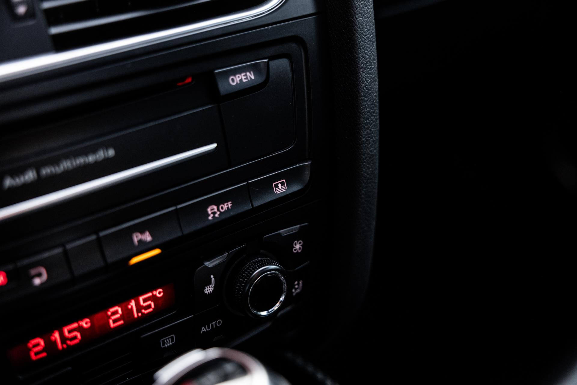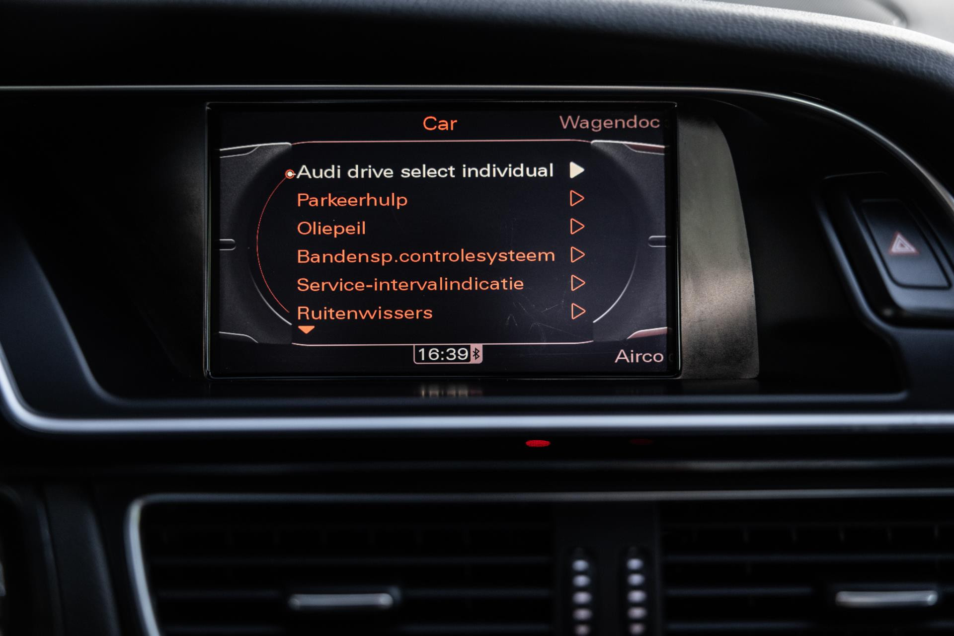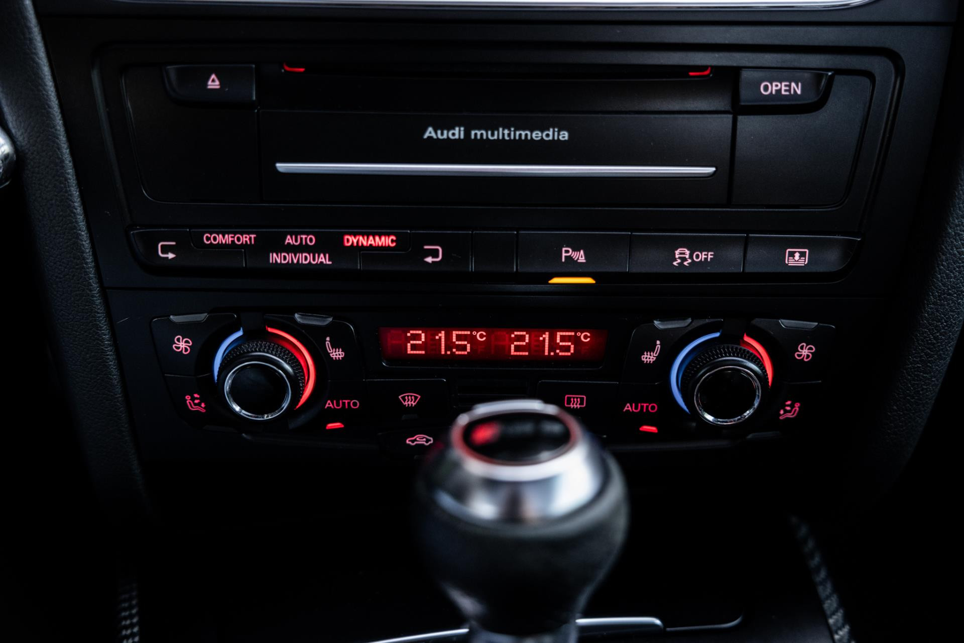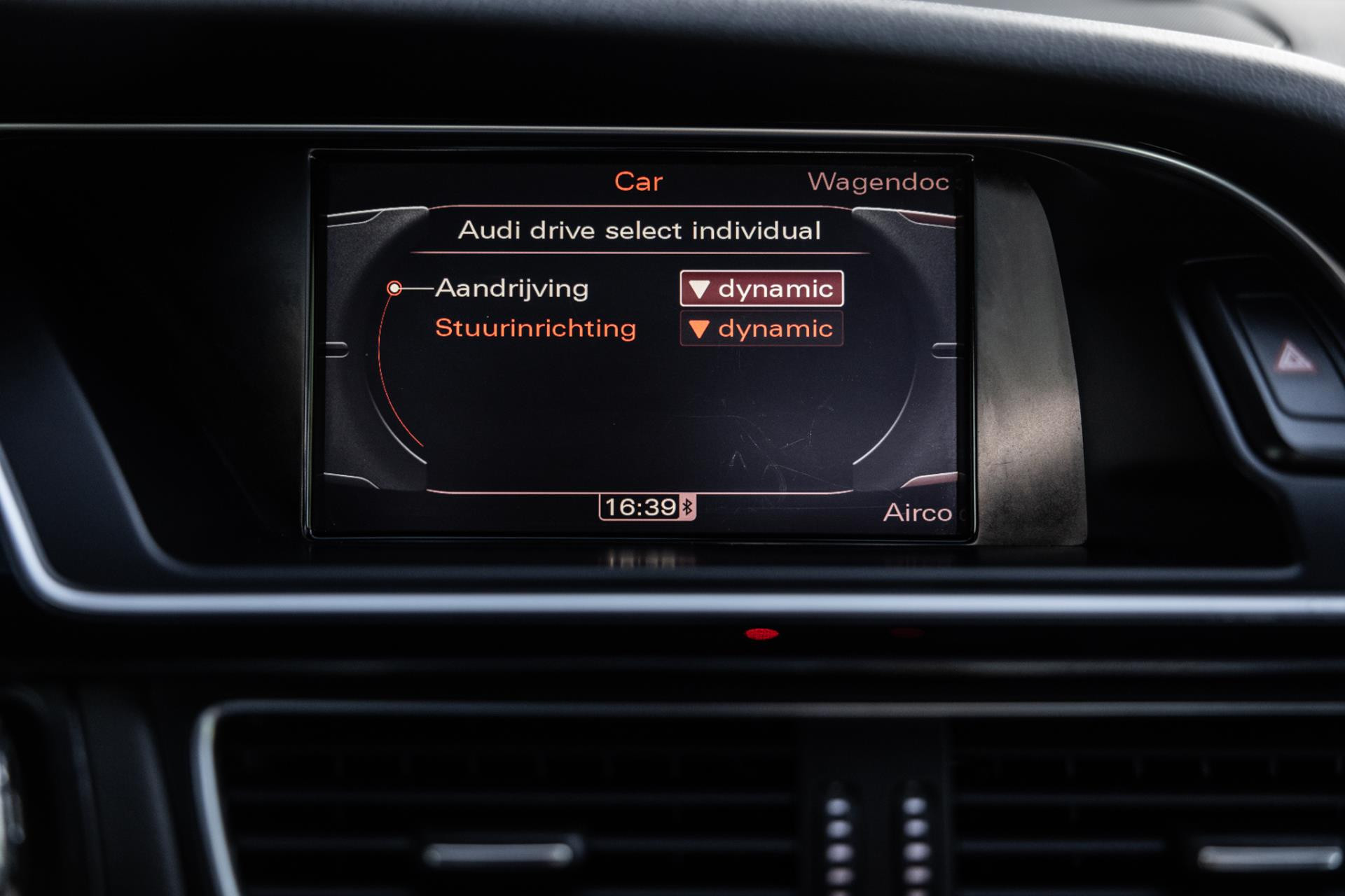 Rustig brengen we de 4.2 FSI op bedrijfstemperatuur. Alles ademt sportiviteit in de RS5. De carbon sierlijst, het RS sportstuurwiel met geperforeerd leder en de voortreffelijke S sportstoelen bekleed in Nappa leder en voorzien van elektrische stoelverstelling met memory en stoelverwarming. Dit exemplaar staat op de 20” originele Audi Rotor velgen met vrijwel nieuwe banden. Belangrijke optie is het Audi Drive Select systeem. Hiermee zijn de dempers elektronisch instelbaar en adaptief.