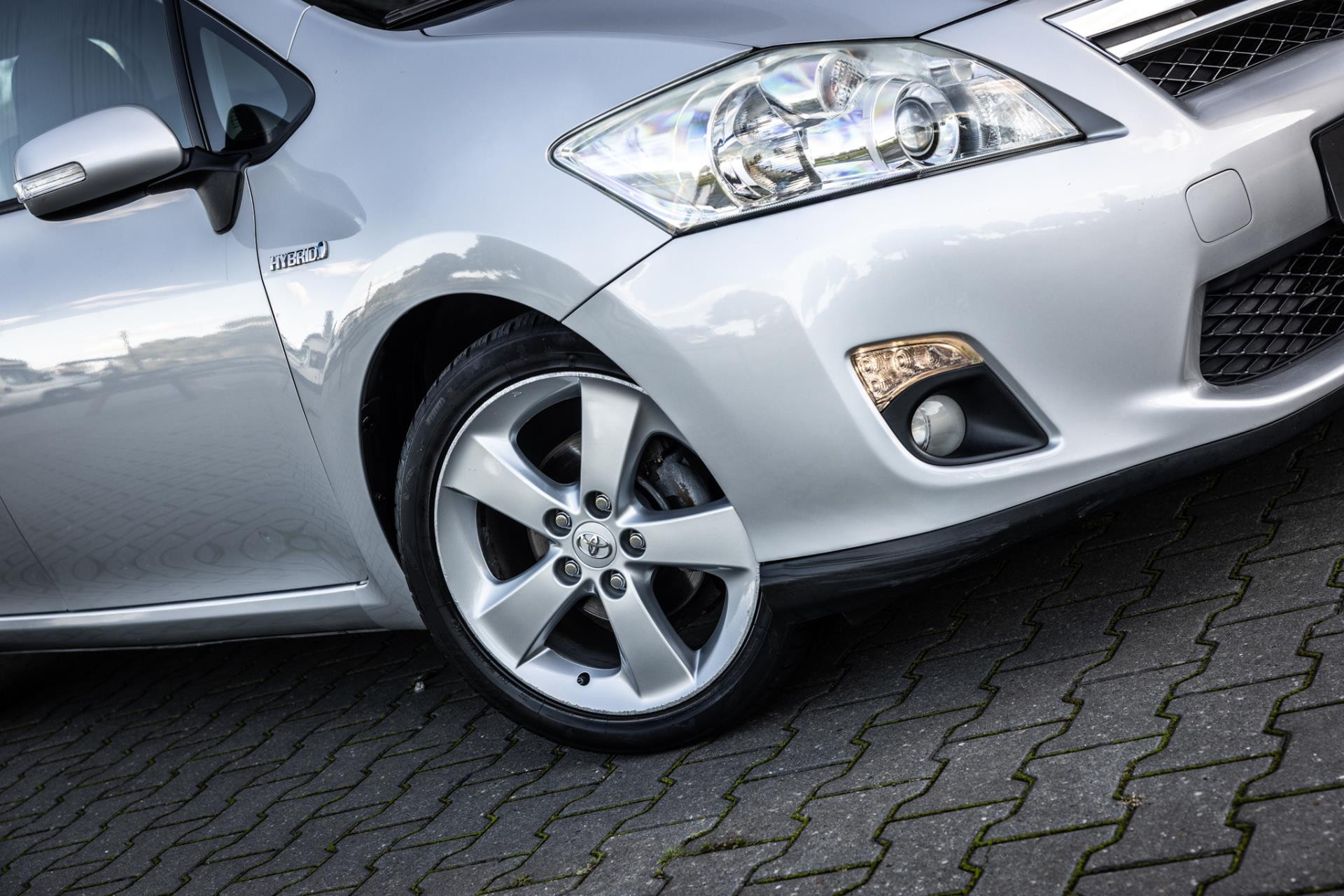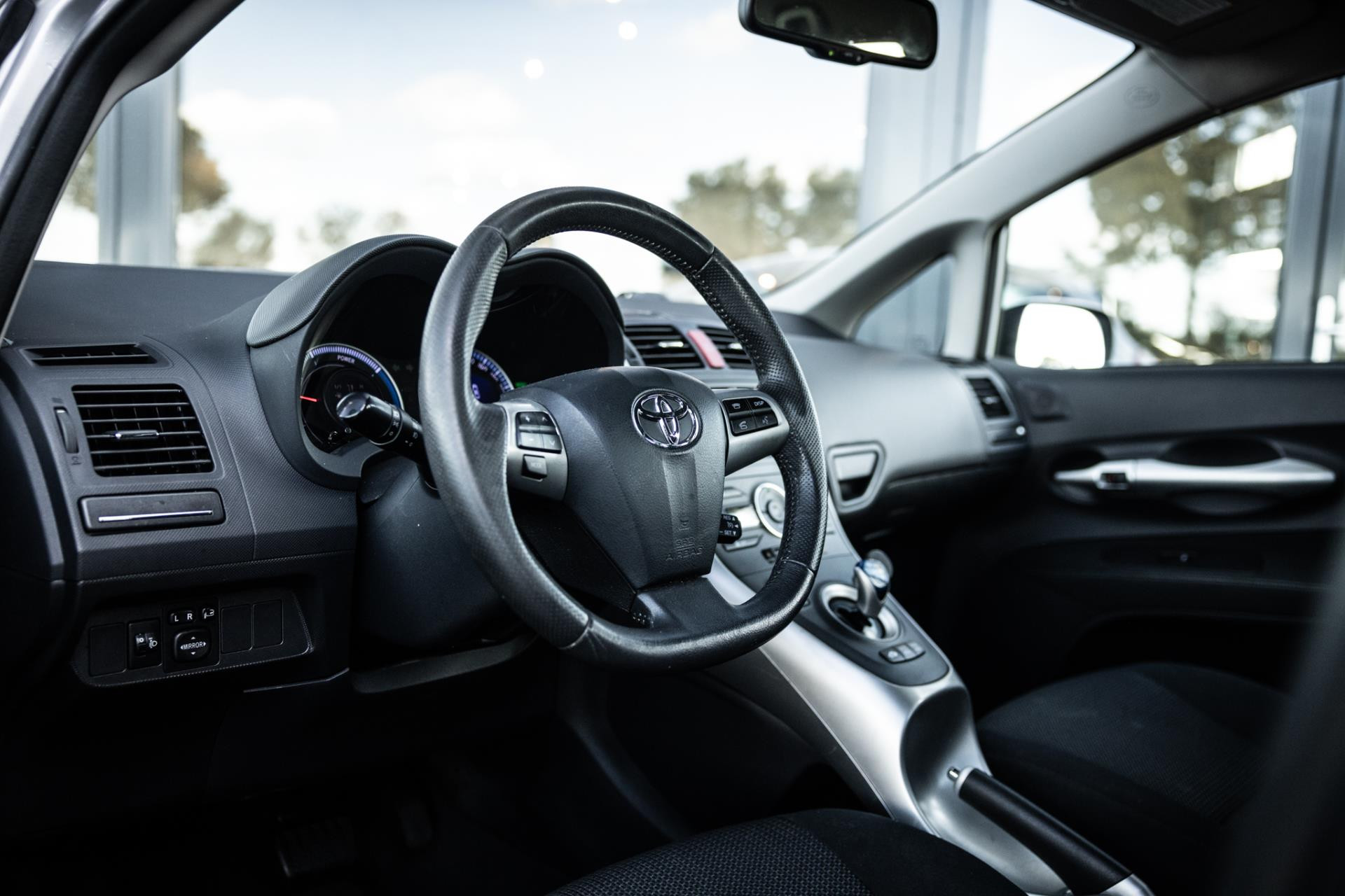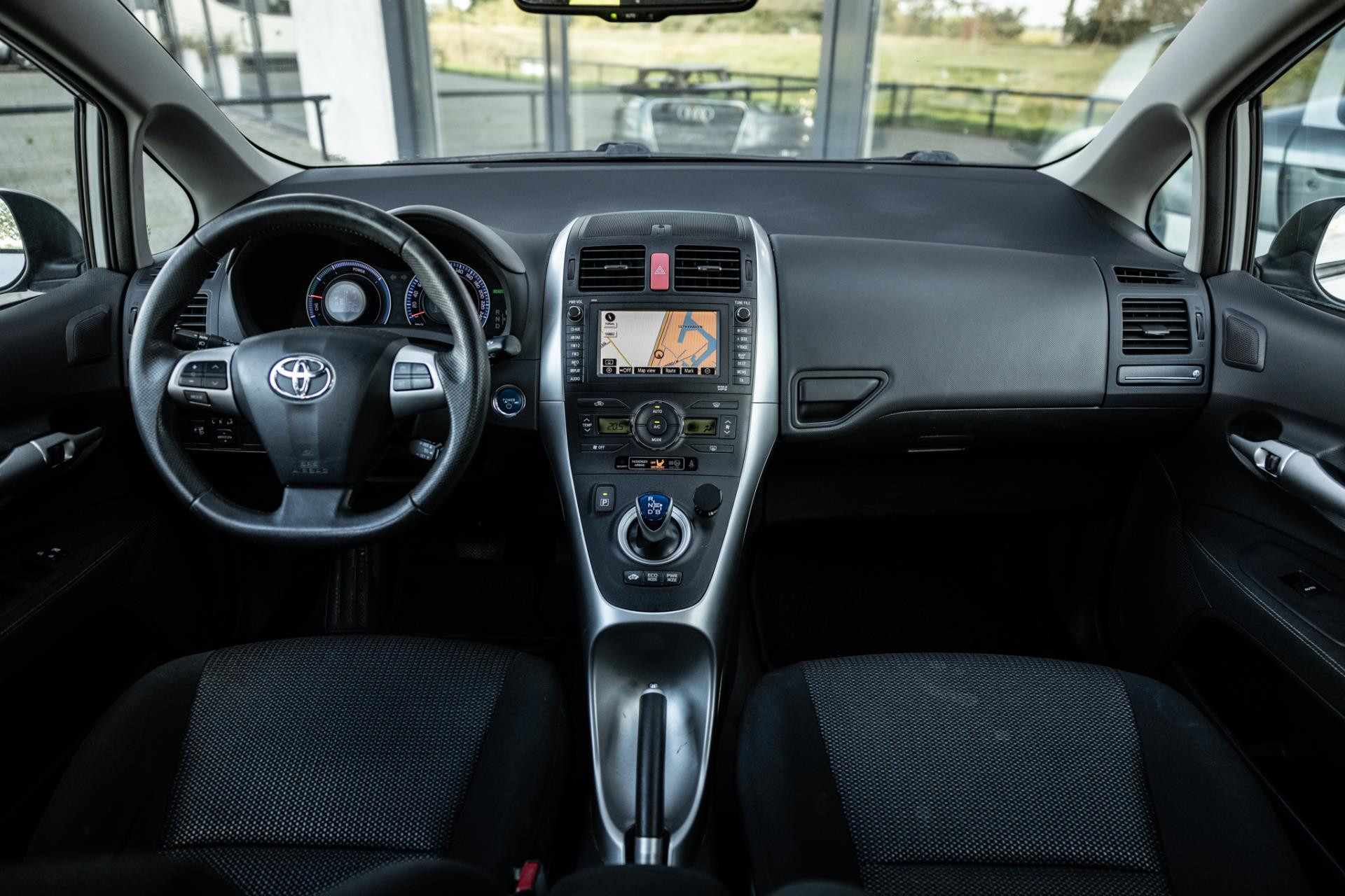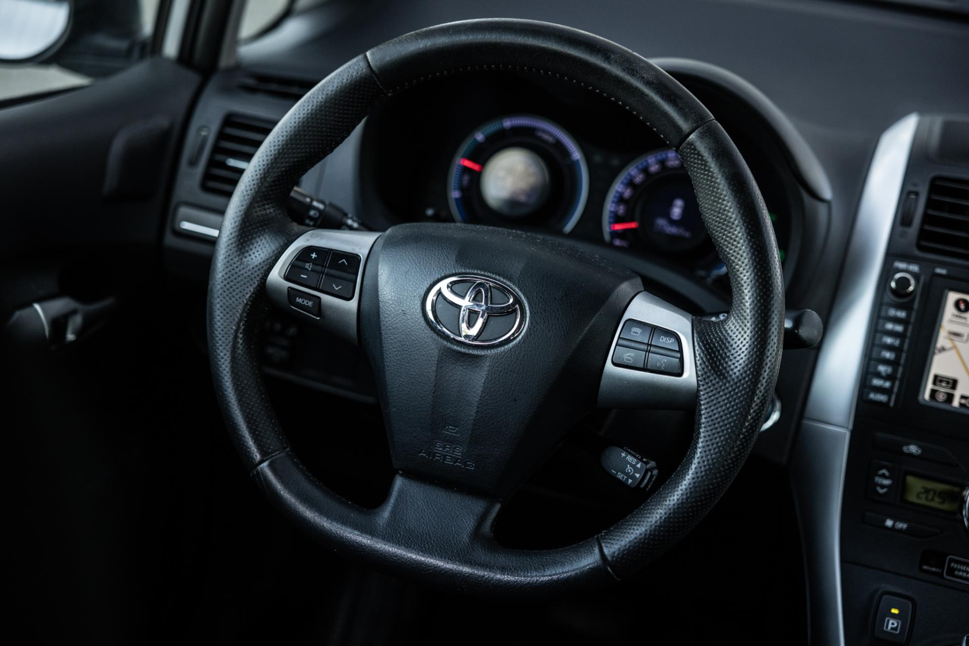Deze Toyota Auris is van 2010 en daarmee het gefacelifte type met nieuwe bumpers, LED dagrijverlichting en gemoderniseerd interieur en niet geheel onbelangrijk de vernieuwde hybride techniek. De Auris heeft een A-label en een ongekend laag afgegeven verbruik van slechts 3,8L/km. Tot 50km/h is het mogelijk om volledig elektrisch te rijden. De transmissie is automatisch en geeft enorm veel comfort. Ondanks de zeer lage verbruikscijfers biedt de Auris door de 99pk sterke 1.8 benzinemotor en maar liefst twee elektromotoren een gecombineerd vermogen van 136pk en behoorlijke prestaties. Het betreft hier de luxe Dynamic uitvoering met onder meer automatische airconditioning, geïntegreerd Toyota multimediasysteem met navigatie, bluetooth en bediening vanaf het stuurwiel, achteruitrijcamera, key-less go starten, elektrisch inklapbare buitenspiegels, cruise control en een digitaal dashboard met power meter en parkeersensoren. Ook het stuurwiel is gefacelift en is voorzien van lederen bekleding.