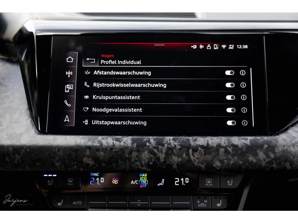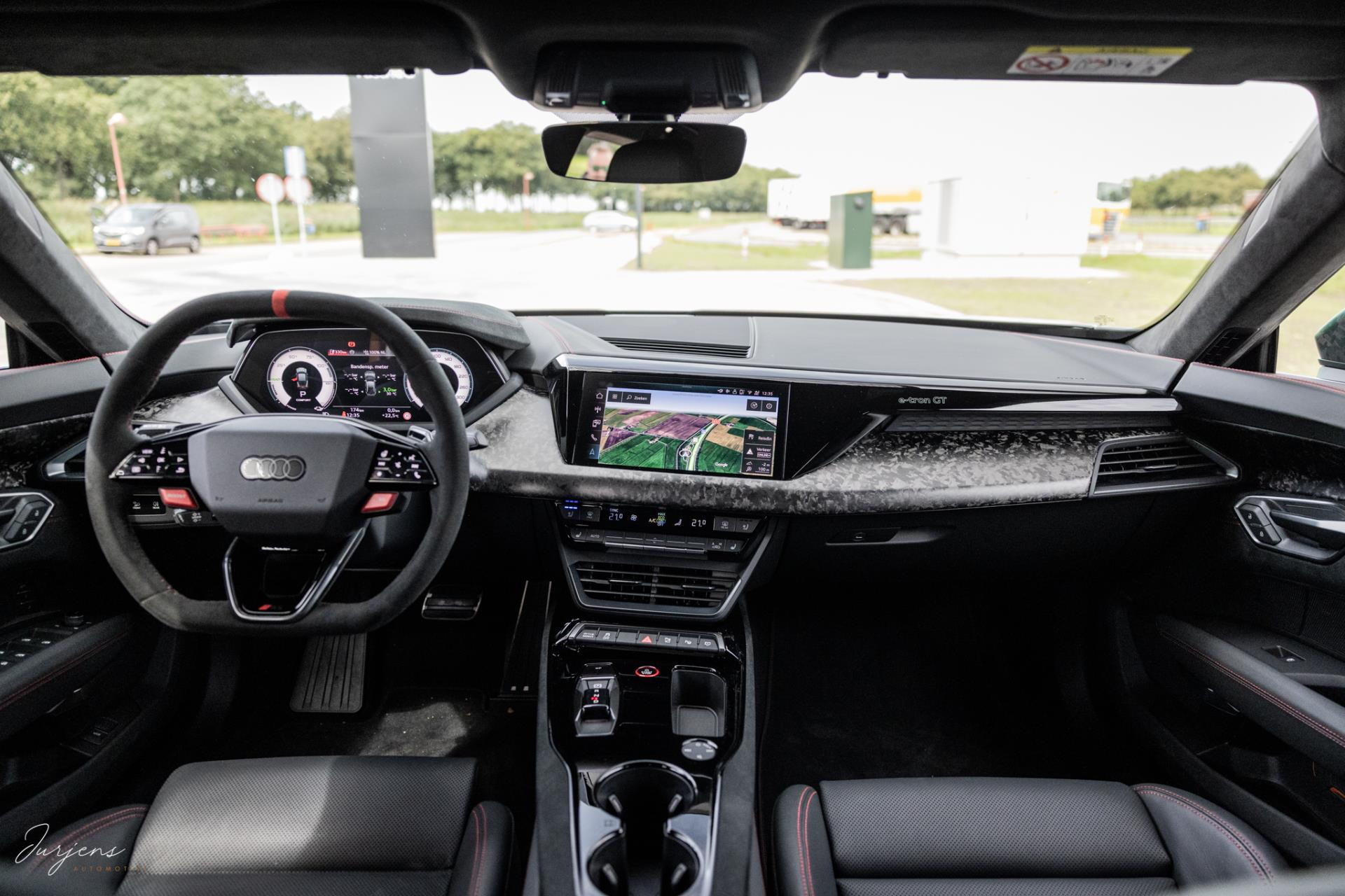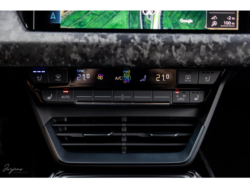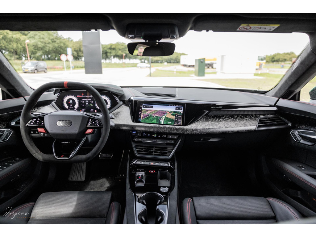 Zoals gezegd is de e-tron uitgerust met praktisch gezien al hetgeen er mogelijk was. Zo zijn de sportstoelen voorzien van massagestanden en zijn alle zitplaatsen voorzien van stoelverwarming en stoelventilatie. Het fenomenale Bang & Olufsen Premium audiosysteem mag niet ontbreken. Het camerasysteem geeft beeld rondom de auto en alle rijassistenten zijn present. Uiteraard voorziet de e-tron in LED Matrix verlichting inclusief laserlicht. Bijzonder is de luchtvering. Bij het instappen verhoogt het de carrosserie met 8 cm in een oogwenk zodat de instap vergemakkelijk wordt. Daarnaast houd deze luchtvering bij extreme rijomstandigheden de koets kaarsrecht. Overigens is de GT RS Performance ook voorzien van vierwielsturing ter verbetering van de balans.