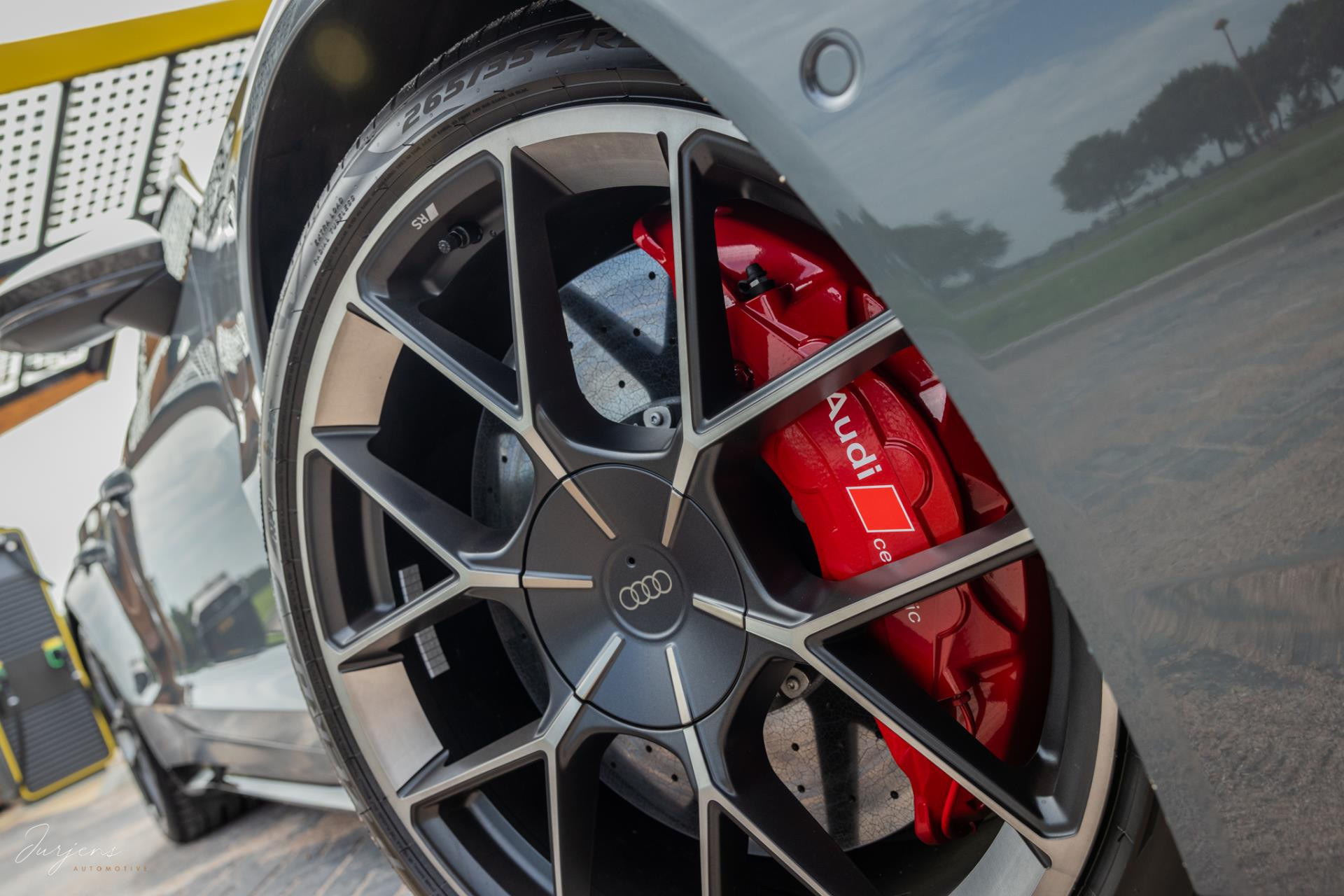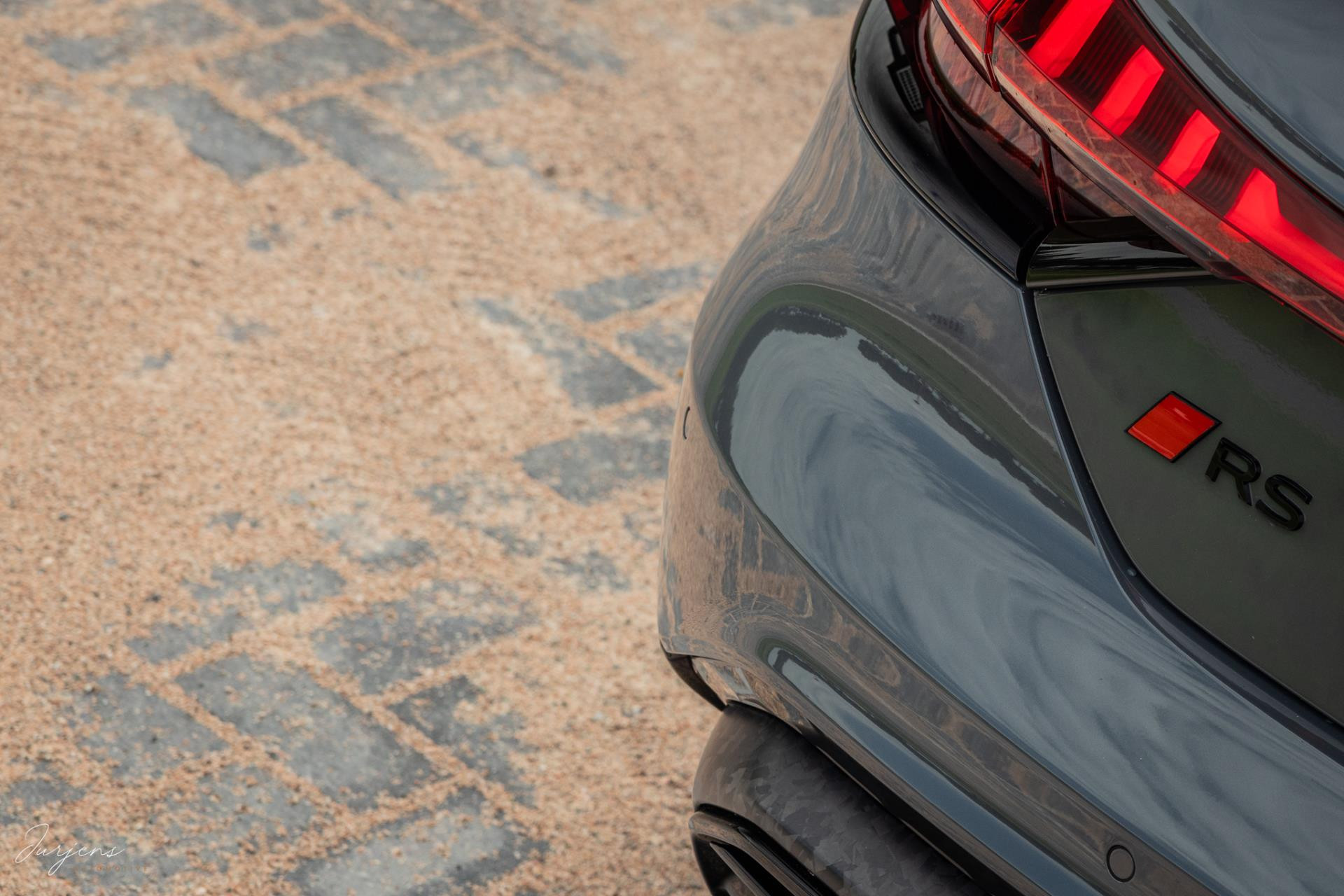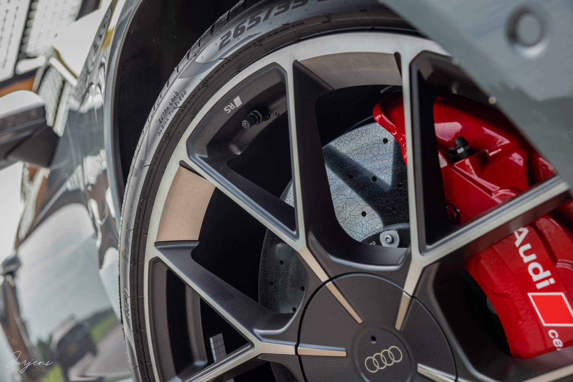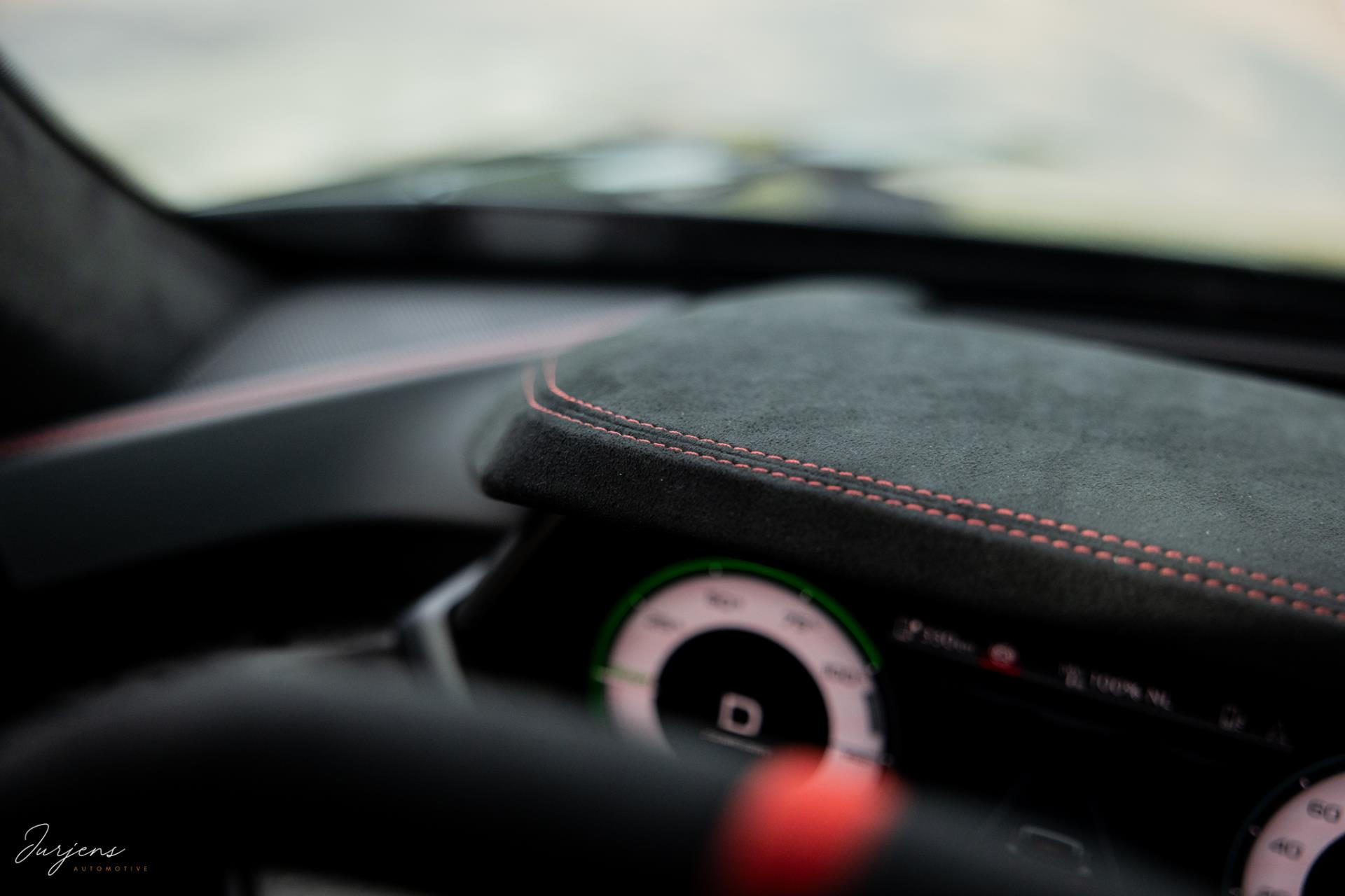 Er is gekozen voor de speciale kleur – Nimbusgrau Perleffekt – gecombineerd met forged carbon of, Carbon Camouflage, zoals Audi het zelf noemt. Zelfs het dak is uitgevoerd in carbon en om al het geweld tot stoppen te manen beschikt de RS Performance over keramische remmen. In dit geval met rood gelakte remklauwen af fabriek.