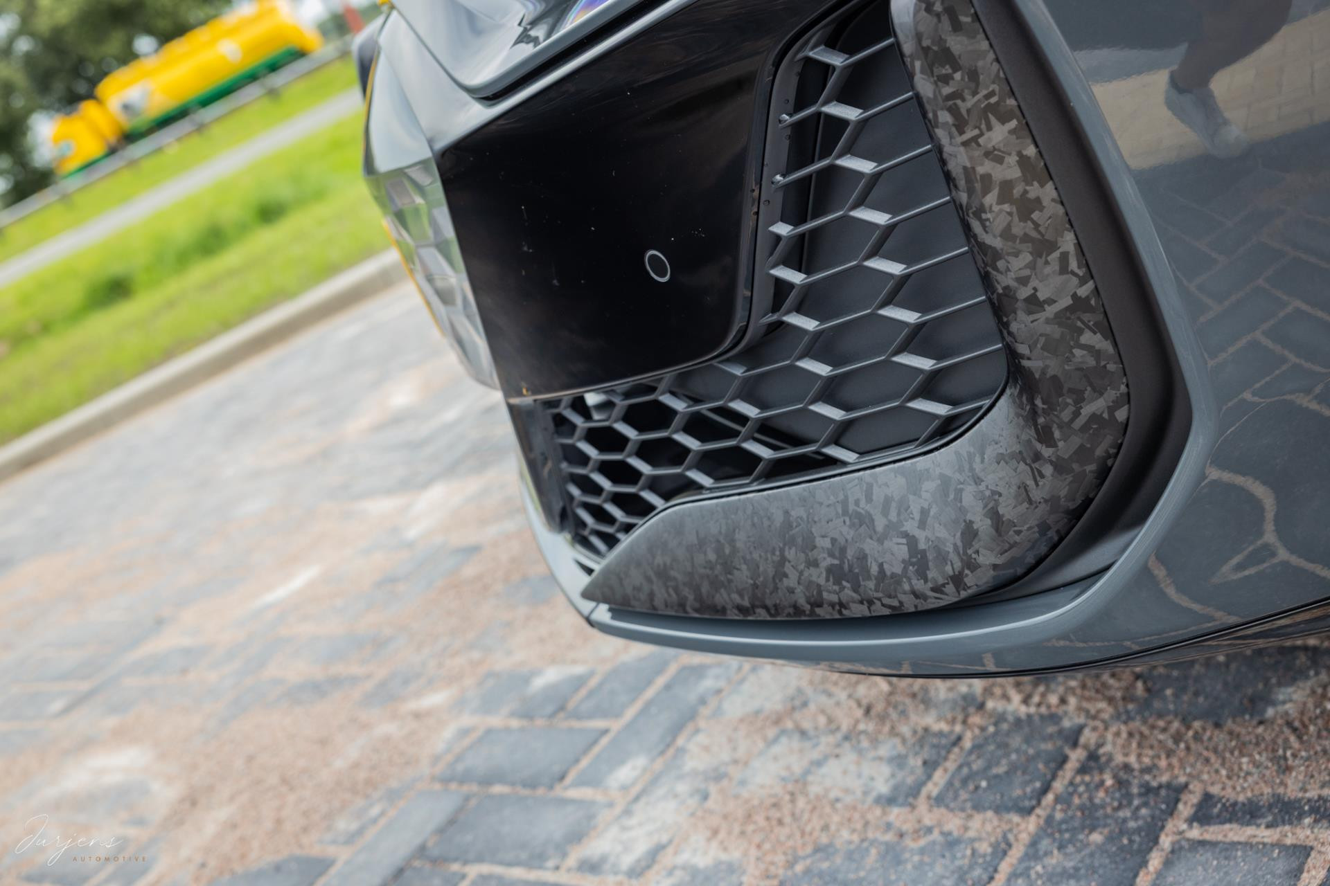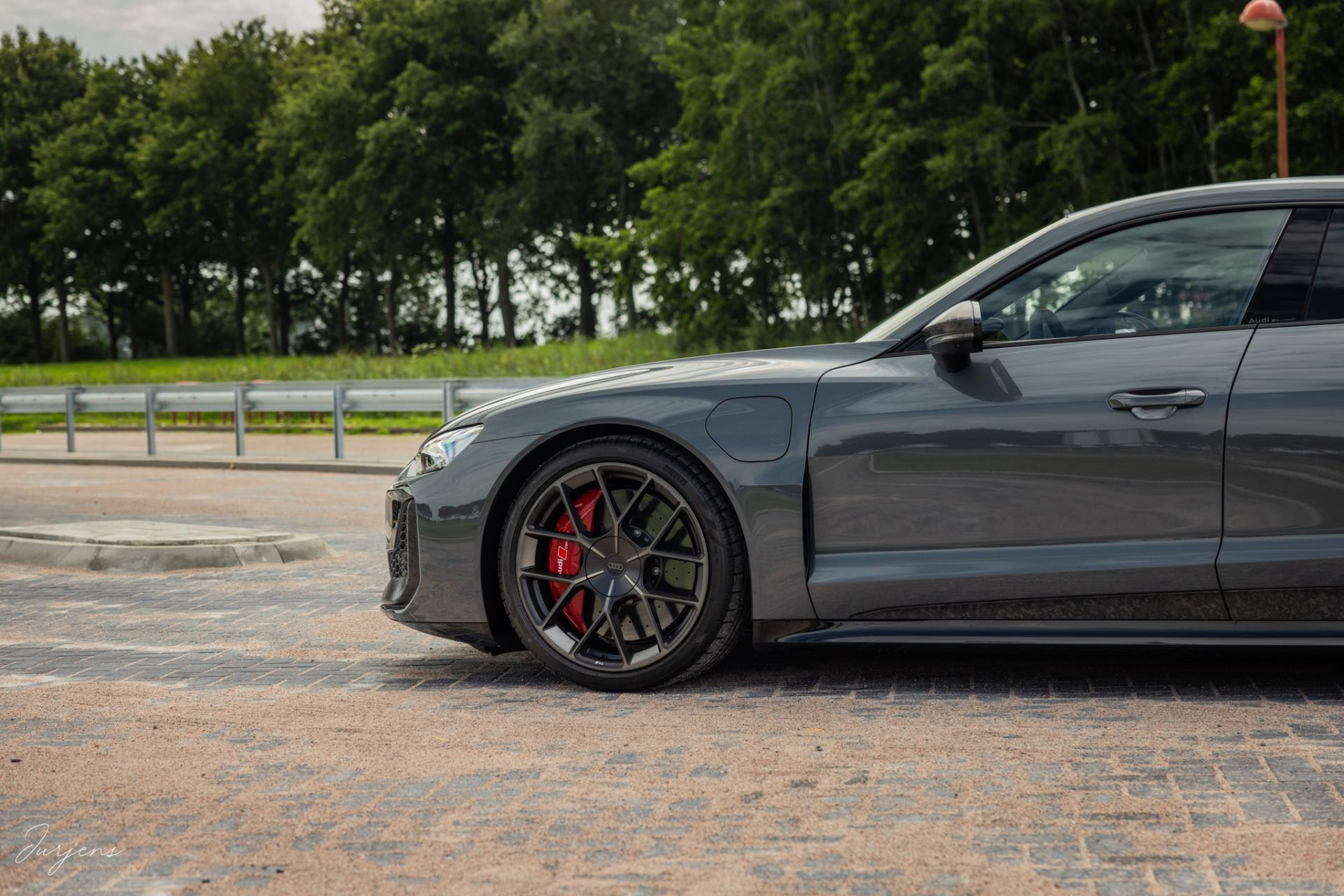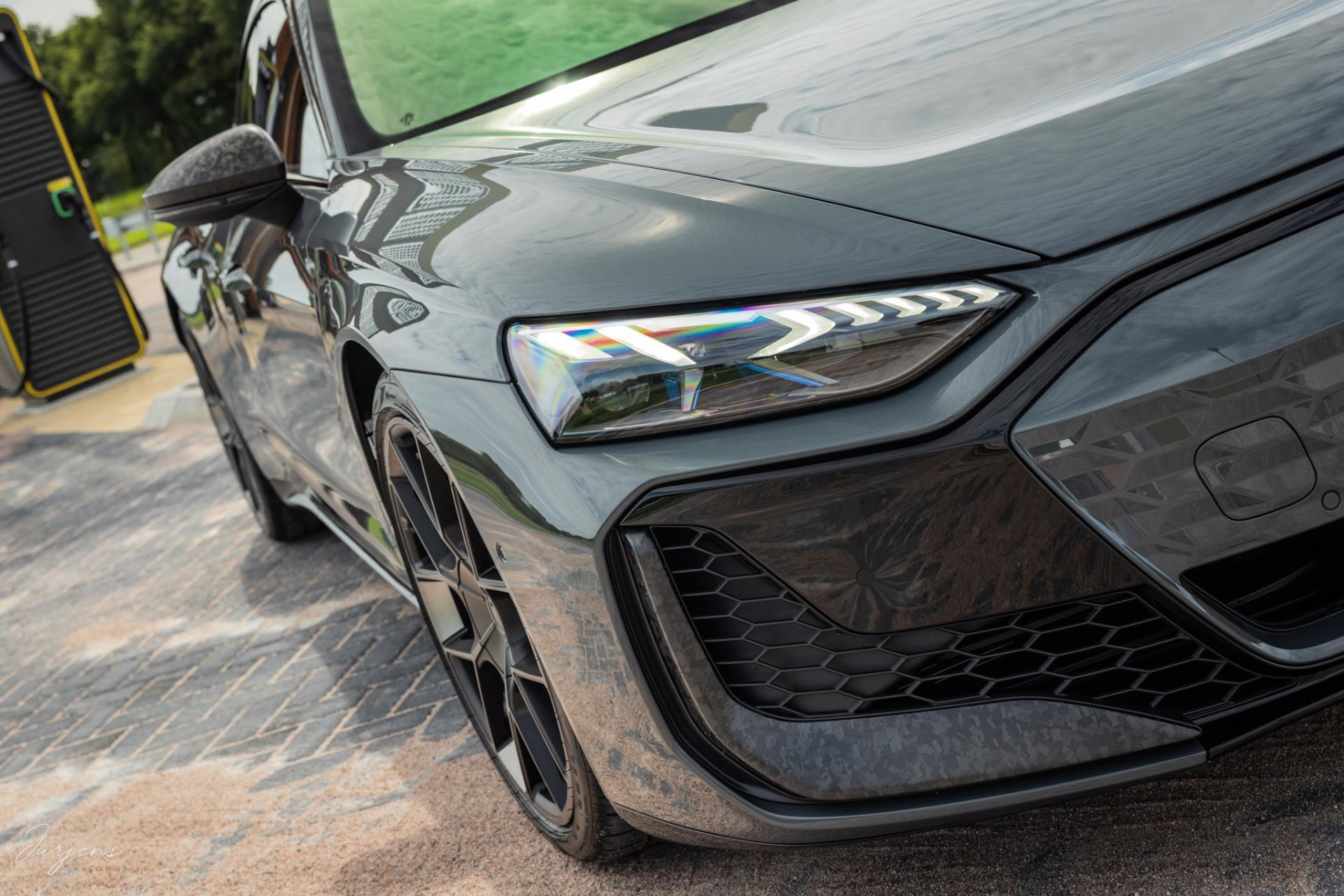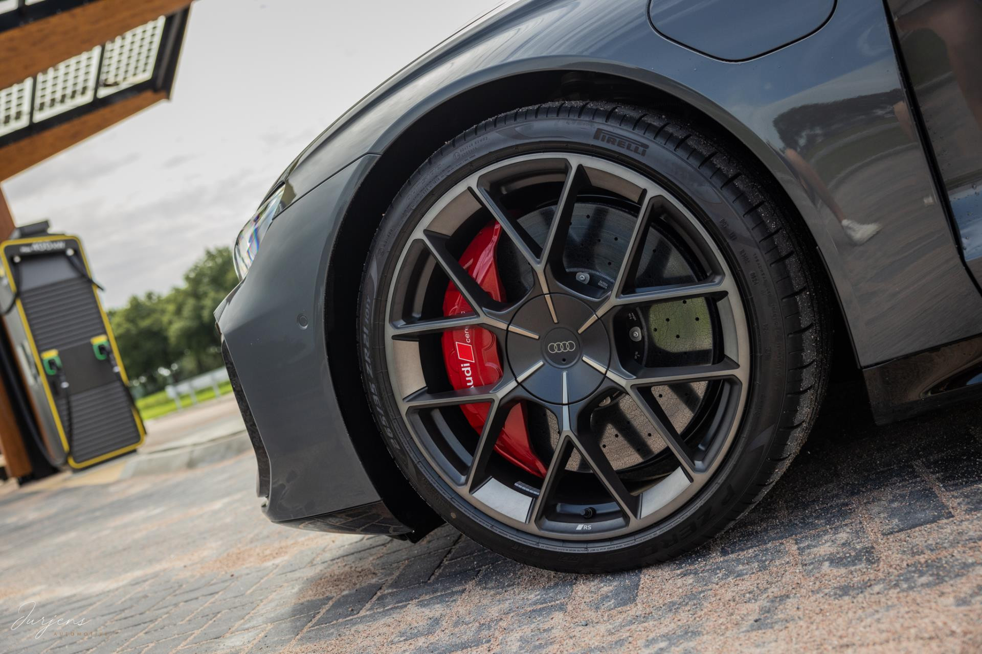 Er is gekozen voor de speciale kleur – Nimbusgrau Perleffekt – gecombineerd met forged carbon of, Carbon Camouflage, zoals Audi het zelf noemt. Zelfs het dak is uitgevoerd in carbon en om al het geweld tot stoppen te manen beschikt de RS Performance over keramische remmen. In dit geval met rood gelakte remklauwen af fabriek.