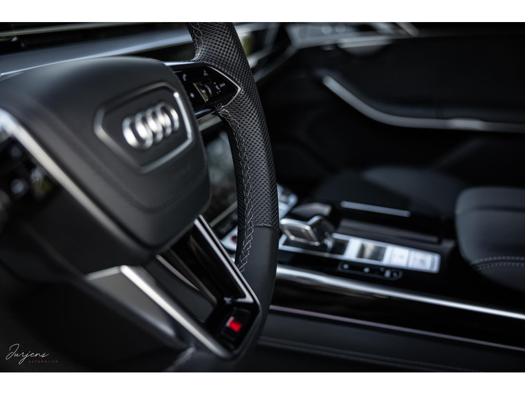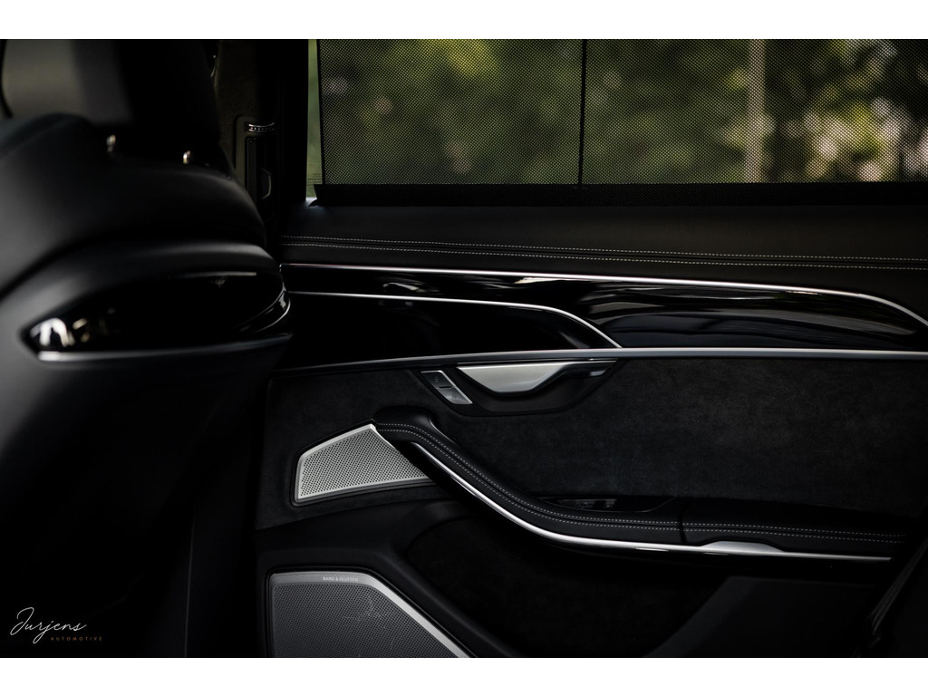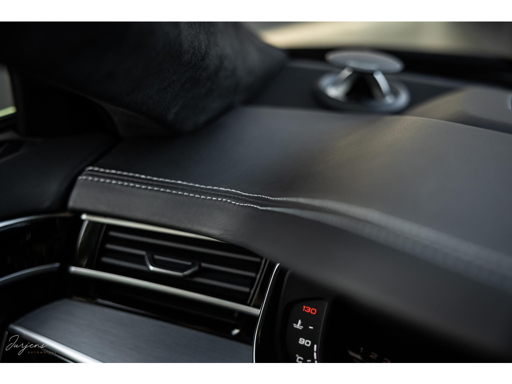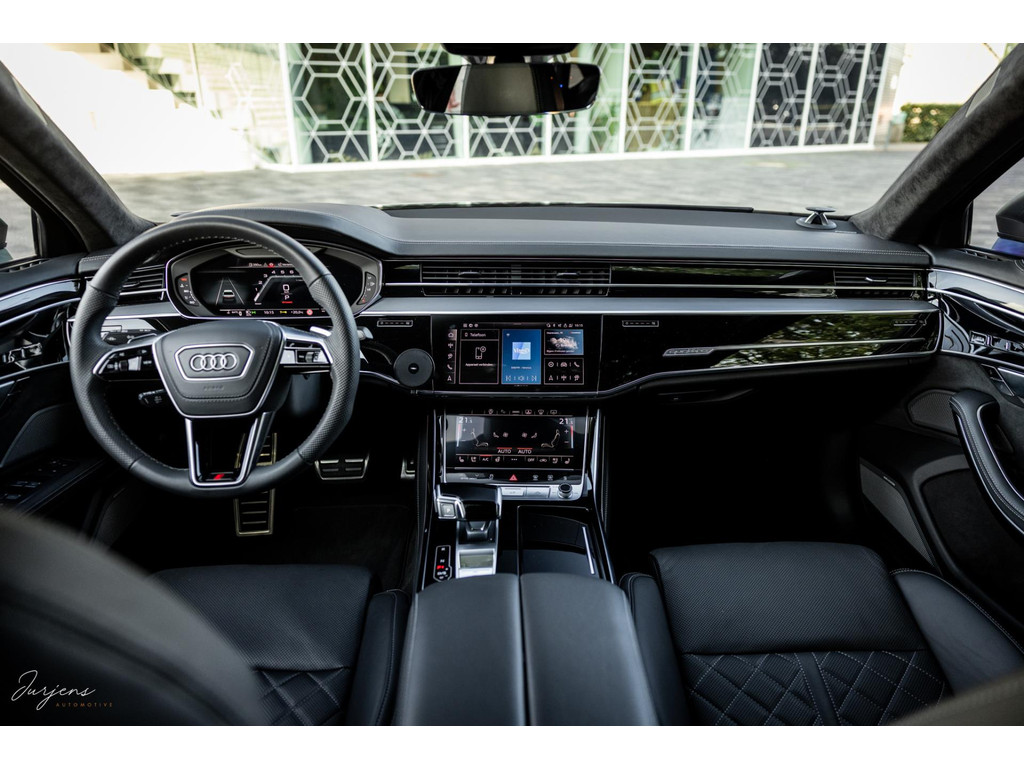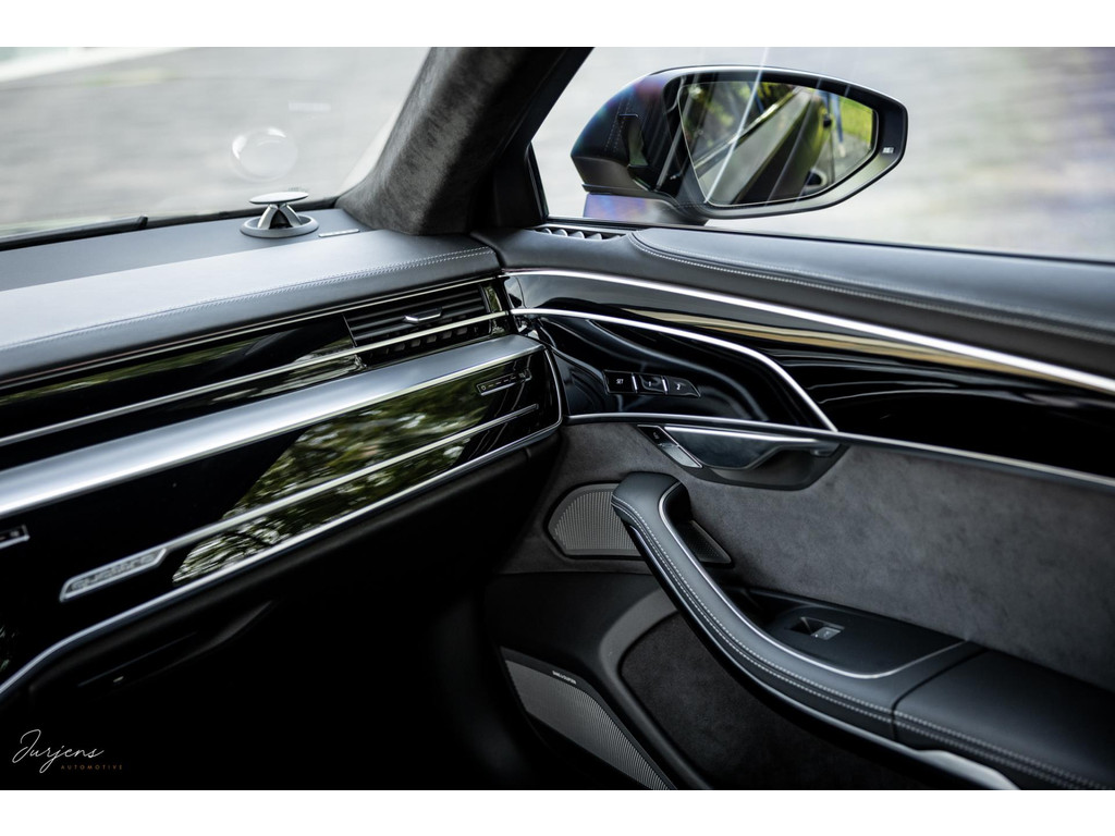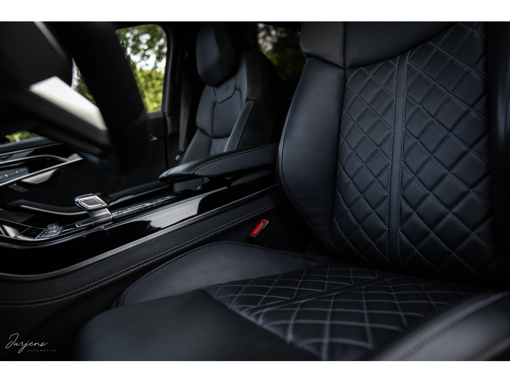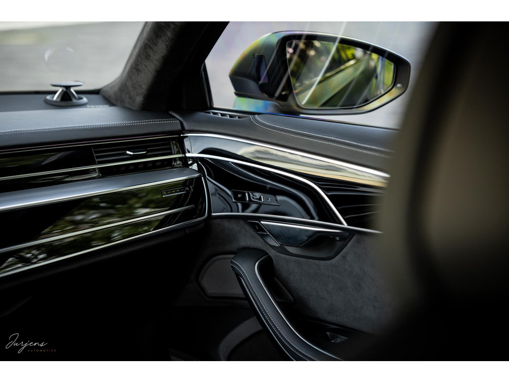 De S8 is af-fabriek reeds prachtig samengesteld met de exterieurkleur – Mythosschwarz metallic – in combinatie met de zwarte accenten van de sierlijsten, spiegels, grill en natuurlijk de gigantische custom made forged 22” velgen. Erachter het broodnodige keramisch remsysteem. Het interieur werd voorzien van zwart Nappa leder met dimanond stitching. De hemelbekleding is uiteraard uitgevoerd in Individual alcantara in antraciet. Qua uitrusting is deze S8 voorzien van vrijwel alles dat mogelijk is. Enkele high lights zijn het keramisch remsysteem dat je zelden ziet op een S8, de vierwielbesturing, alle mogelijke rijassistenten, volledige Nappa leder, stoelmassage en noise cancelling. Niet te vergeten het fenomenale Bang & Olufsen Advanced audiosysteem. Check ook de catalogusprijs van specifiek dit exemplaar. De catalogusprijs is maar liefst EUR 301.877.