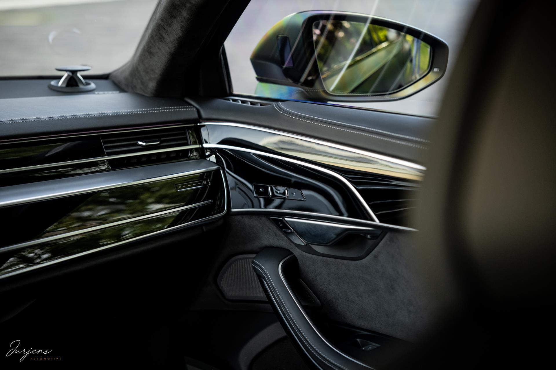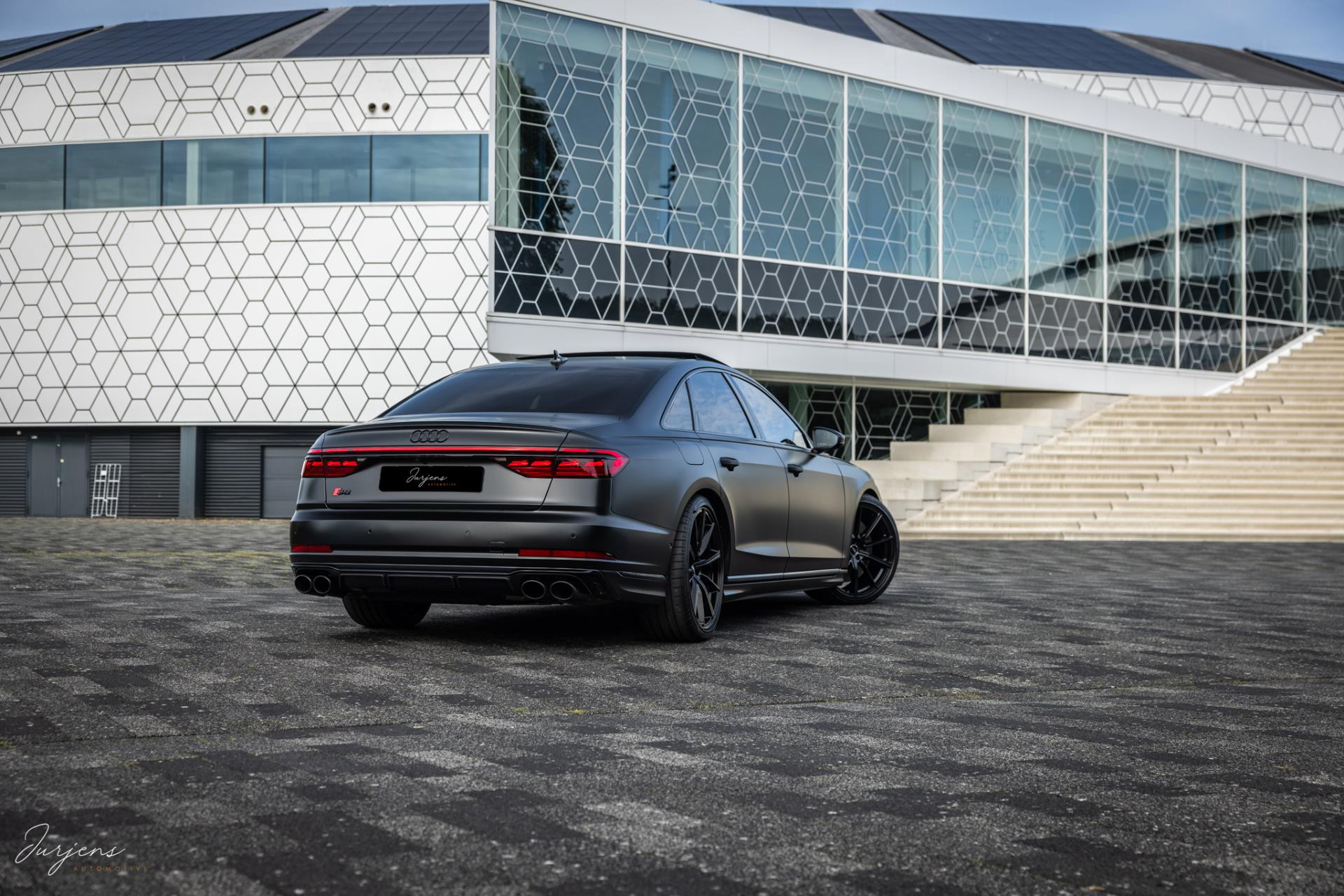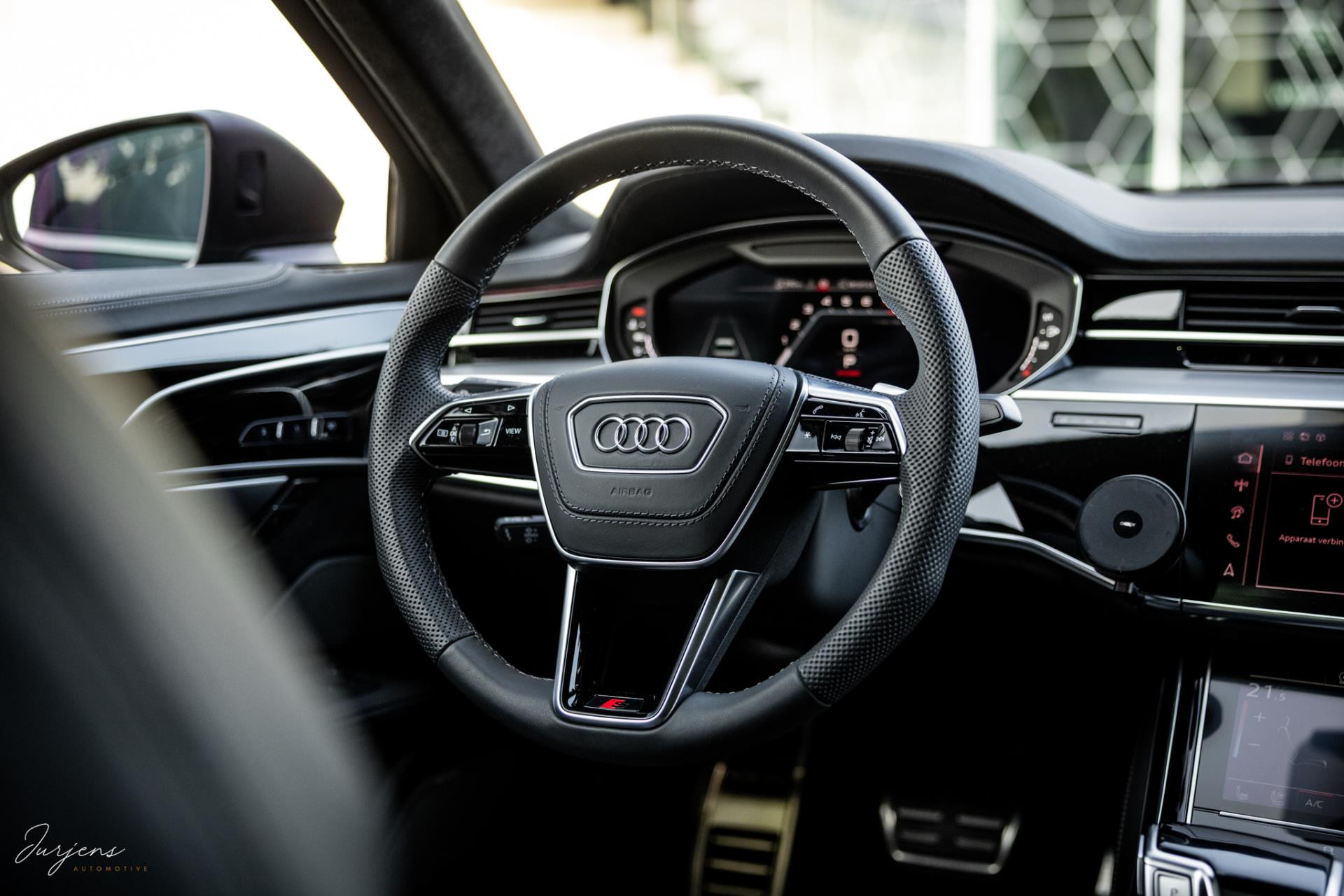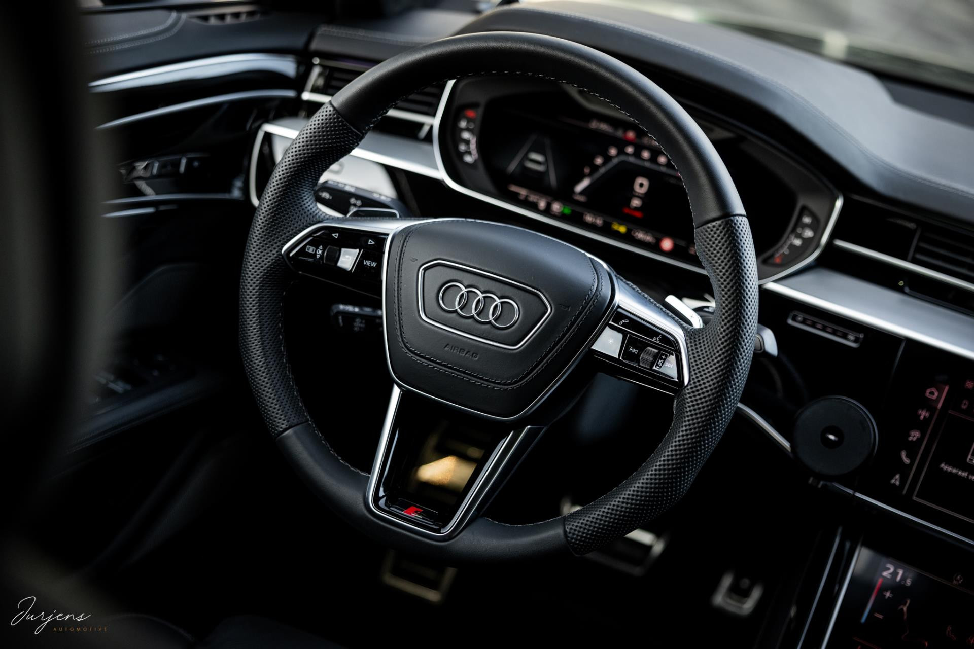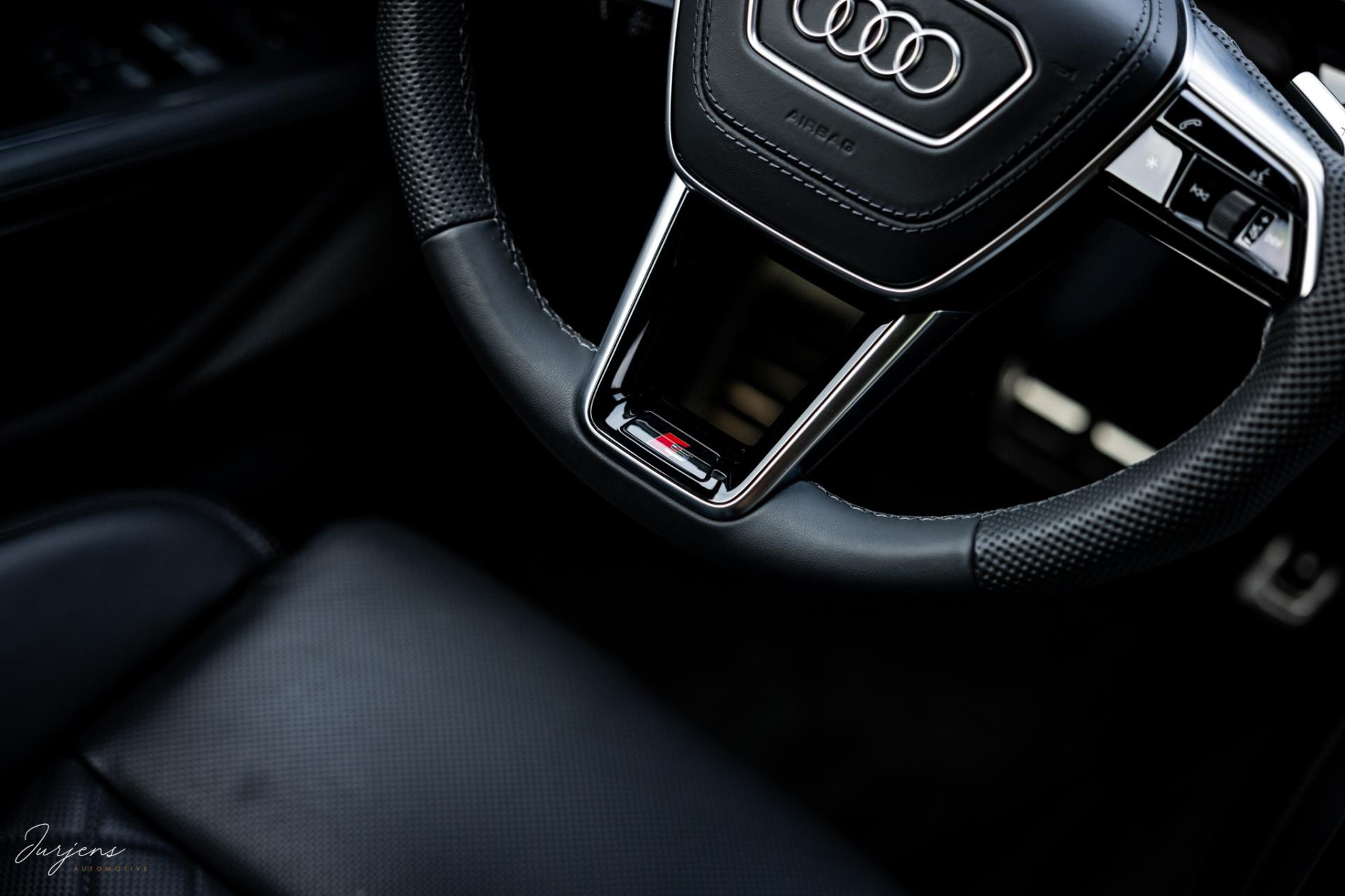 De S8 is af-fabriek reeds prachtig samengesteld met de exterieurkleur – Mythosschwarz metallic – in combinatie met de zwarte accenten van de sierlijsten, spiegels, grill en natuurlijk de gigantische custom made forged 22” velgen. Erachter het broodnodige keramisch remsysteem. Het interieur werd voorzien van zwart Nappa leder met dimanond stitching. De hemelbekleding is uiteraard uitgevoerd in Individual alcantara in antraciet. Qua uitrusting is deze S8 voorzien van vrijwel alles dat mogelijk is. Enkele high lights zijn het keramisch remsysteem dat je zelden ziet op een S8, de vierwielbesturing, alle mogelijke rijassistenten, volledige Nappa leder, stoelmassage en noise cancelling. Niet te vergeten het fenomenale Bang & Olufsen Advanced audiosysteem. Check ook de catalogusprijs van specifiek dit exemplaar. De catalogusprijs is maar liefst EUR 301.877.