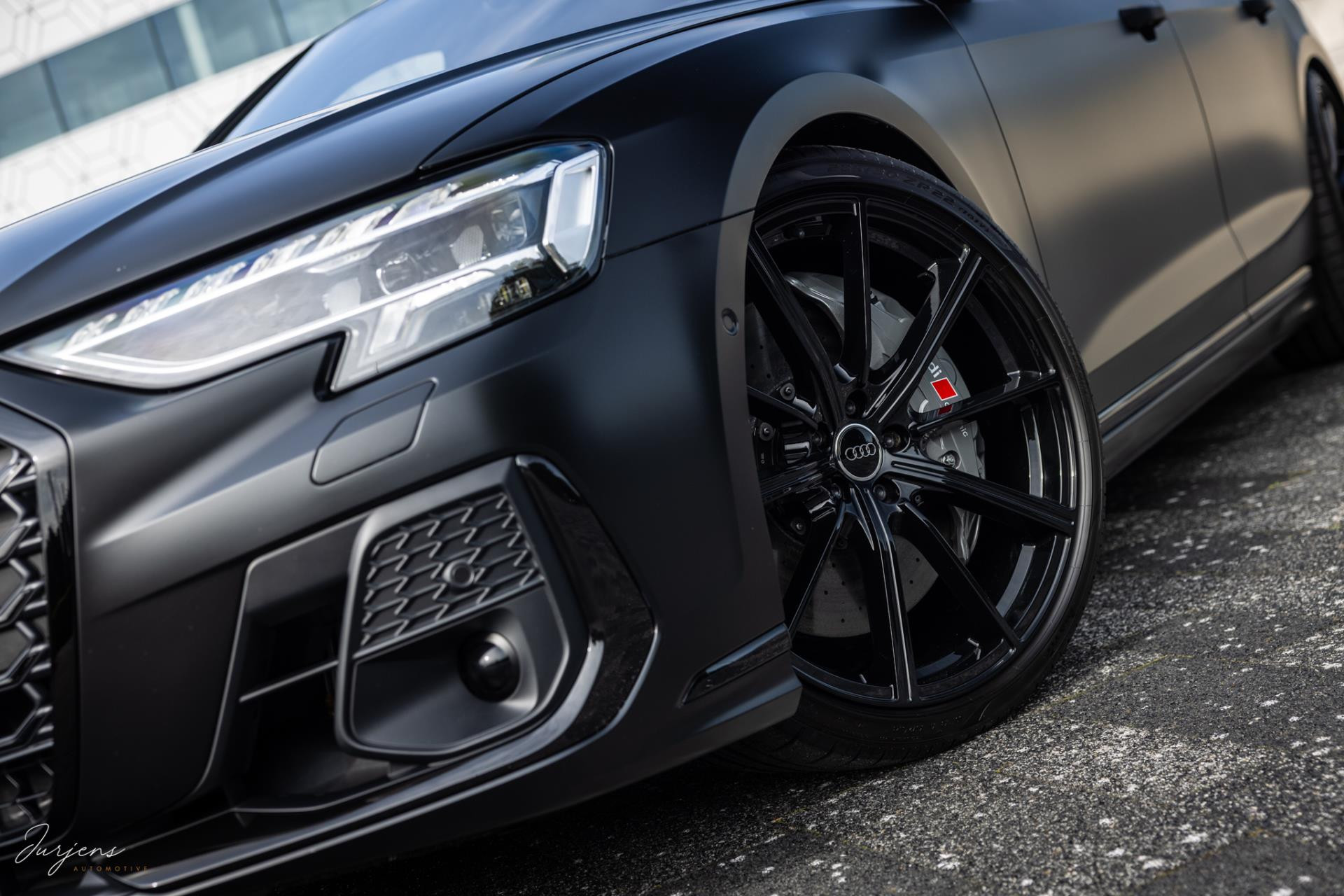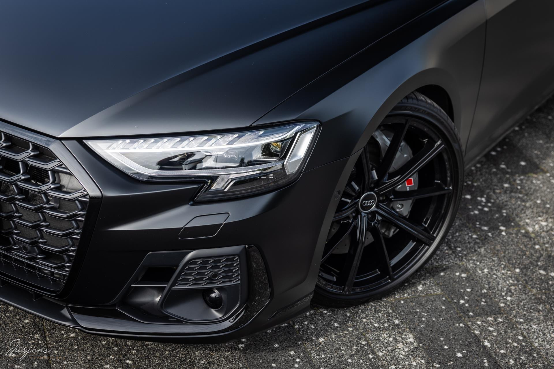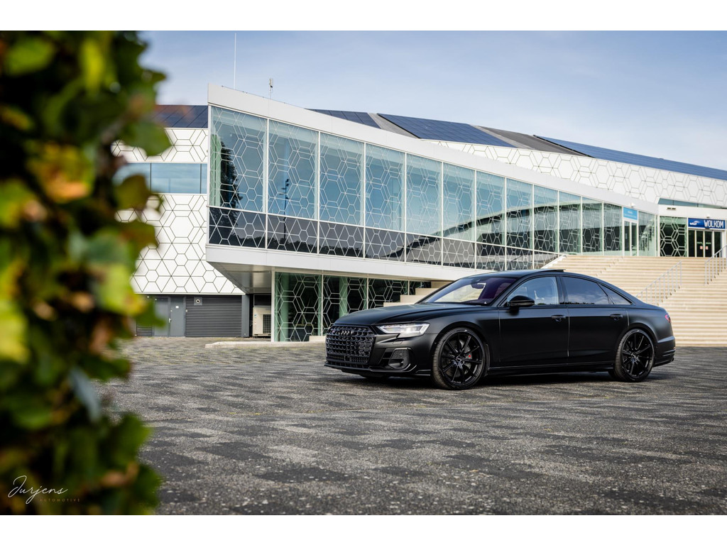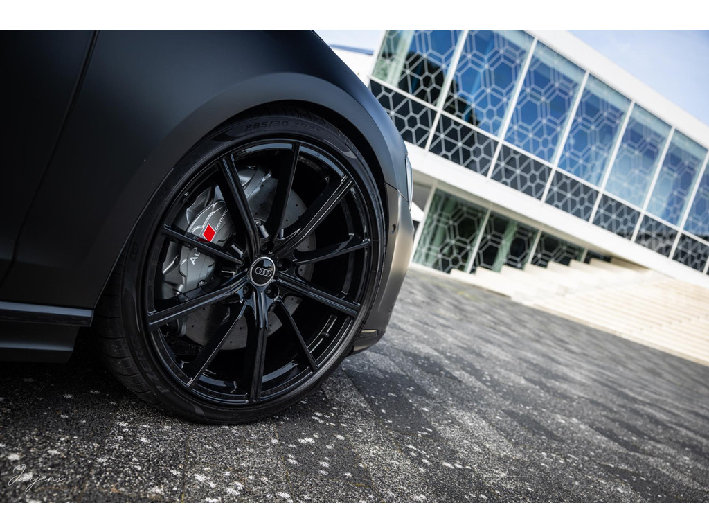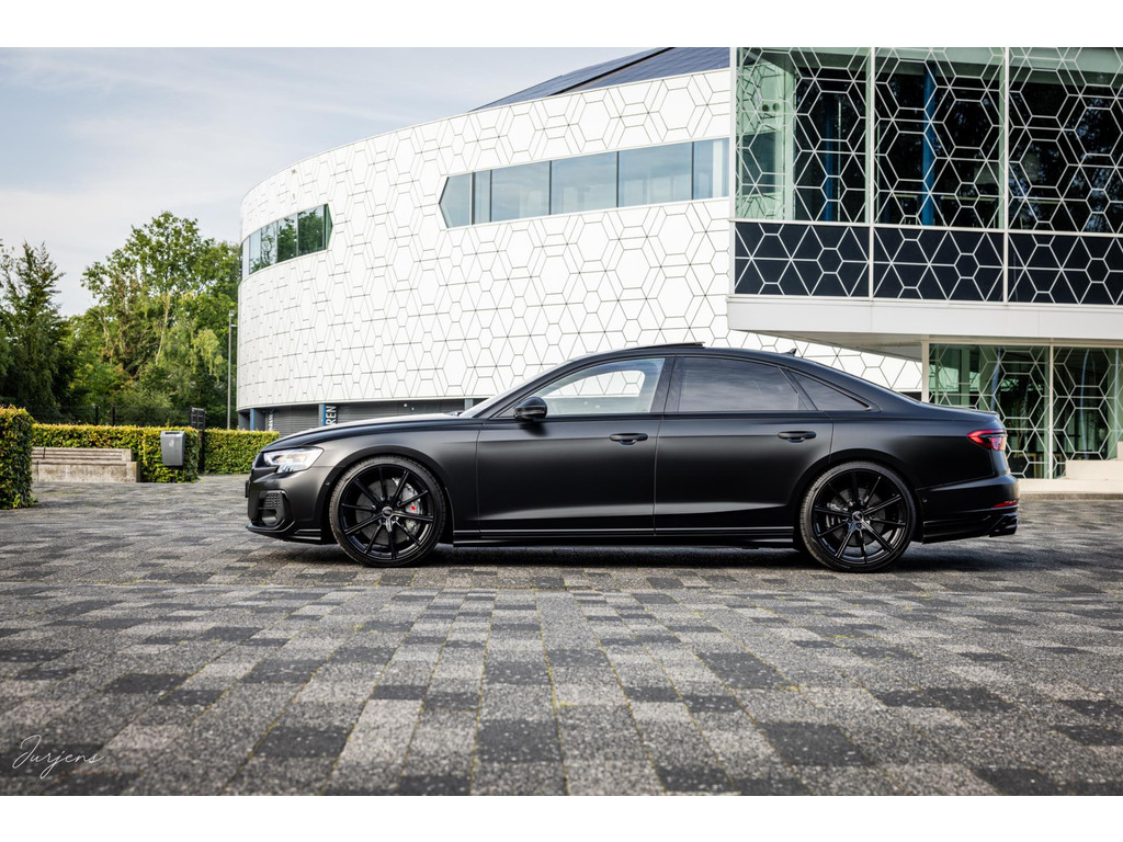 Verdere aanpassingen zijn onder meer de velgen. Ondanks het feit dat het model ogenschijnlijk origineel is, werd dit wiel nooit geleverd in deze maat. De gemonteerde velgen zijn speciaal voor deze S8 gefabriceerd. De 22” ‘forged’ velgen zijn omtrokken met Pirello pZero schoeisel in de maat 285/30 R22. En dan de wrap. Dit is de nieuwste generatie PPF. Waar PPF tot dusver altijd transparant was is deze PPD door en door gekleurd waardoor deze satijn zwarte kleur ontstaat. Dit is dus niet zomaar een wrap folie, maar volledige PPF in eindkleur.