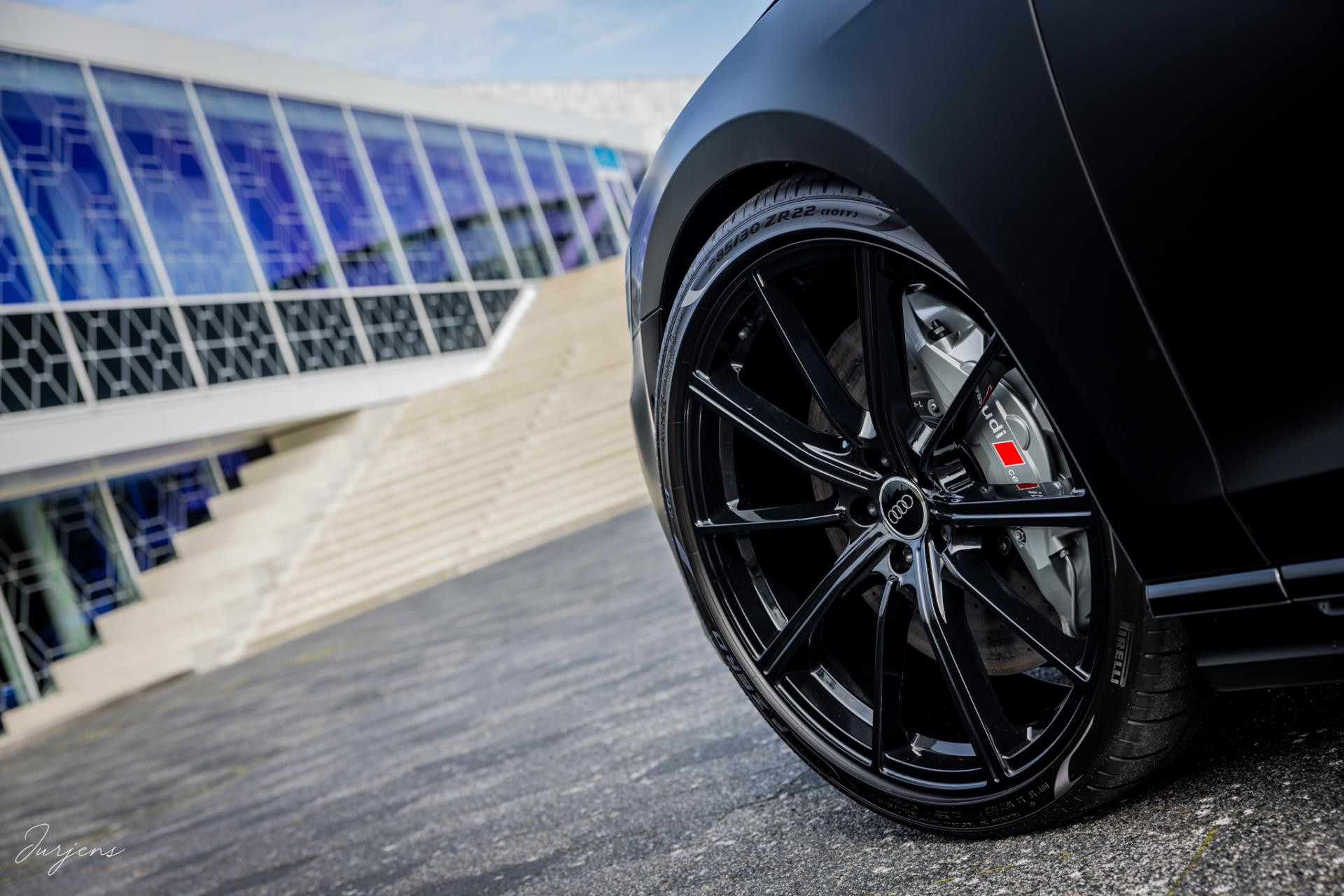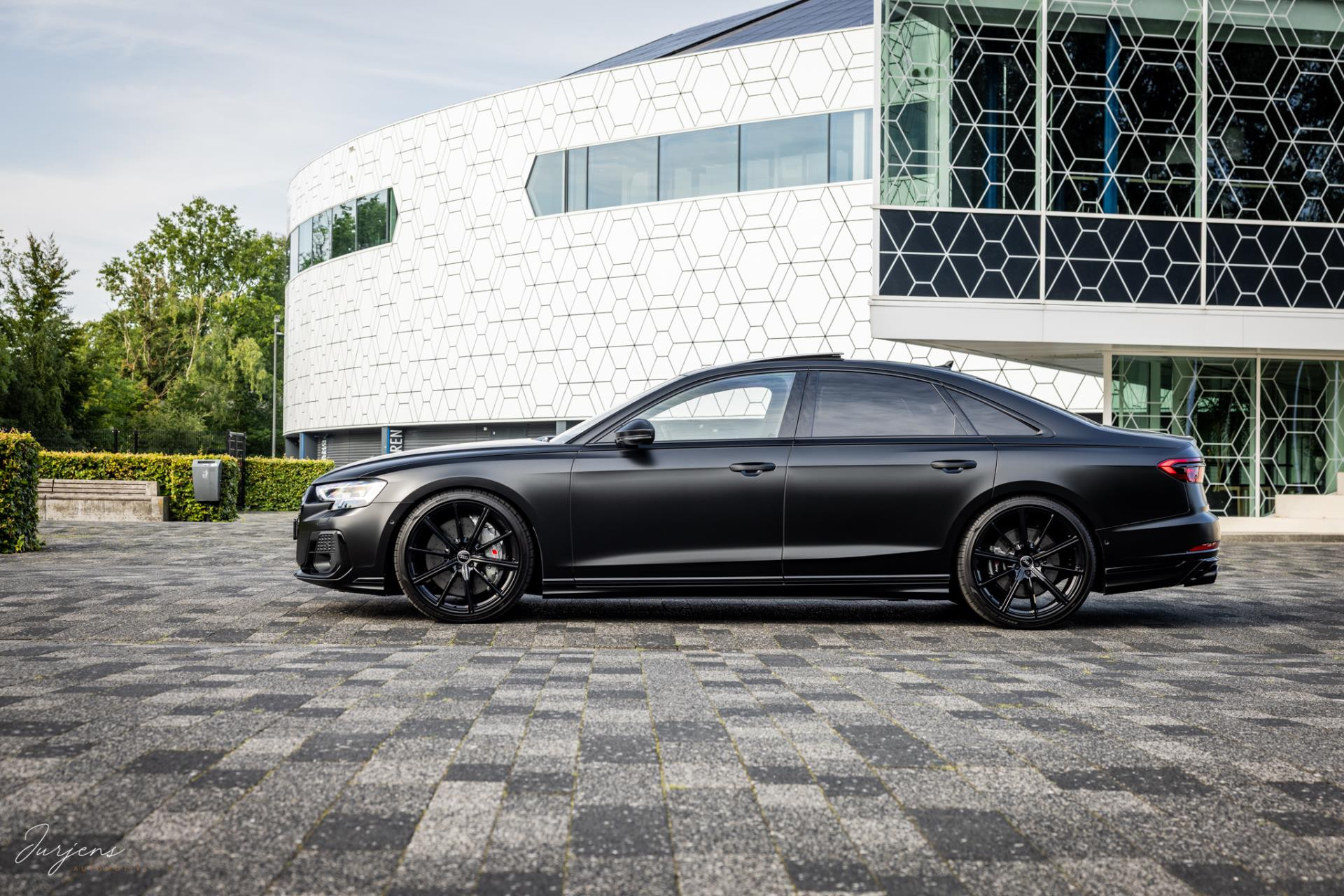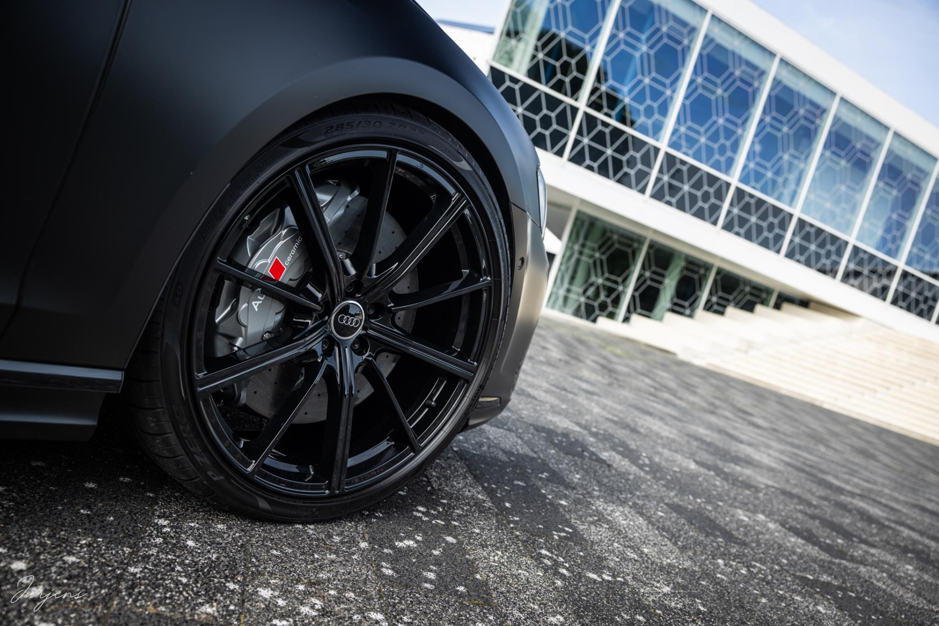 Verdere aanpassingen zijn onder meer de velgen. Ondanks het feit dat het model ogenschijnlijk origineel is, werd dit wiel nooit geleverd in deze maat. De gemonteerde velgen zijn speciaal voor deze S8 gefabriceerd. De 22” ‘forged’ velgen zijn omtrokken met Pirello pZero schoeisel in de maat 285/30 R22. En dan de wrap. Dit is de nieuwste generatie PPF. Waar PPF tot dusver altijd transparant was is deze PPD door en door gekleurd waardoor deze satijn zwarte kleur ontstaat. Dit is dus niet zomaar een wrap folie, maar volledige PPF in eindkleur.