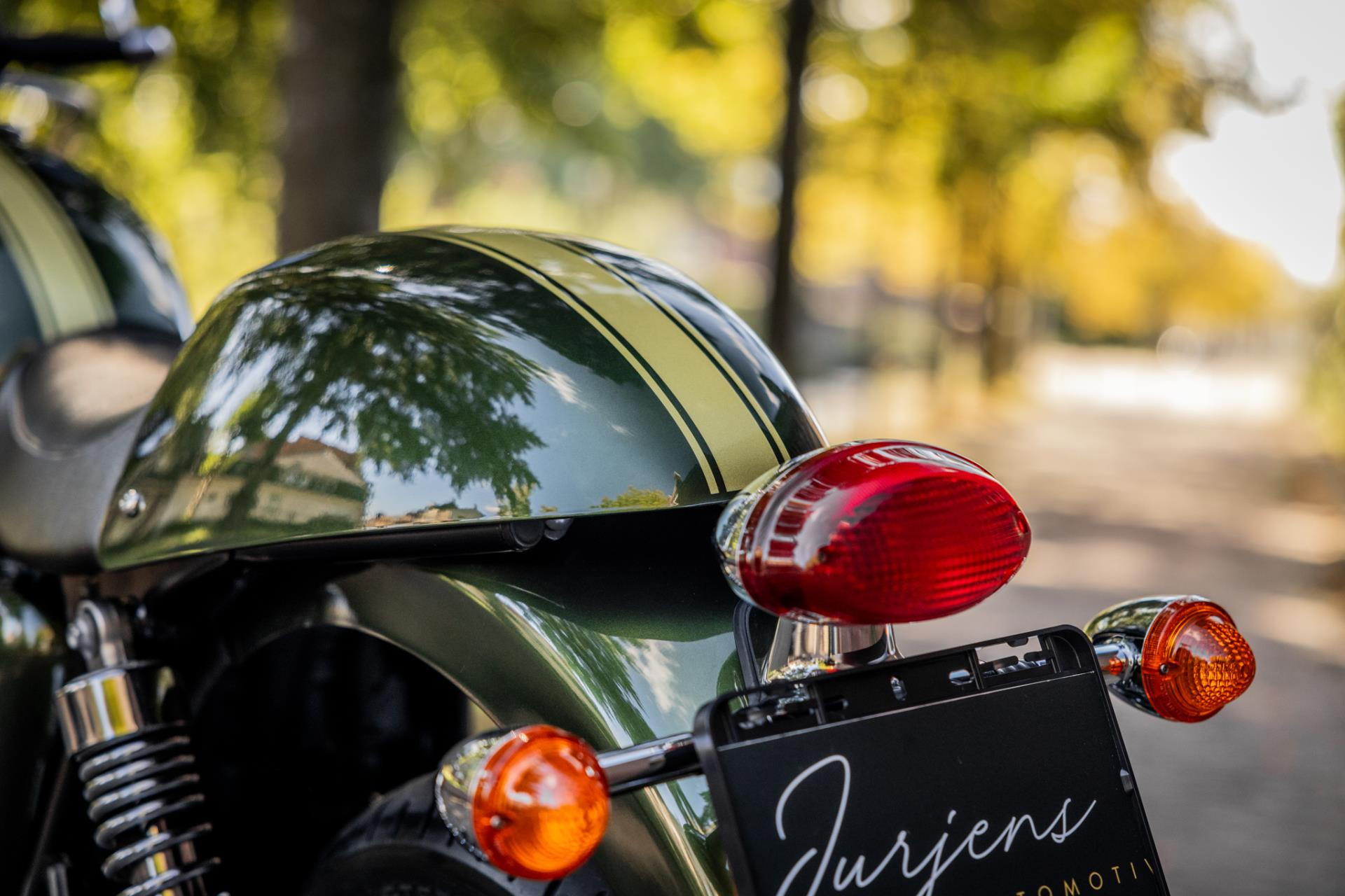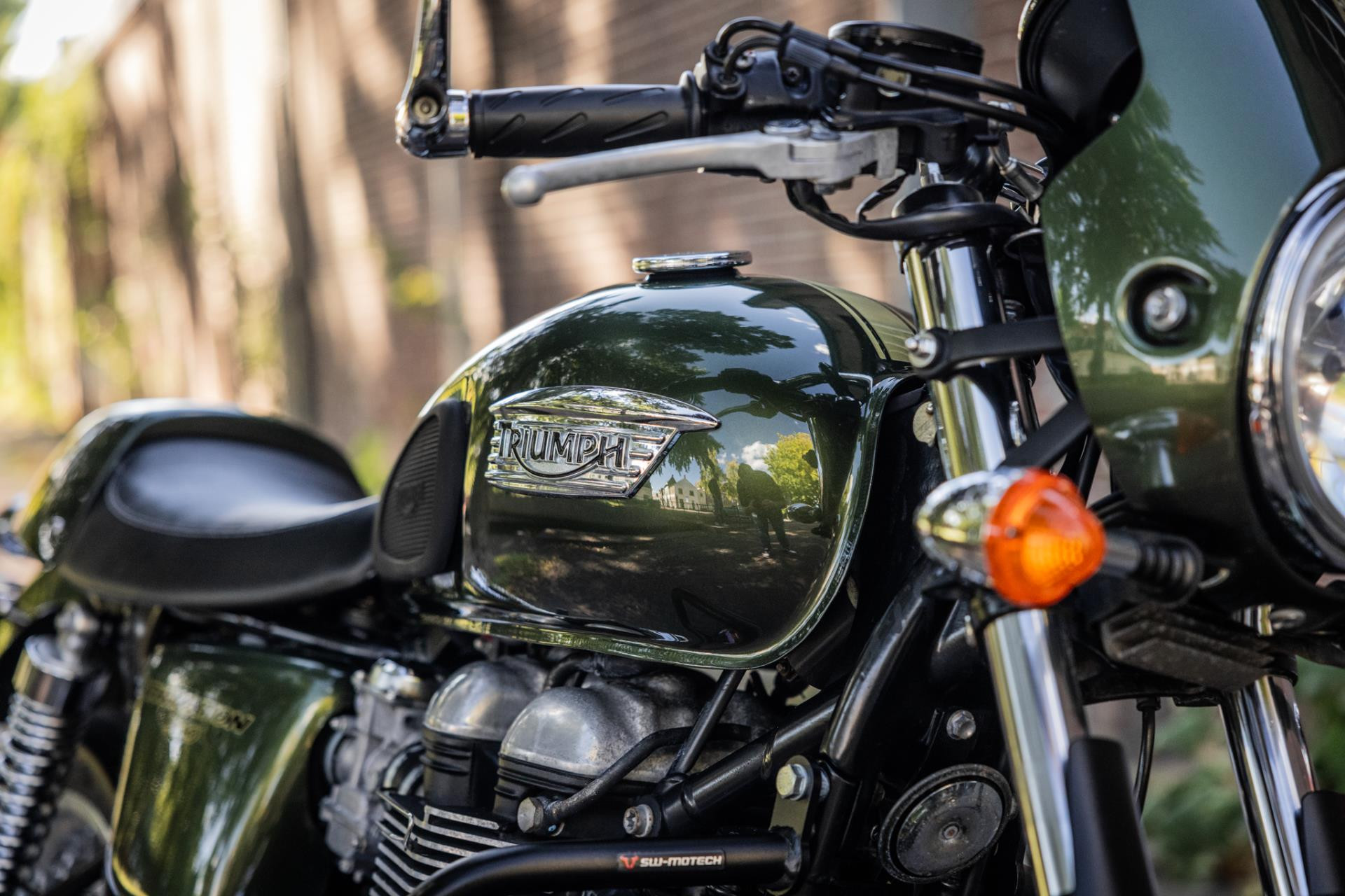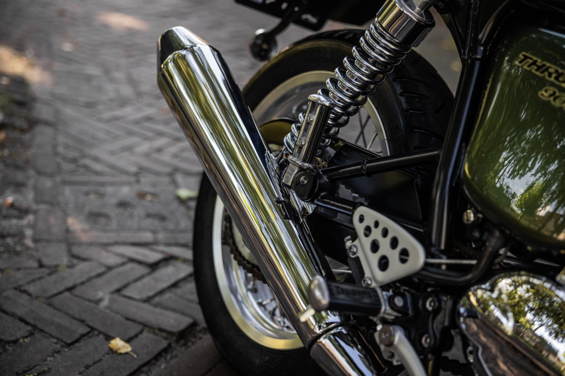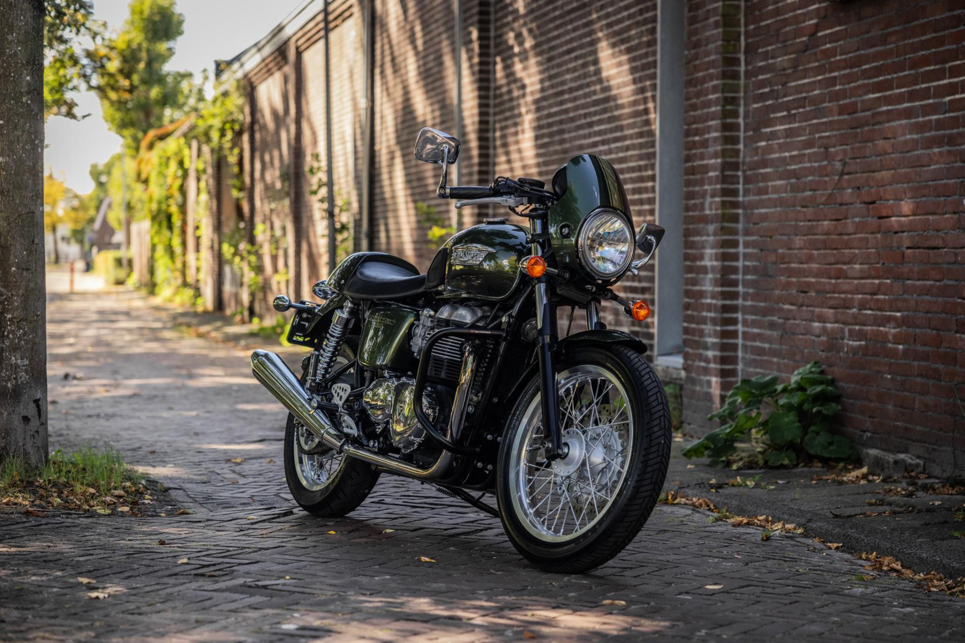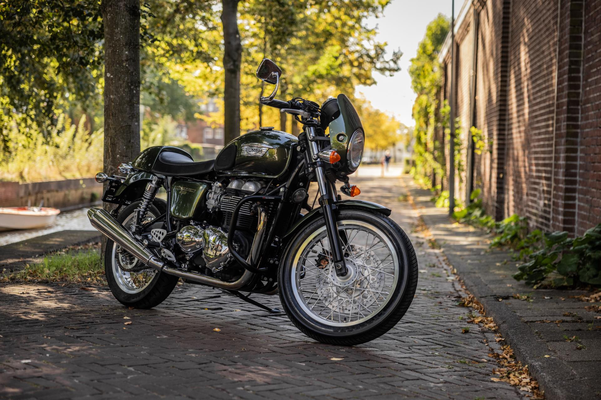 De Thriumph Thruxton is een echte Britse caférace. De geweldige kleur – Brooklands Green – combineert waanzinnig met de stijlvolle Gold striping en de vele chromen accenten. Echt een opvallende verschijning met de klassieke looks, maar moderne techniek.