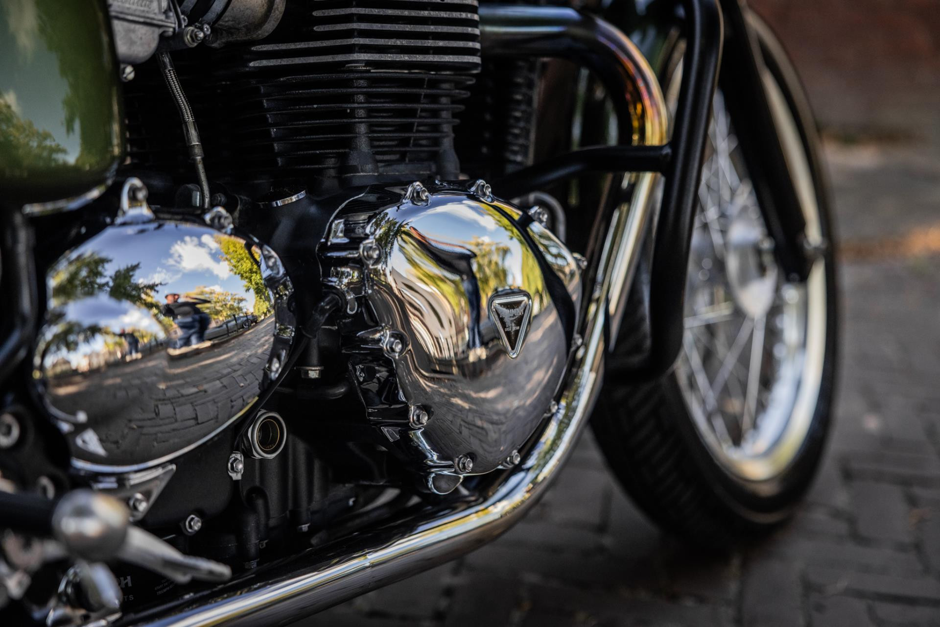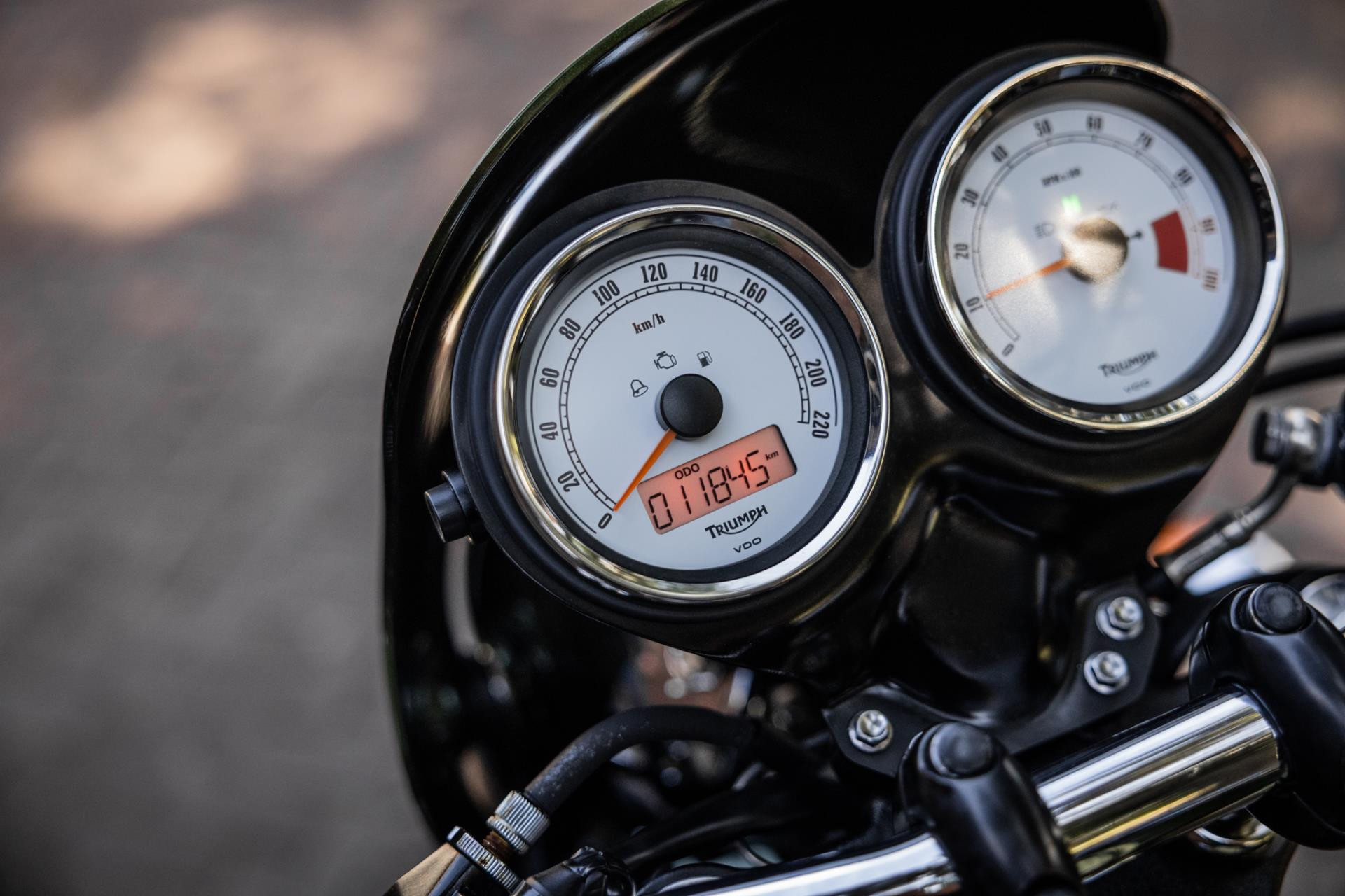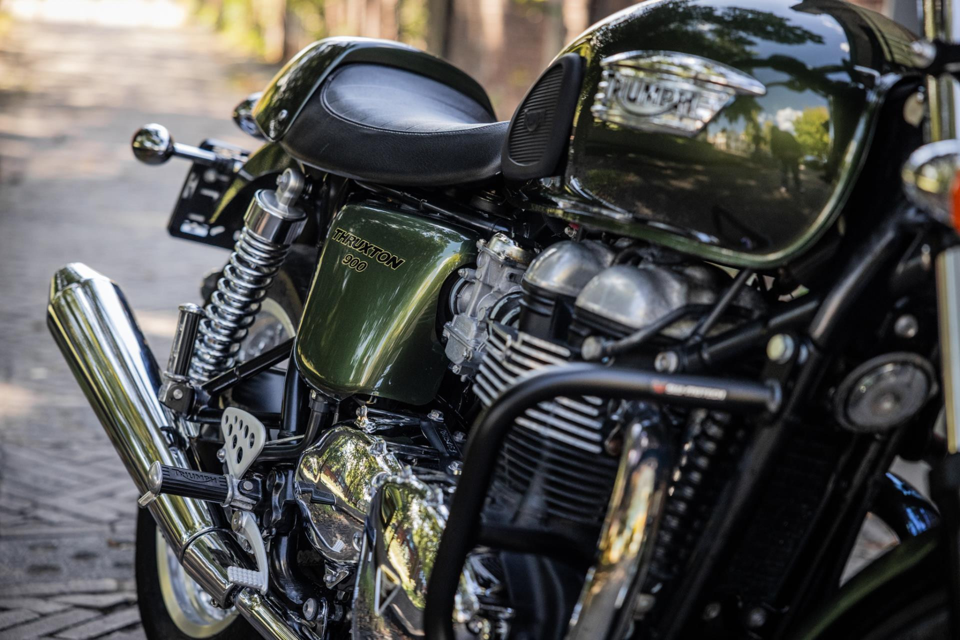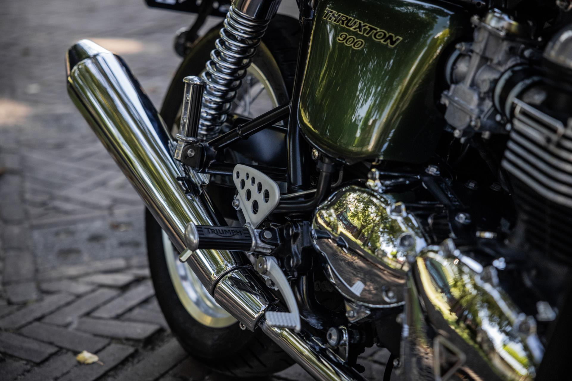Onder het zadel ligt namelijk een 865cc luchtgekoelde parallel-twin die goed is voor 69 pk. Dankzij het lage gewicht van 219 kg en de korte overbrengingen sprint deze Thruxton in slechts 5 seconden naar de 100 km/u. De rijbeleving is direct, levendig en karaktervol – precies zoals je dat van een echte Triumph mag verwachten. De motor voelt perfect in balans, zowel in de stad als op bochtige dijkwegen.