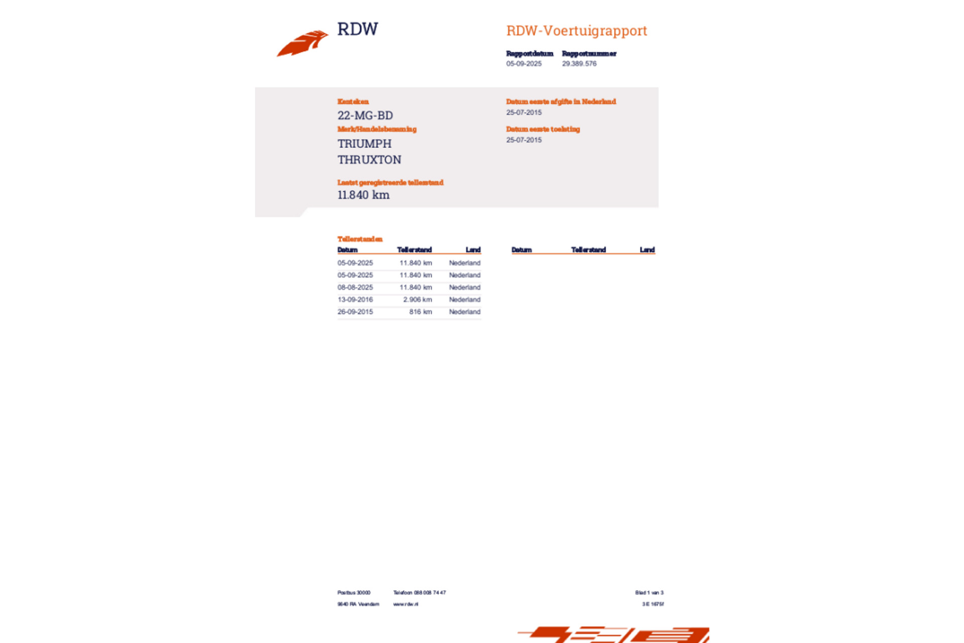 Wat specifiek deze Triumph uniek maakt is de lage kilometerstand. Met slechts 11.845 km is de staand aantrekkelijk laag. Bovendien is de Thruxton origineel Nederlands geleverd. De eerste eigenaar reed de motor van 2015 tot en met 2018 en de laatste kocht hem in 2018 en reed hem tot recent.