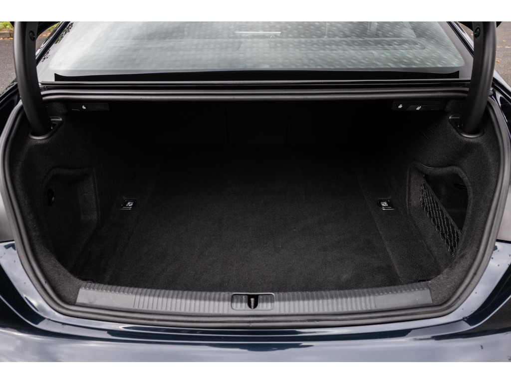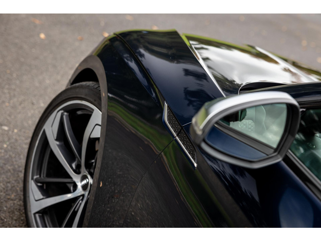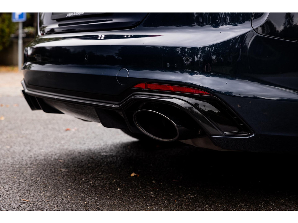 Oog in oog met de RS5. De uitstraling is agressief en imponerend, maar in deze unieke samenstelling ook chique en klassiek. Bij Audi kon je uit luxe Exclusive lakken kiezen, maar in dit geval is het een customized Exclusive lak waar geen kleurcode voor bestaat en ook geen officiele benaming. De prachtige diep donkerblauwe lak is een parelmoerlak en combineert prachtig met de fraaie gepolijste RS velgen. De zwarte elementen contrasteren fraai. En dan die twee enorme stortkokers aan de achterzijde waaruit de machtige 2.9 bi-turbo V6 zijn gal spuuwt.