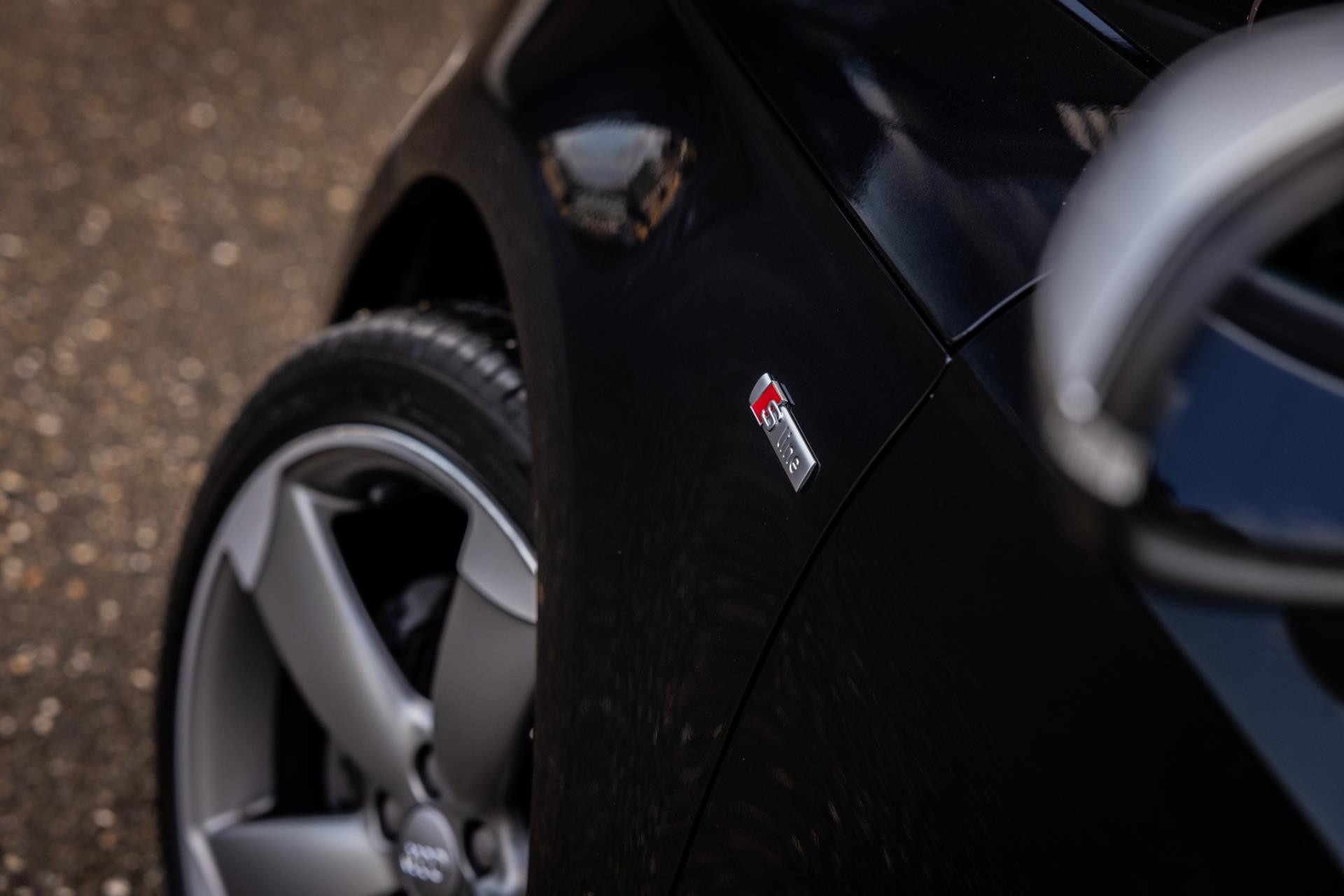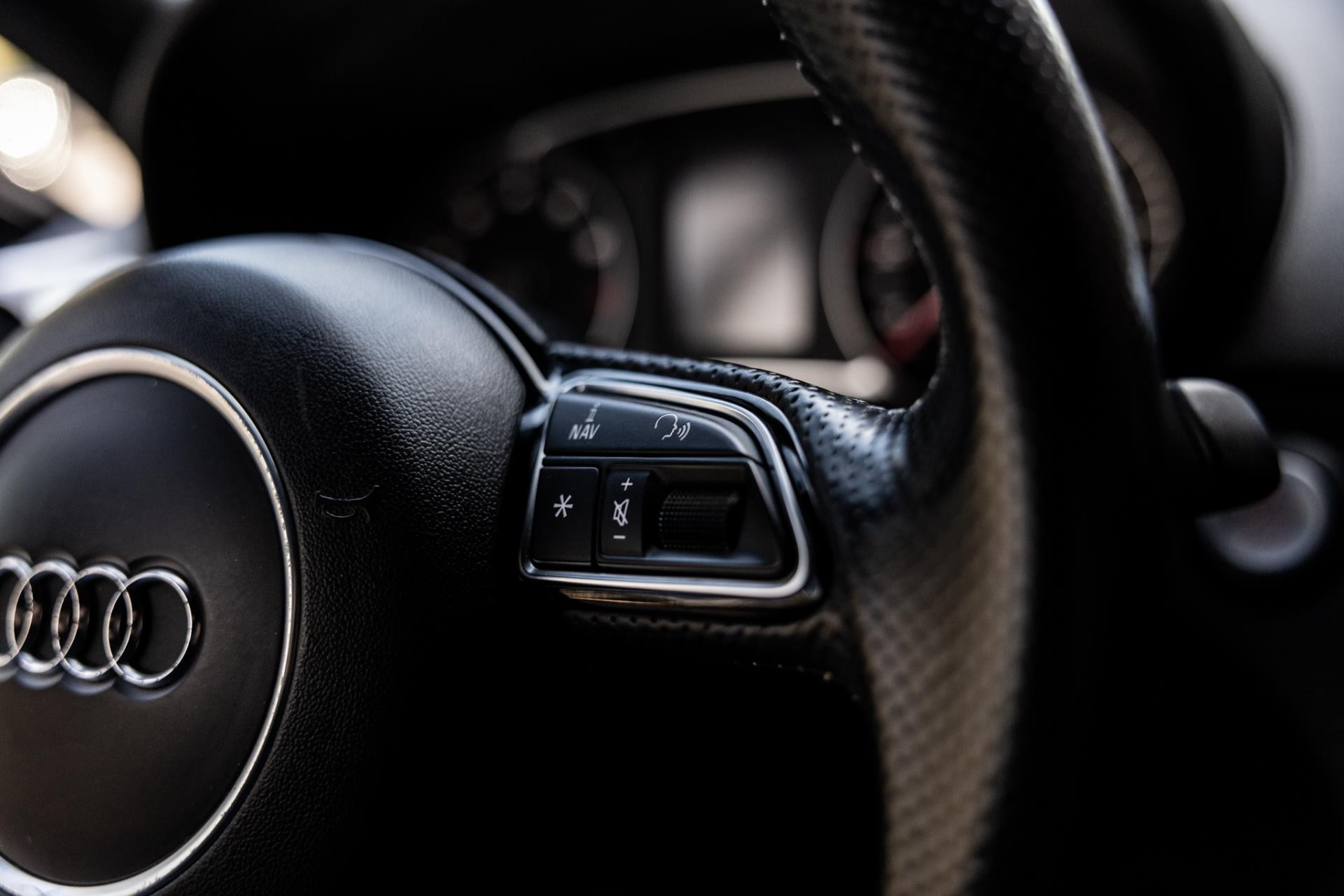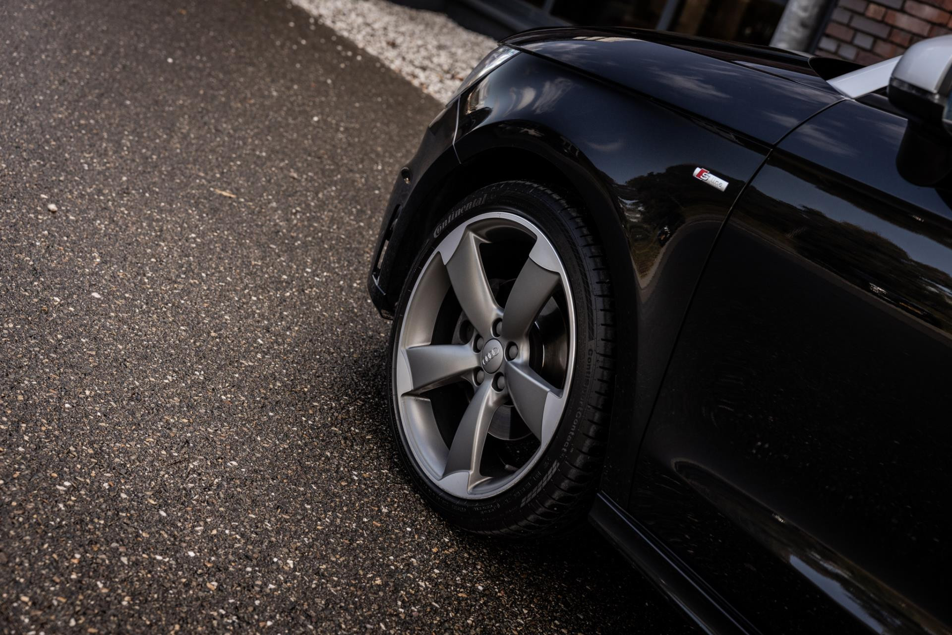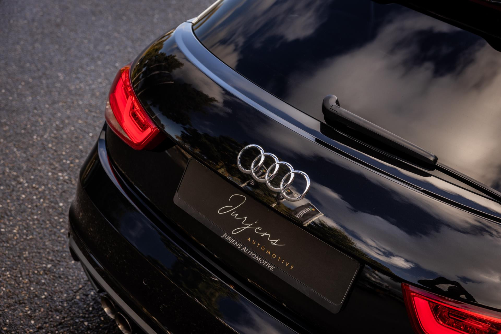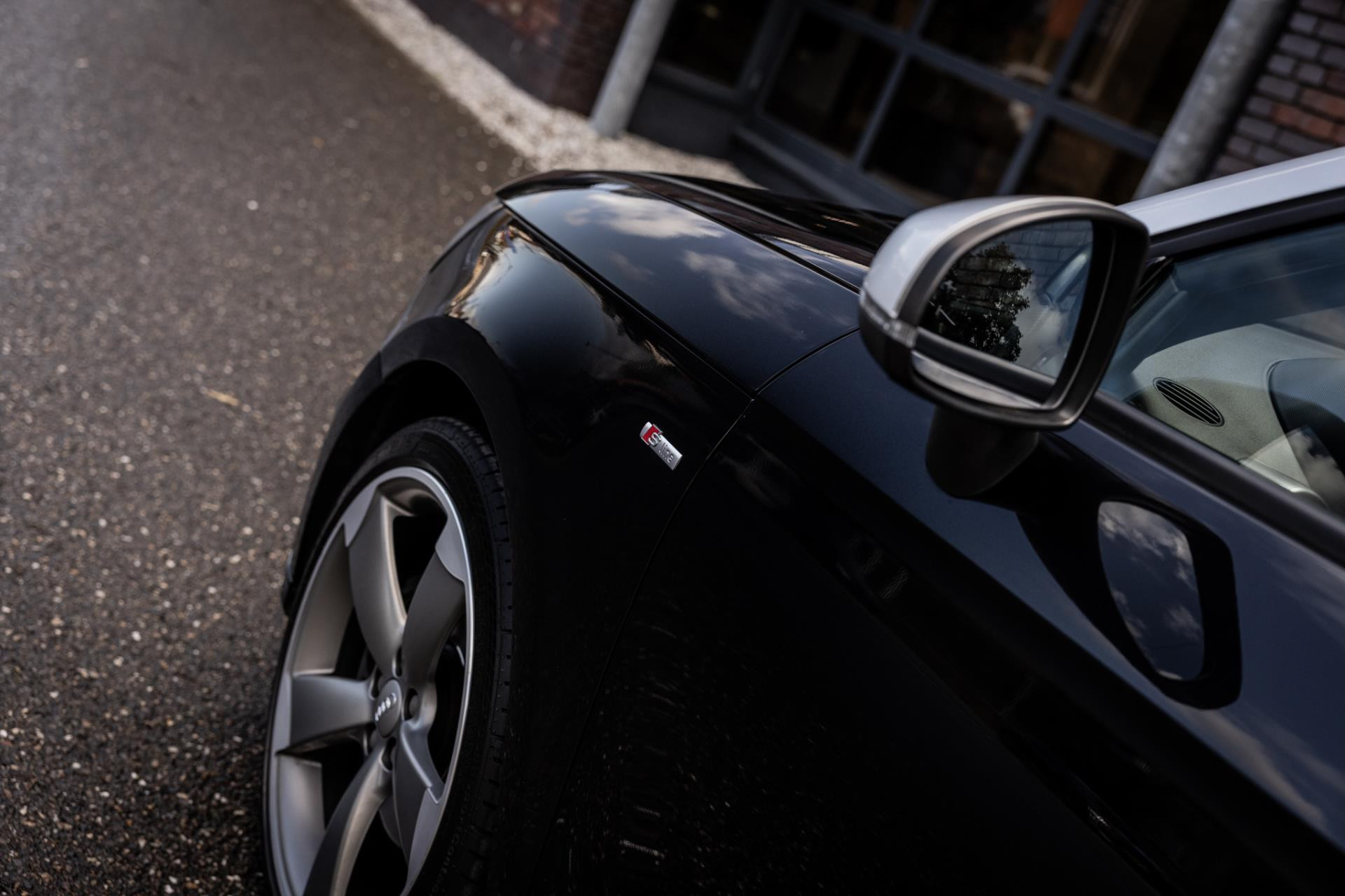 De samenstelling is prachtig. Uiteraard volledig voorzien van S-Line Plus pakket voor zowel het exterieur als interieur. De prachtige kleur Phantomschwarz parelmoerlak is gecombineerd met de Iceberg Silber metallic dakbogen en spiegels en staan fraai. In dit geval met de originele Audi 18” Rotor velgen in Titanium en gepolijste randen en uiteraard Xenon koplampen met LED verlichting rondom. Het S-Line Plus pakket voorziet in imposante bumpers aan voor- en achterzijde waarbij achter de grijze diffuser opvalt. Uiteraard zijn de sideskirts ook breder bij het S-Line Plus pakket.