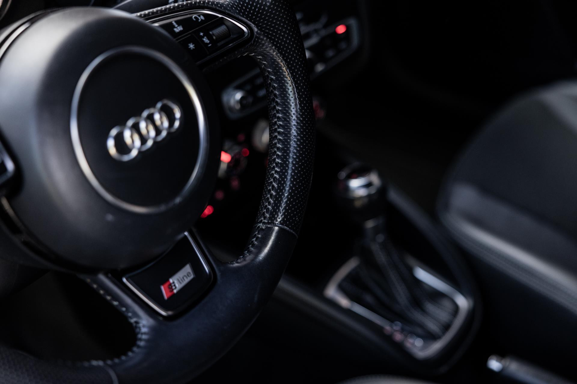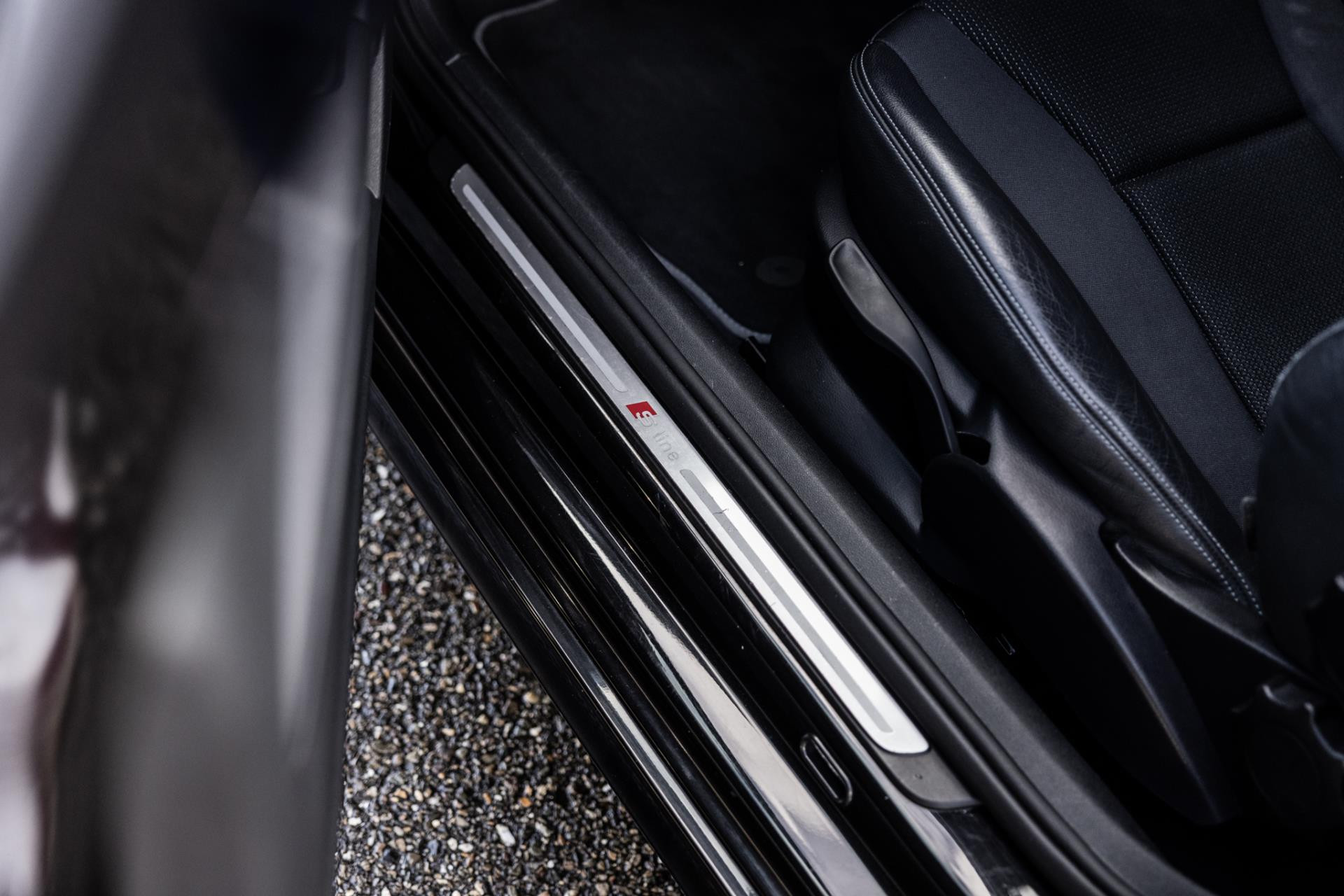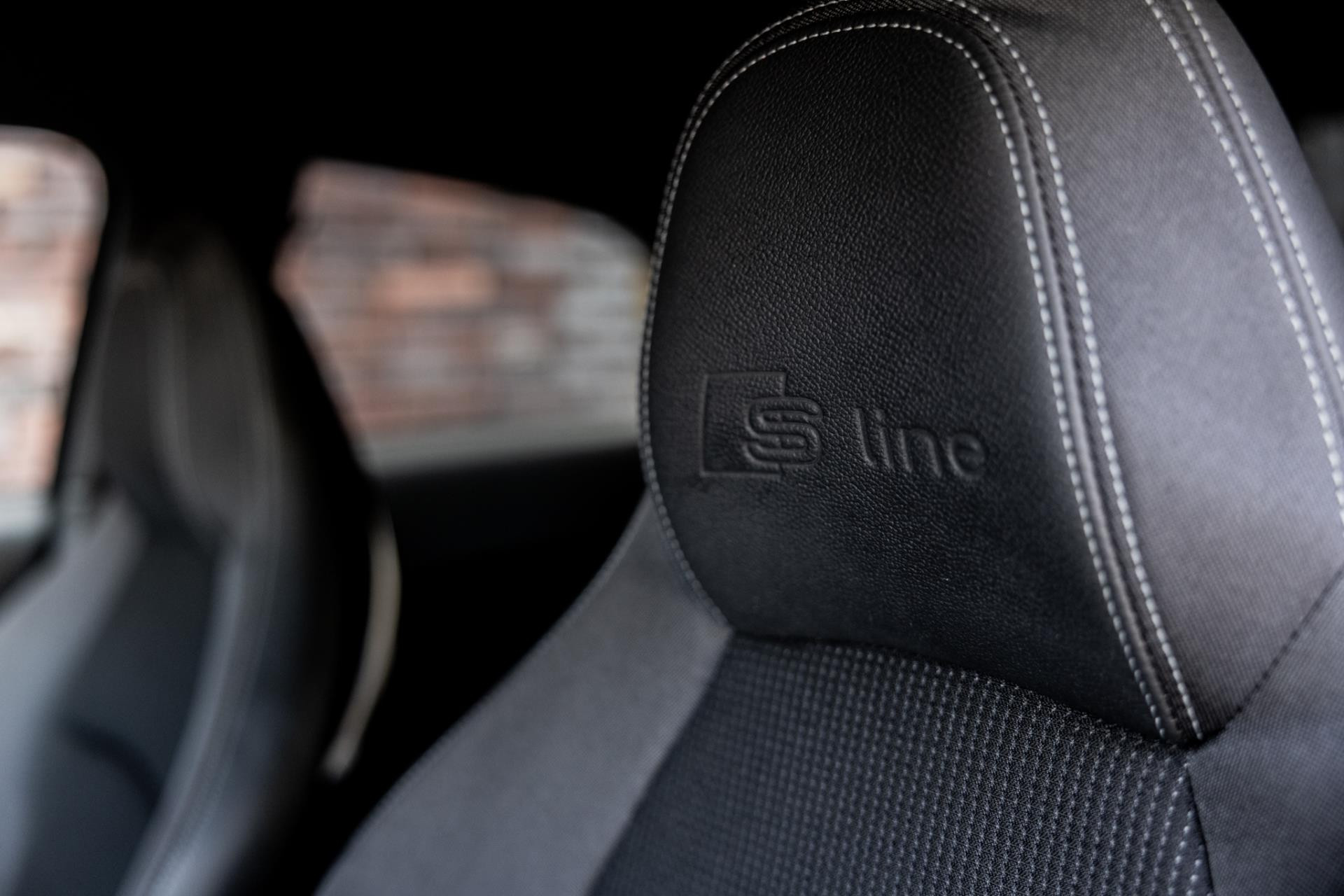 In het interieur gaat het feest door. Direct vallen de zelden gezien S Sportzetels op. Deze zijn veel fraaier dan de standaard S-Line sportstoelen. Deze schaalstoelen zijn bekleed in Leer gecombineerd met Sprint textiel en gave witte stiksel en de achterzijde is gespoten in hoogglans zwart. Het S-Line sportstuurwiel is voorzien van geperforeerd leder en het S-Line embleem. Verder zijn de ventilatieroosters voorzien van het Audi Exclusive aluminium.