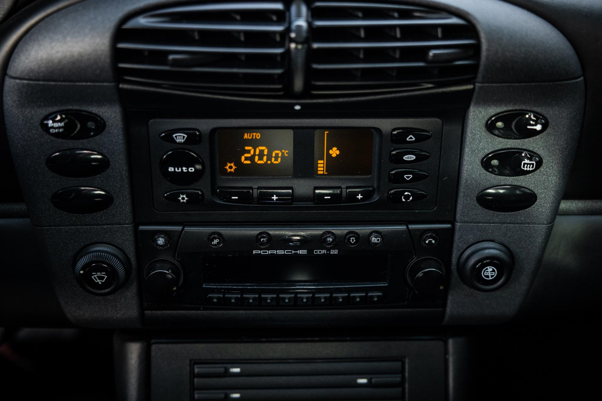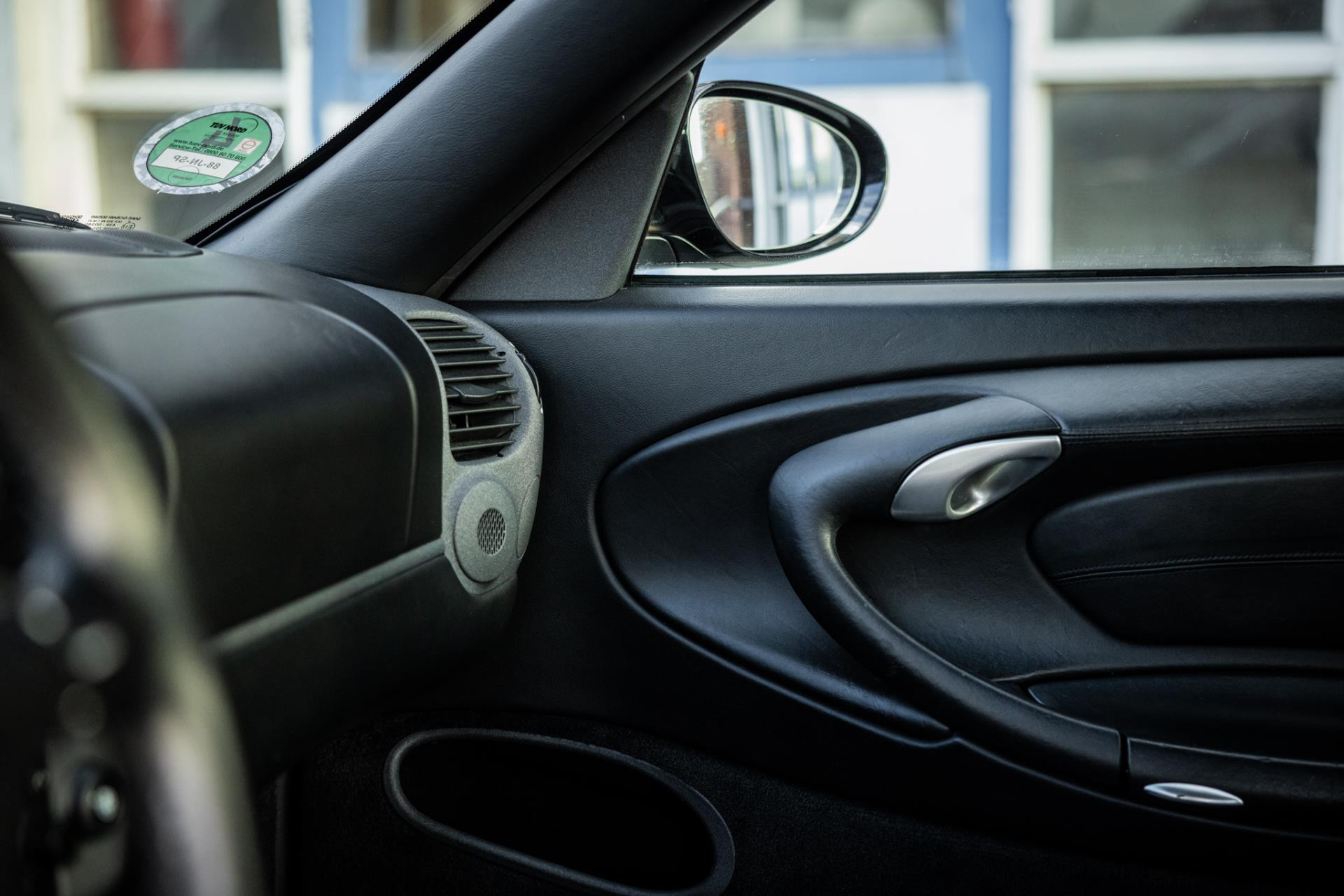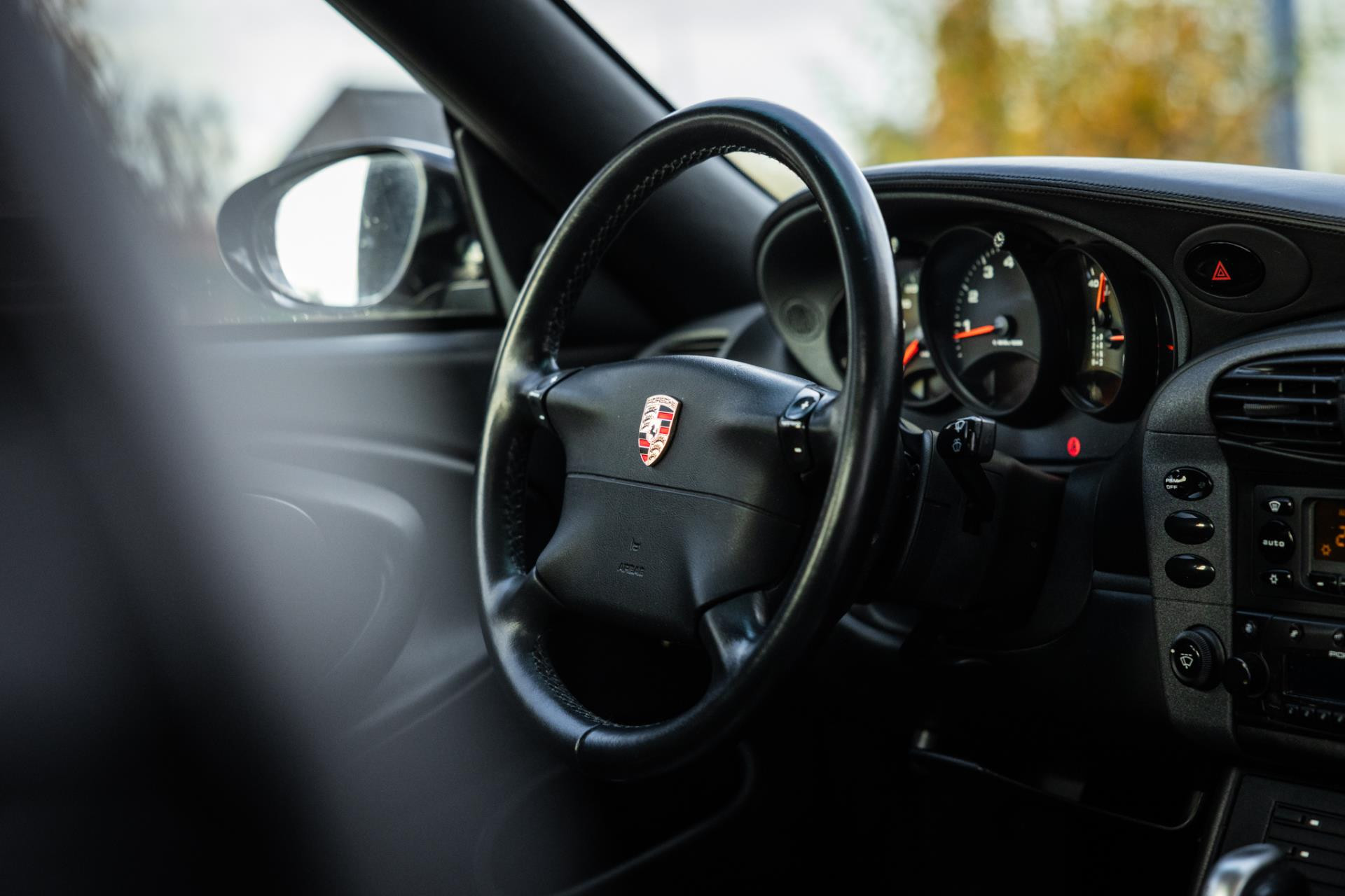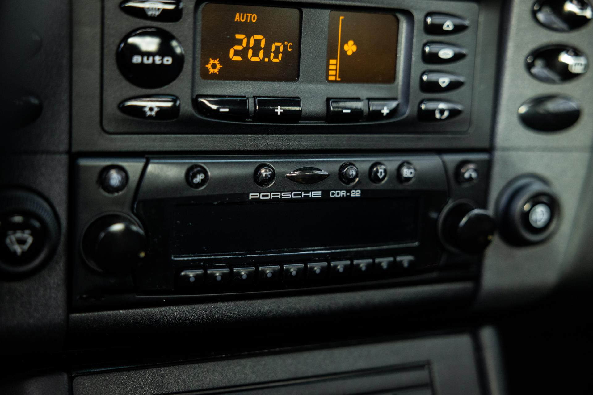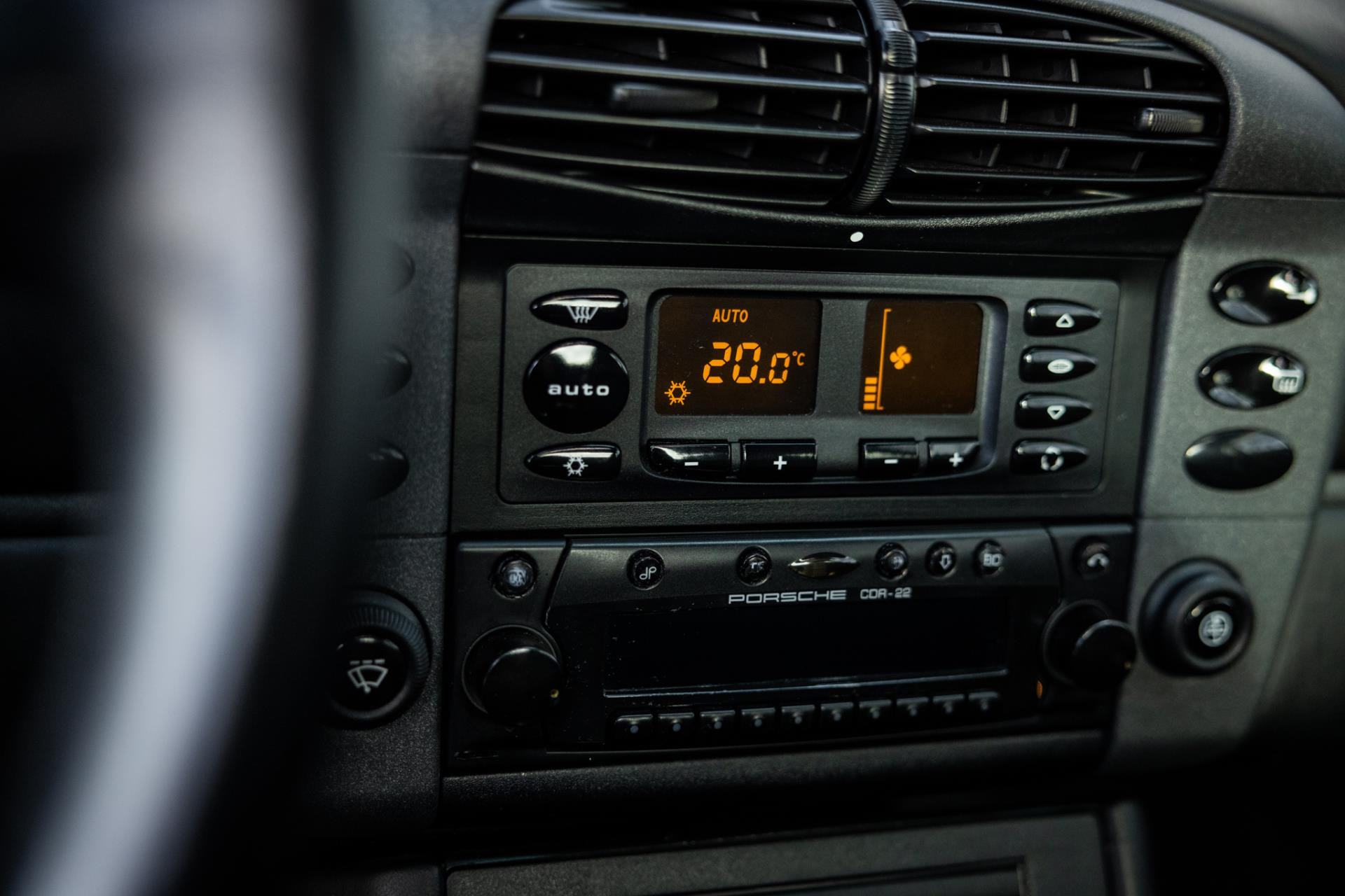 Binnenin zien we veel luxe. Vooral als je de auto plaats in de tijdgeest van eind jaren 90. Deze 996 is voorzien van elektrische verstelbare sportzetels met memory, stoelverwarming en fraai zwart lederen bekleding. De middenconsole behelst het origineel Porsche audiosysteem en de bediening van de automatische airconditioning. De automaat kan handbediend worden door de TipTronic toetsen op het stuurwiel. Hel fijne optie is het schuif-/ kanteldak.