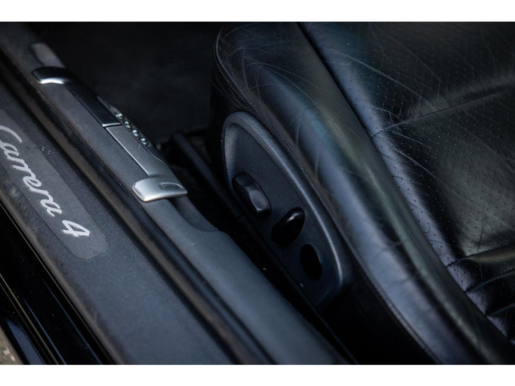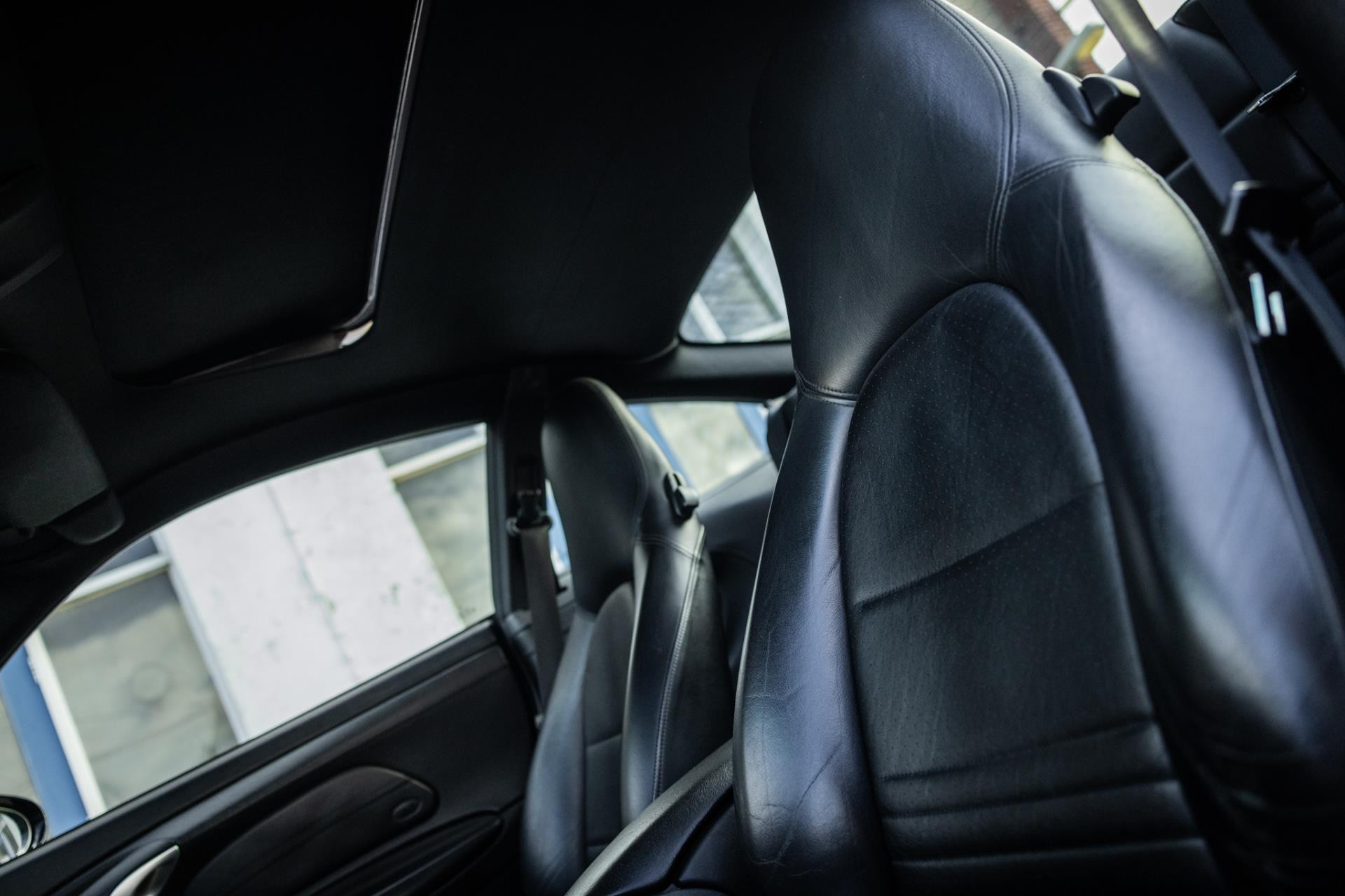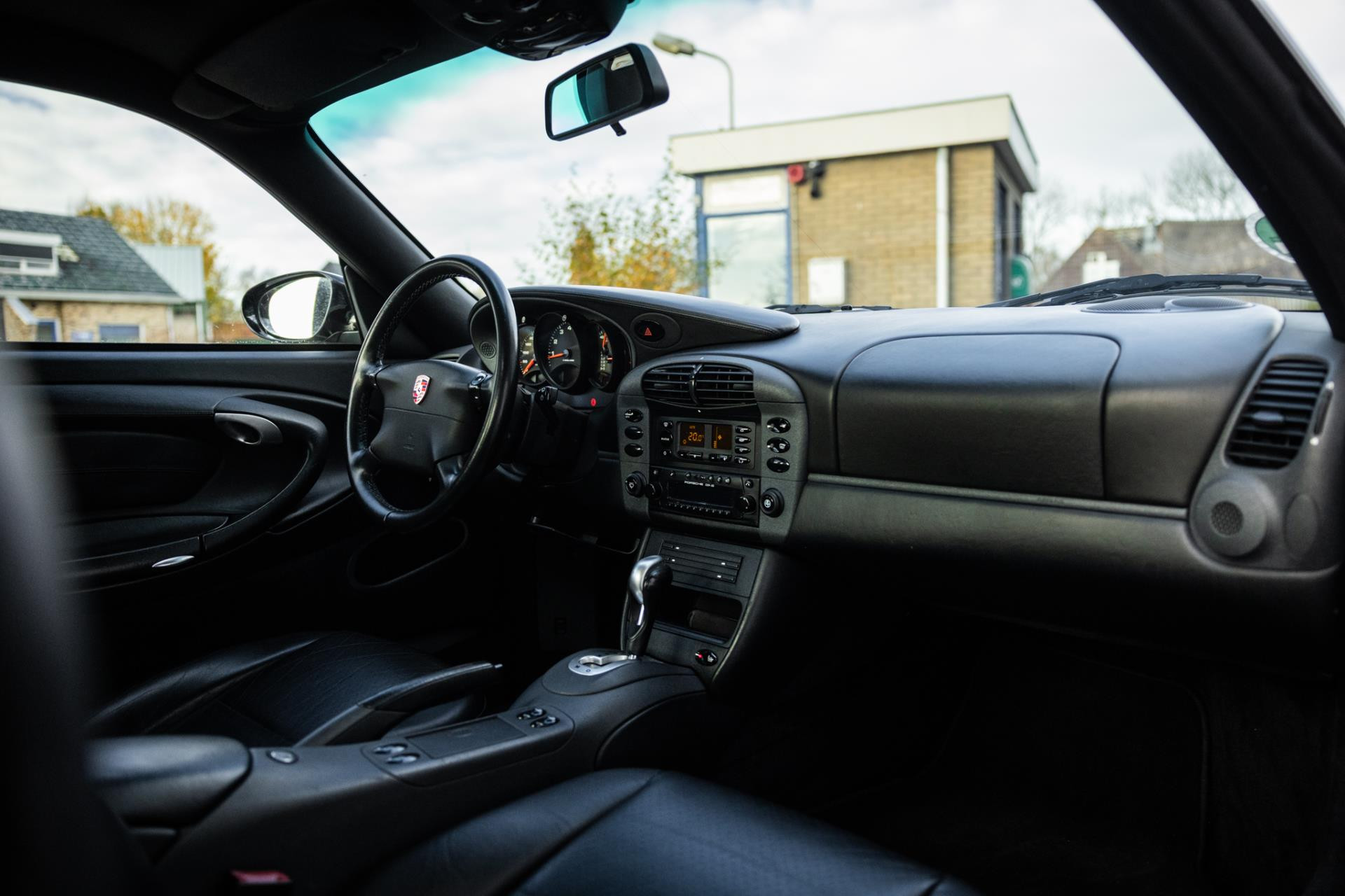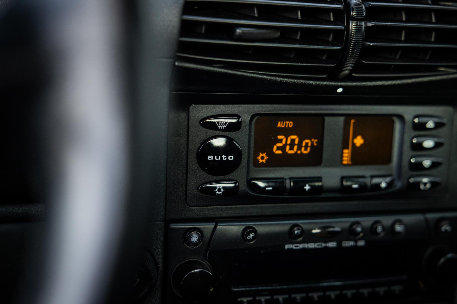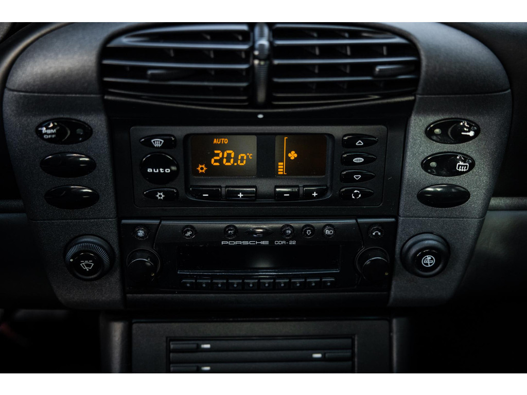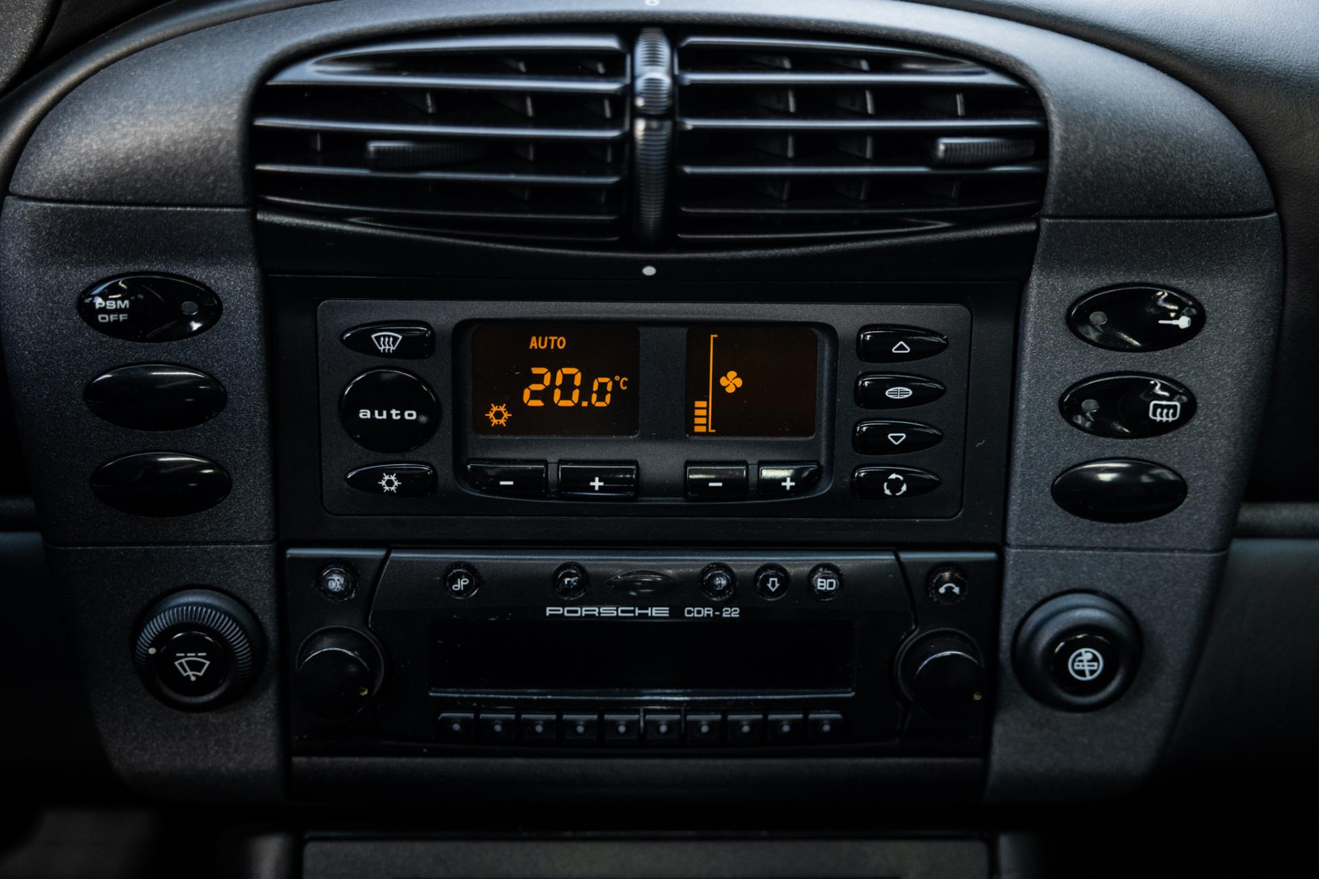 Binnenin zien we veel luxe. Vooral als je de auto plaats in de tijdgeest van eind jaren 90. Deze 996 is voorzien van elektrische verstelbare sportzetels met memory, stoelverwarming en fraai zwart lederen bekleding. De middenconsole behelst het origineel Porsche audiosysteem en de bediening van de automatische airconditioning. De automaat kan handbediend worden door de TipTronic toetsen op het stuurwiel. Hel fijne optie is het schuif-/ kanteldak.