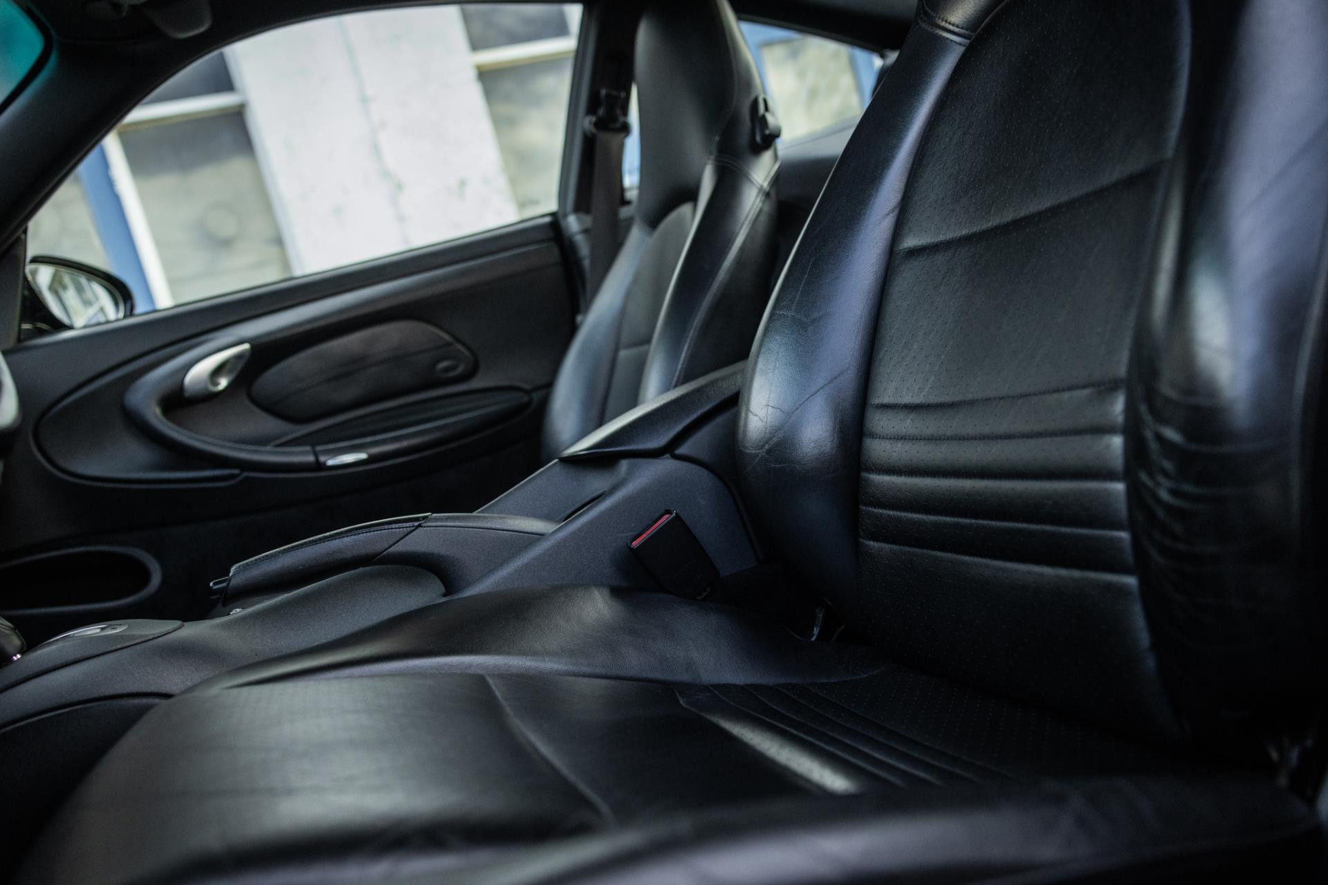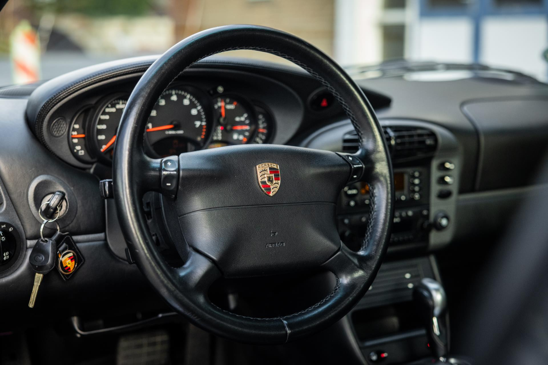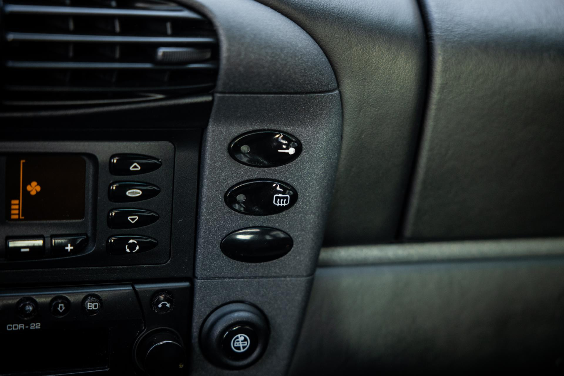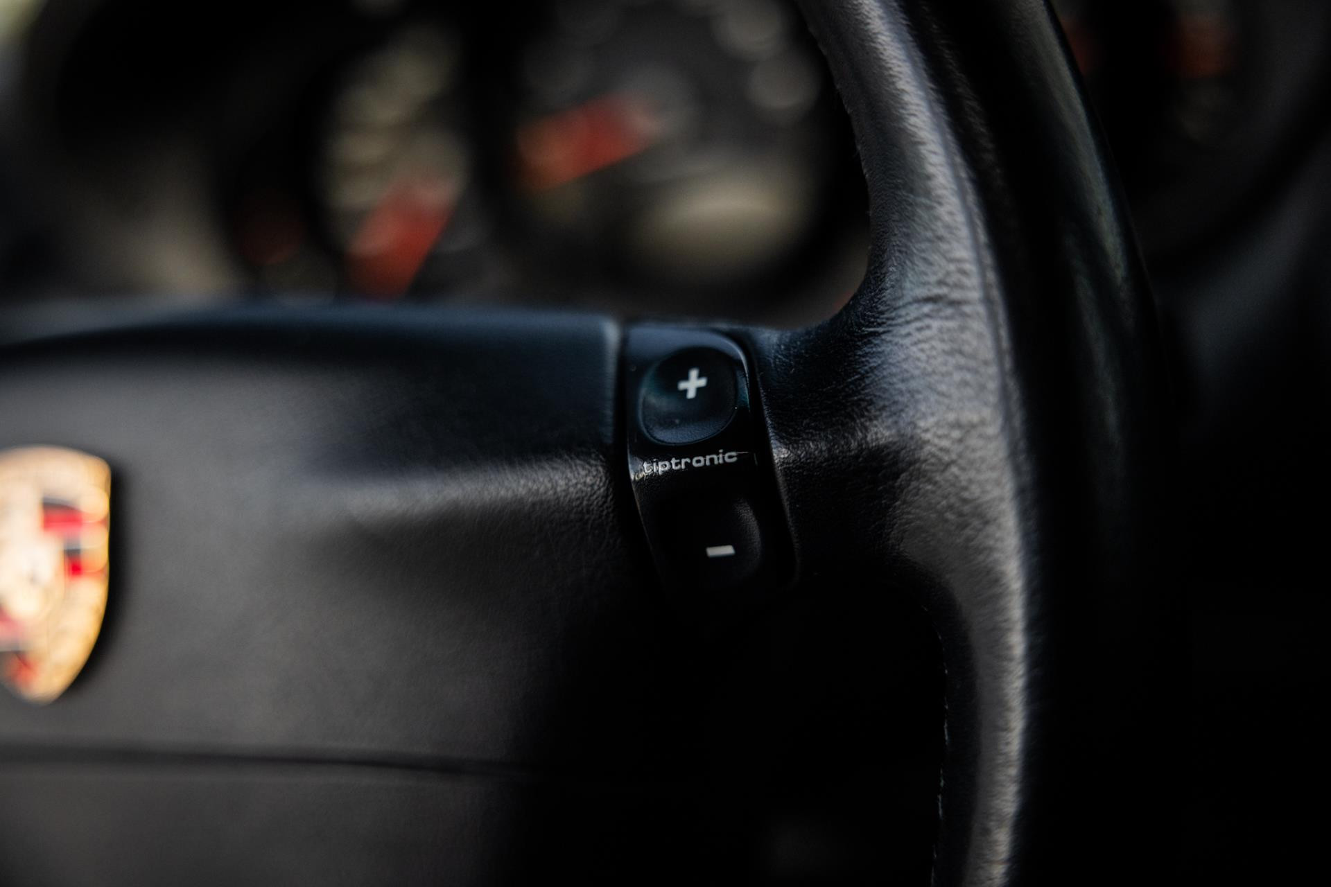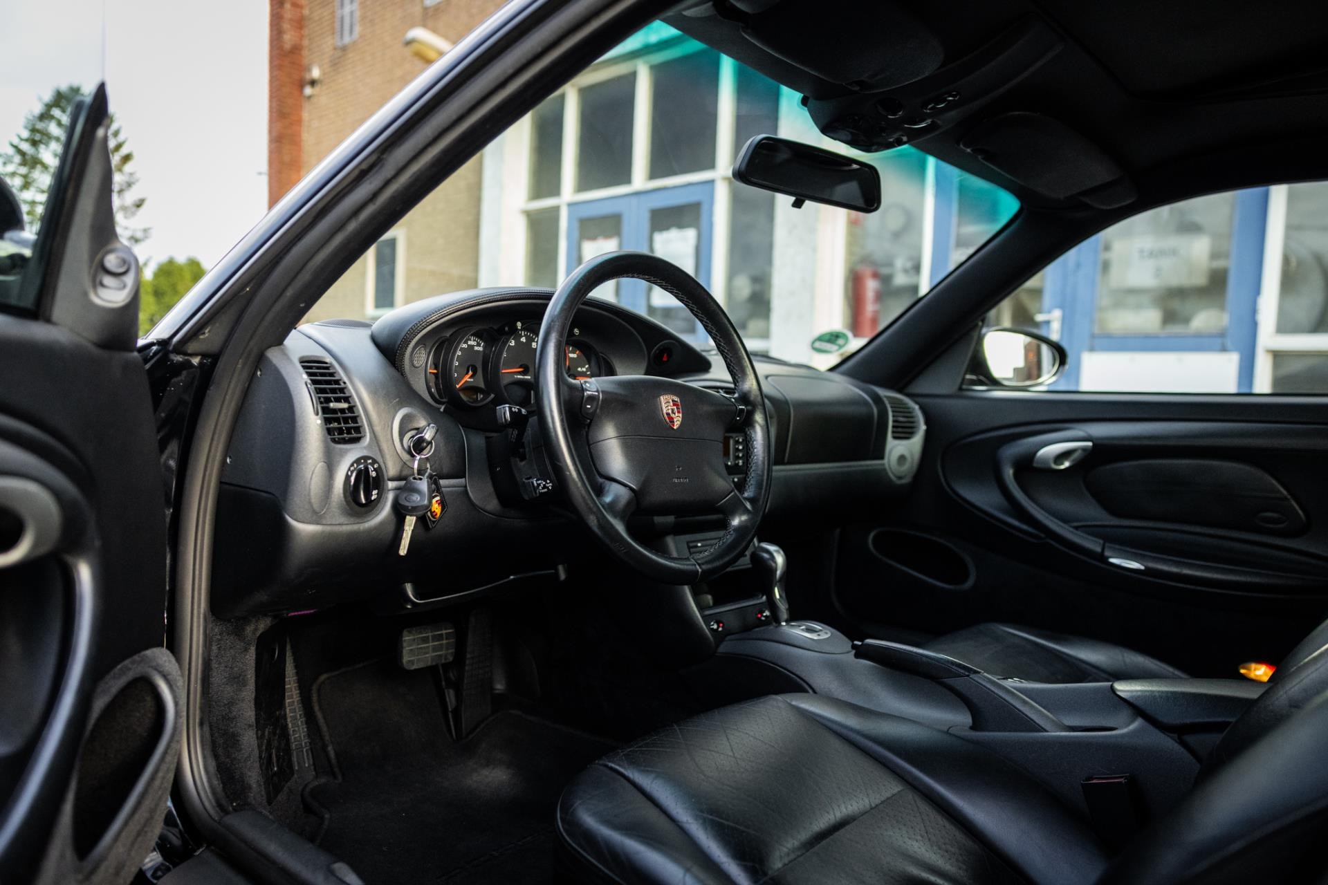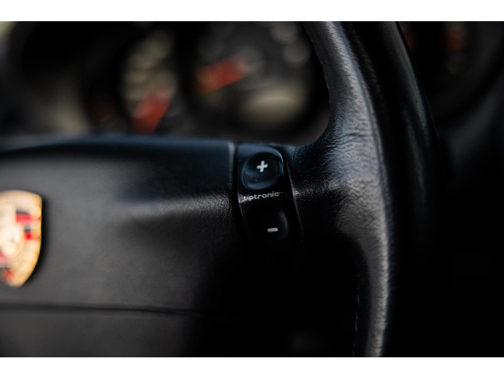 Binnenin zien we veel luxe. Vooral als je de auto plaats in de tijdgeest van eind jaren 90. Deze 996 is voorzien van elektrische verstelbare sportzetels met memory, stoelverwarming en fraai zwart lederen bekleding. De middenconsole behelst het origineel Porsche audiosysteem en de bediening van de automatische airconditioning. De automaat kan handbediend worden door de TipTronic toetsen op het stuurwiel. Hel fijne optie is het schuif-/ kanteldak.