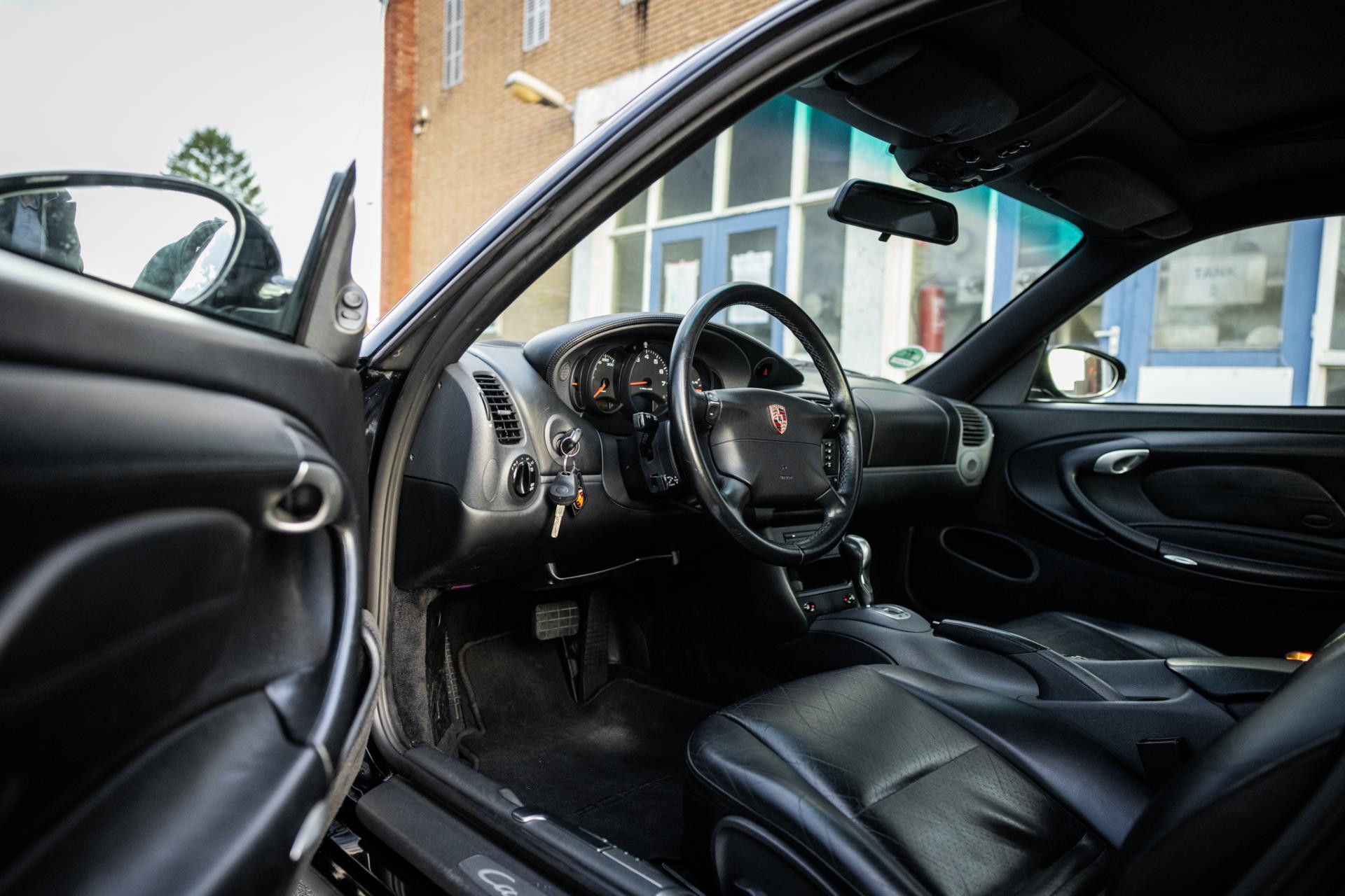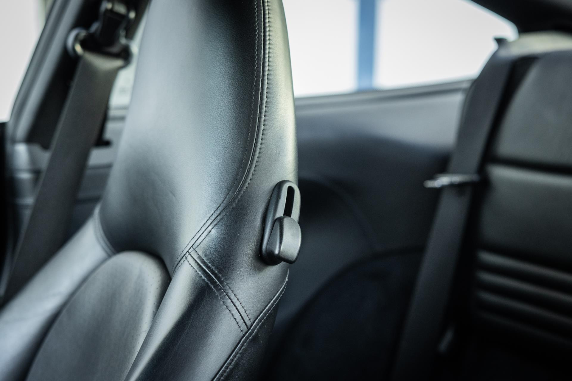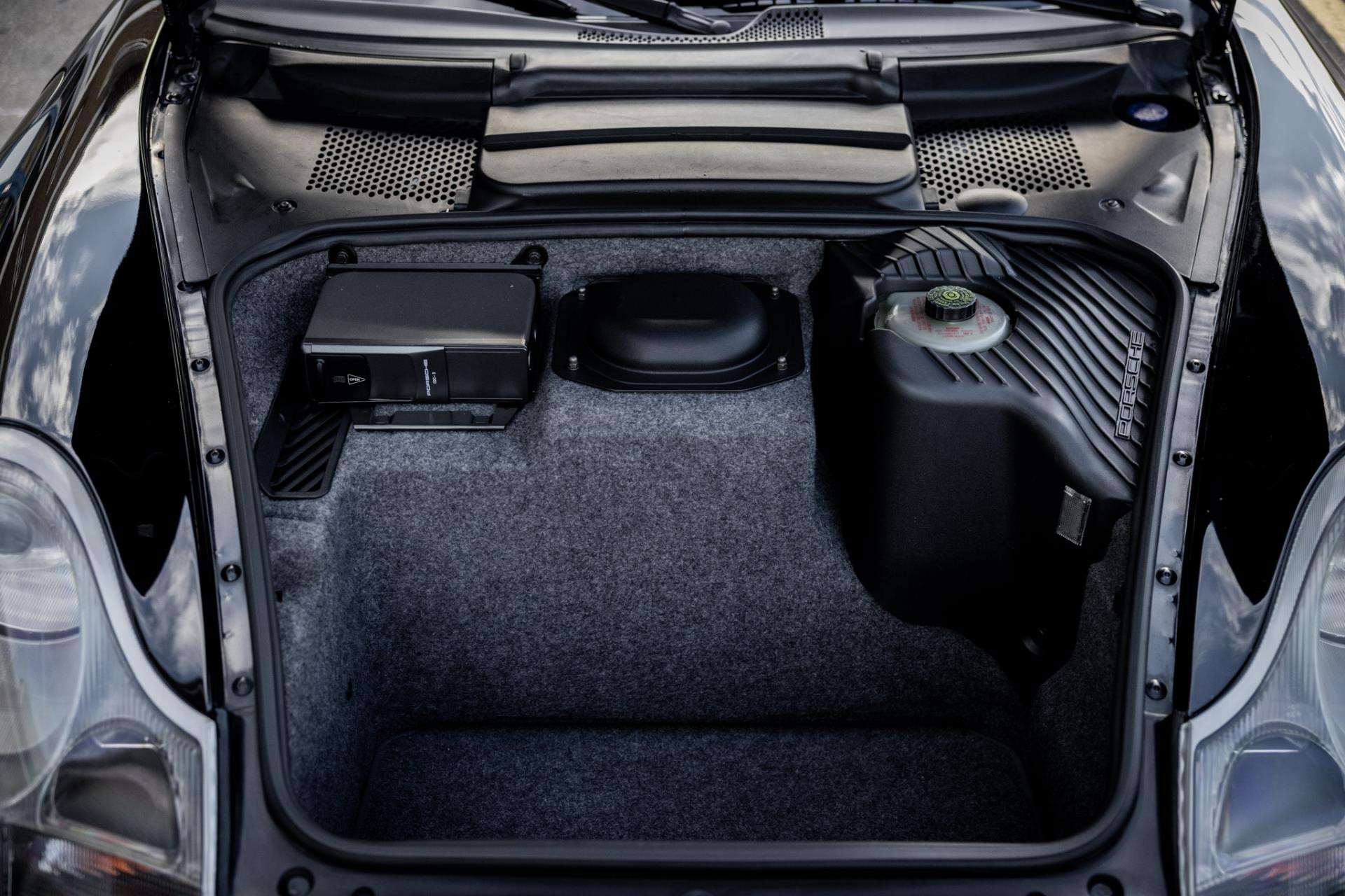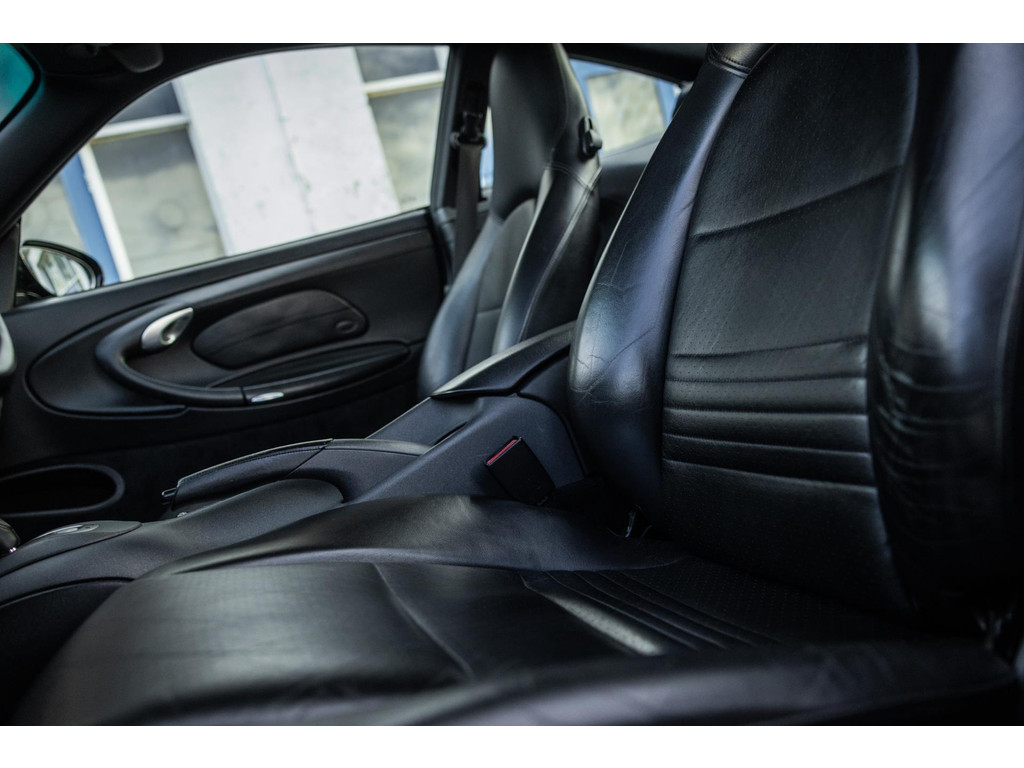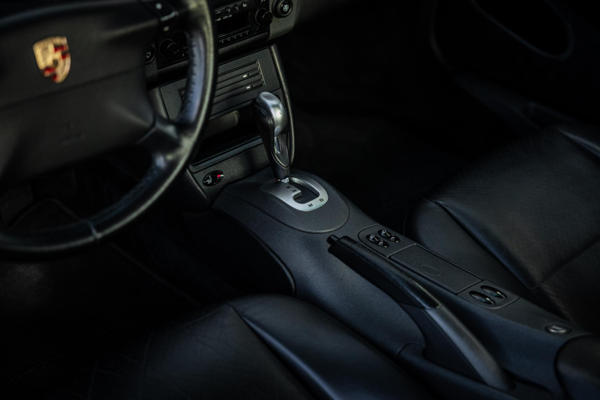 Binnenin zien we veel luxe. Vooral als je de auto plaats in de tijdgeest van eind jaren 90. Deze 996 is voorzien van elektrische verstelbare sportzetels met memory, stoelverwarming en fraai zwart lederen bekleding. De middenconsole behelst het origineel Porsche audiosysteem en de bediening van de automatische airconditioning. De automaat kan handbediend worden door de TipTronic toetsen op het stuurwiel. Hel fijne optie is het schuif-/ kanteldak.