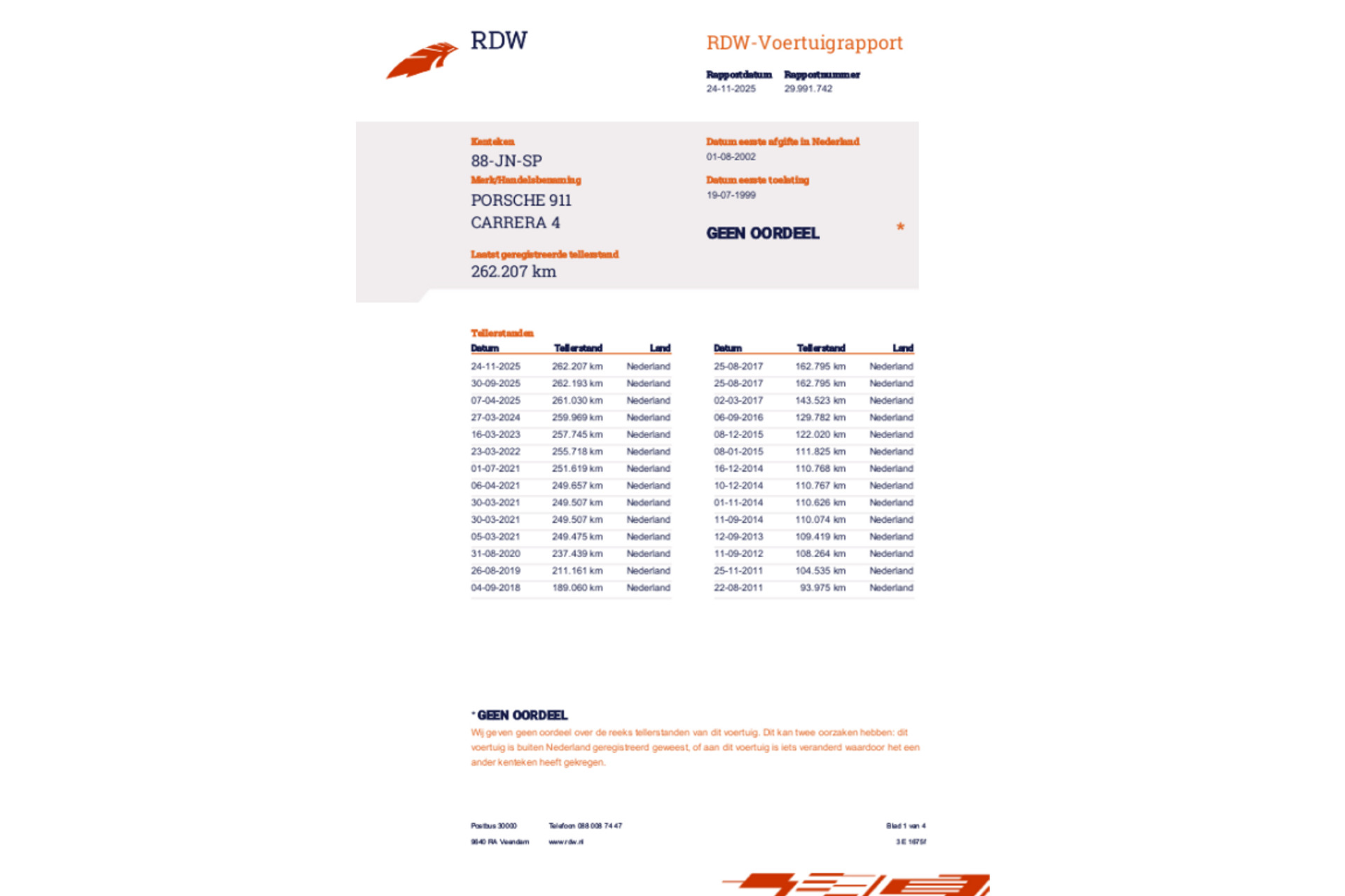 Ondanks de forse kilometerstand ziet de 911 er zeer netjes uit. Duidelijk is dat de auto immer met grote zorg en liefde behandeld en bereden is. Het onderhoud is zeer uitgebreid gedocumenteerd middels een vrijwel volledig afgestempeld onderhoudsboekje en diverse facturen. Daarnaast is eer RDW Tellerrapport aanwezig om de kilometerhistorie inzichtelijk te maken. De 911 werd in 1999 nieuw in Oostenrijk geleverd en sinds 2002 in Nederland.