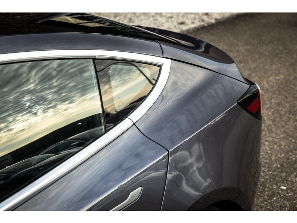 De Model 3 is geleverd in de chique kleur – Midnight Silver metallic. Gecombineerd met het zwart lederen interieur, het zwarte dak van het panoramadak en de LED verlichting een zeer fraaie verschijning.