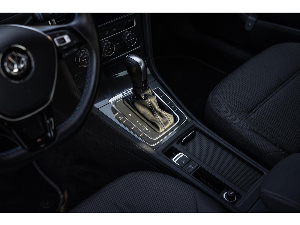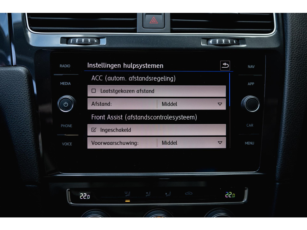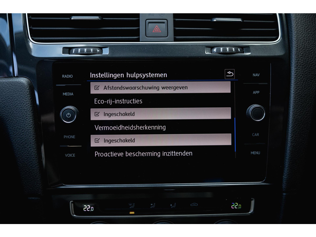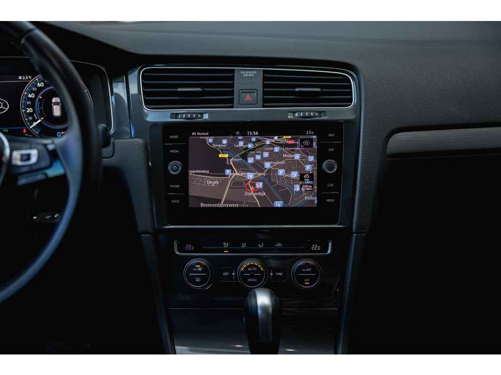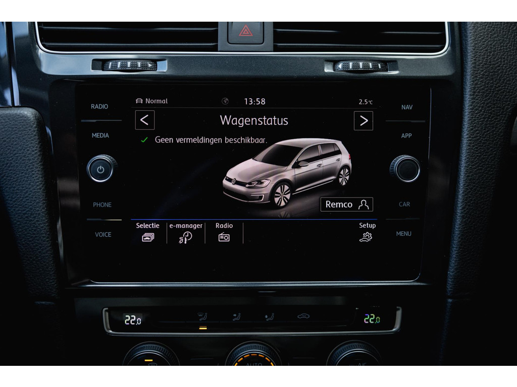 Het comfort is groot. Nauwelijks rijgeluiden, een heerlijke ruime zit in de fijne stoelen en in mijn handen het prachtige met leder beklede stuurwiel vol met knoppen en fraaie blauwe stiknaden. Deze e-Golf is zoals gezegd luxe uitgerust met onder meer alle rijassistenten. Van adaptive cruise control, tot fileassistent en van lane assist tot verkeersbord herkenning. Alles is present. Het grote centrale dipslay is ongekend uitgebreid en behelst onder meer navigatiesysteem, DAB+ digitale radio is present evenals grafische weergave van de parkeersensoren van het parkpilot systeem. In parkeren is een koud kunstje op deze wijze. De verlichting is indrukwekkend. Alles LED uiteraard. De grote LED balken op de onderste hoeken verklappen dat het om een elektrische Golf gaat. Zelfs de dimlichten en grootlicht zijn LED en het grootlicht is volledig automatisch geregeld via camera’s in de voorruit. Verder beschikt de e-Golf over voorruitverwarming en een warmtepomp. Alle informatie omtrent de auto is ook op afstand vanaf de Volkwagen App te verkrijgen.