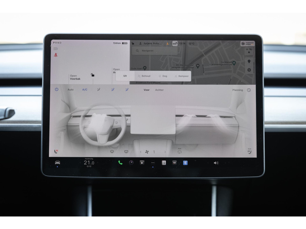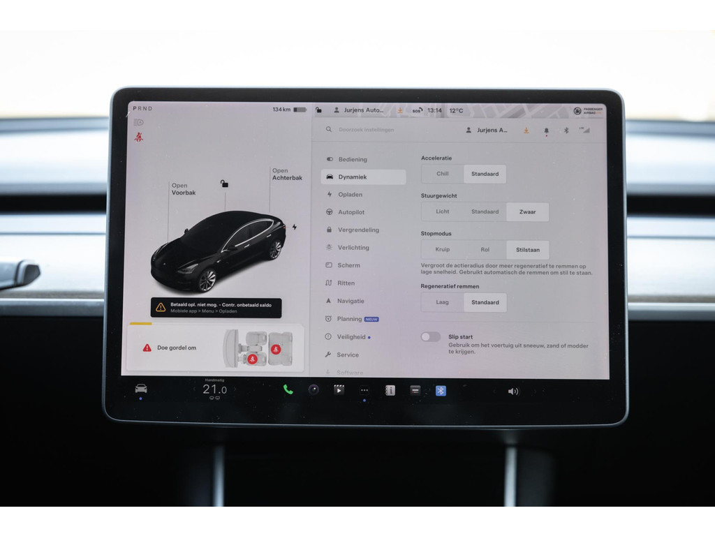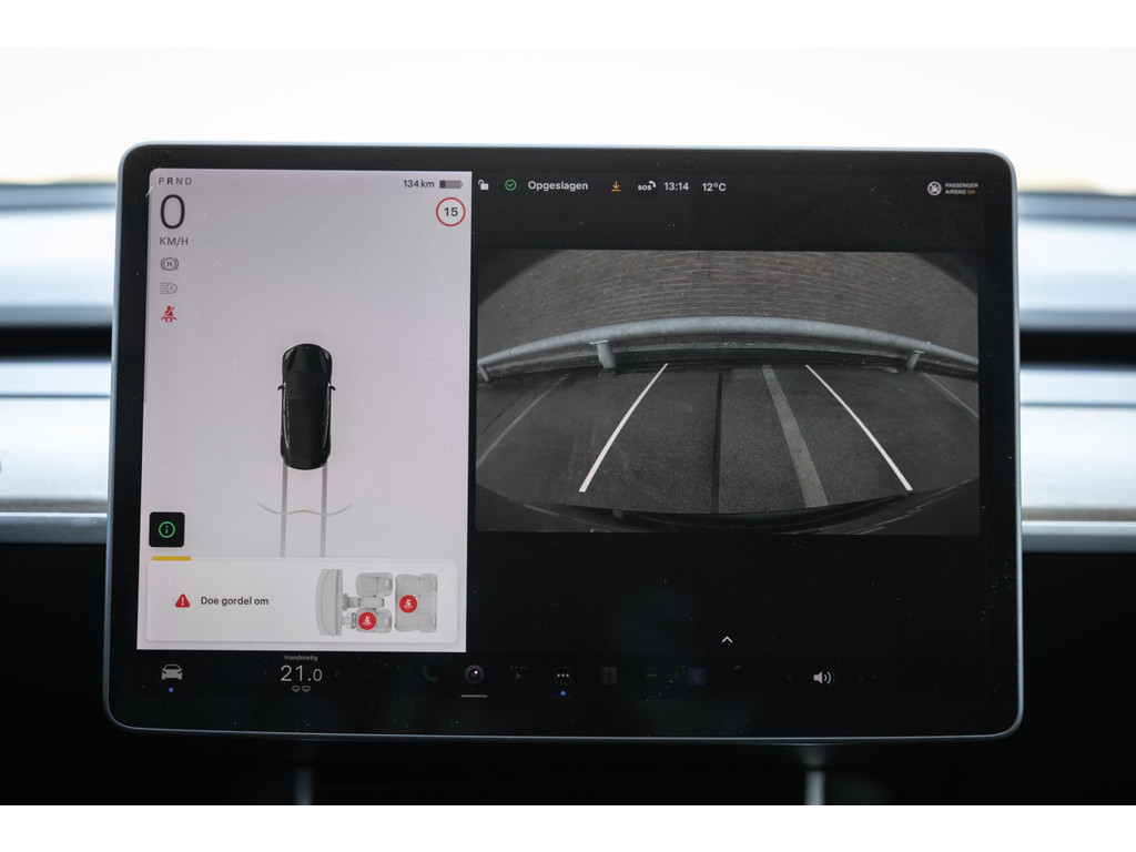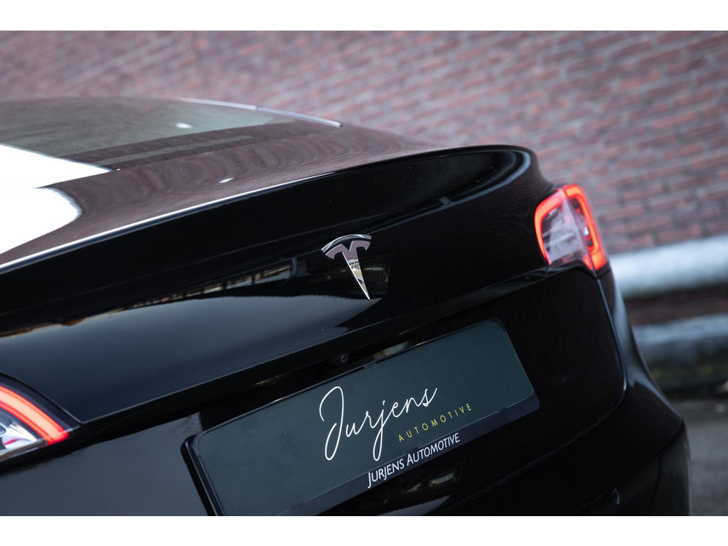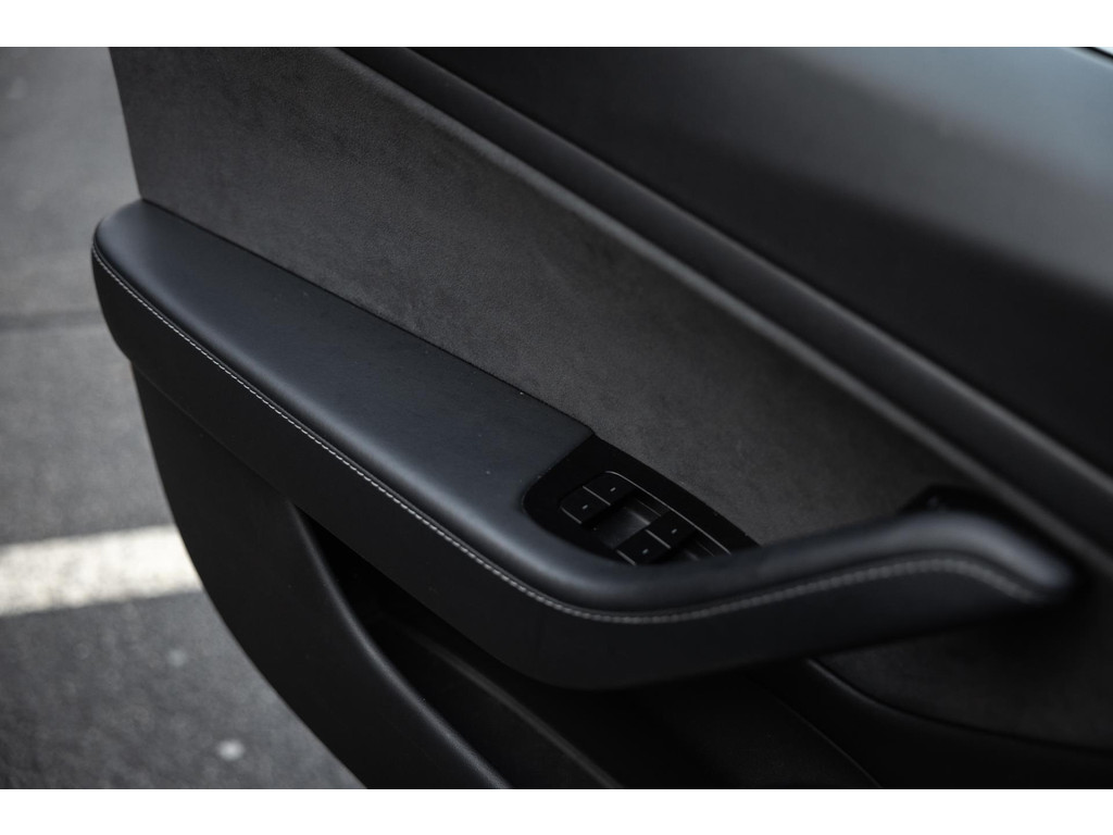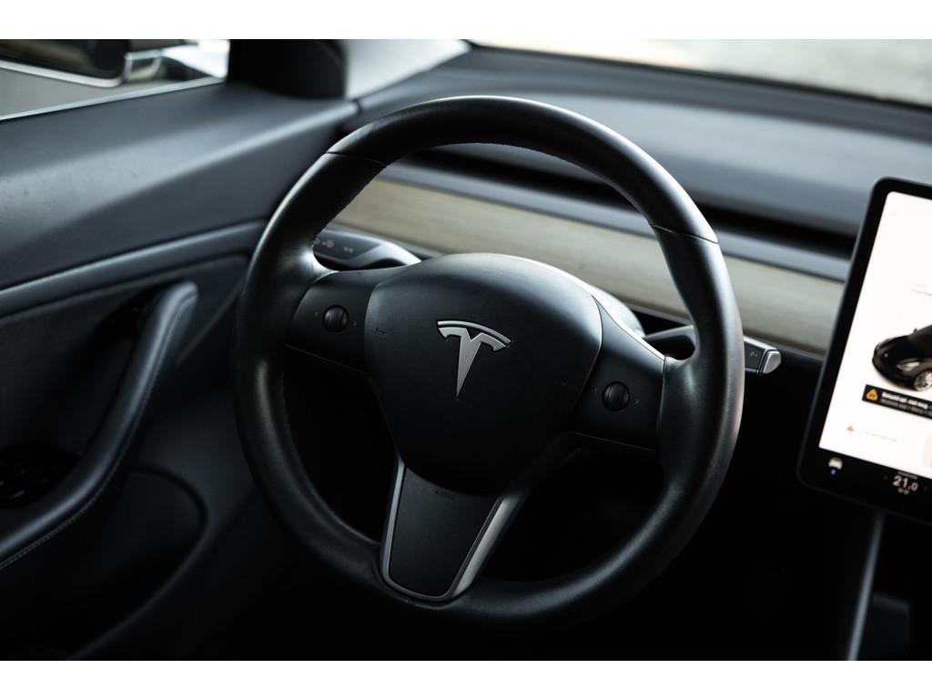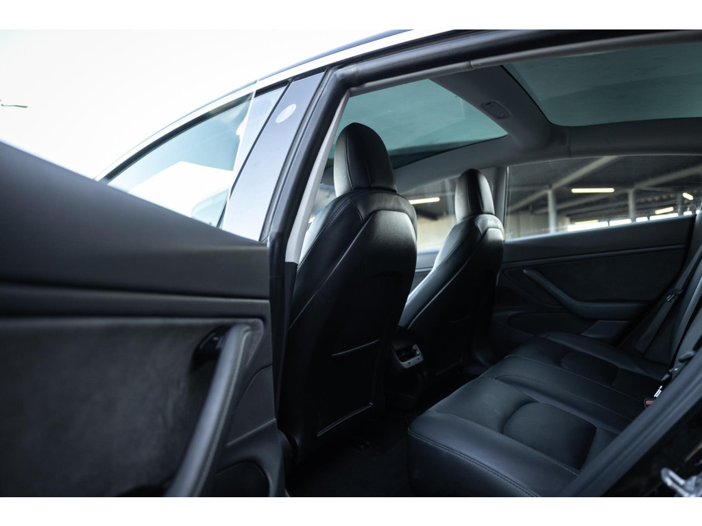 Alle models 3 zijn zo’n beetje gelijkwaardig uitgerust en de standaard ligt hoog. Zo is dit exemplaar voorzien van zwart lederen bekleding. De stoelen zijn elektrisch verstelbaar evenals het stuurwiel. Uiteraard zijn de zetels voorzien van stoelverwarming. Daarnaast een gigantisch glazen panoramadak. Alle verlichting is full LED wat een ongekende lichtopbrengst geeft en voorzien van grootlichtassistent. Het centrale scherm is enorm en biedt een keur aan instellingen, mogelijkheden en luxe. Van data, tot navigatie, van audio tot telefonie en van games tot de meest vreemde mogelijkheden, alles bedien je op het scherm. Uiteraard kent deze Model 3 ook het camerasysteem en is het Premium audiosysteem gekozen. Hel fraai zijn de originele Performance velgen. Niet vaak gezien, maar wel besteld op deze Tesla is de afneembare trekhaak.