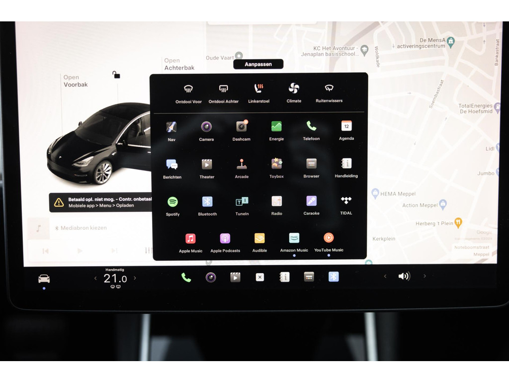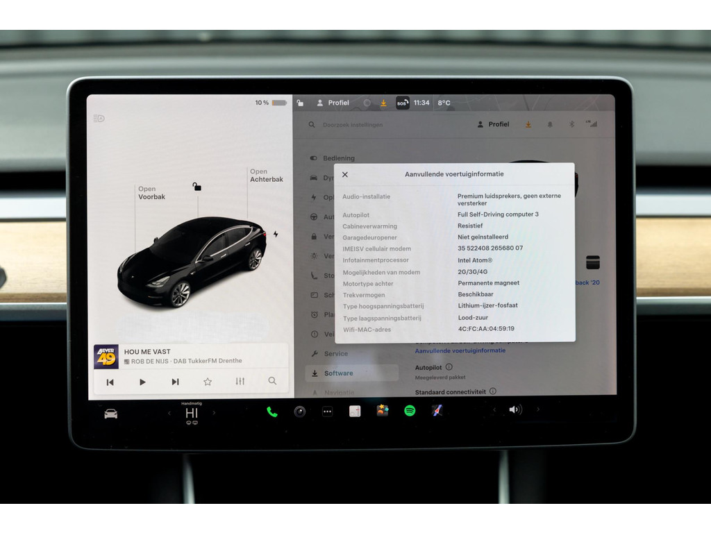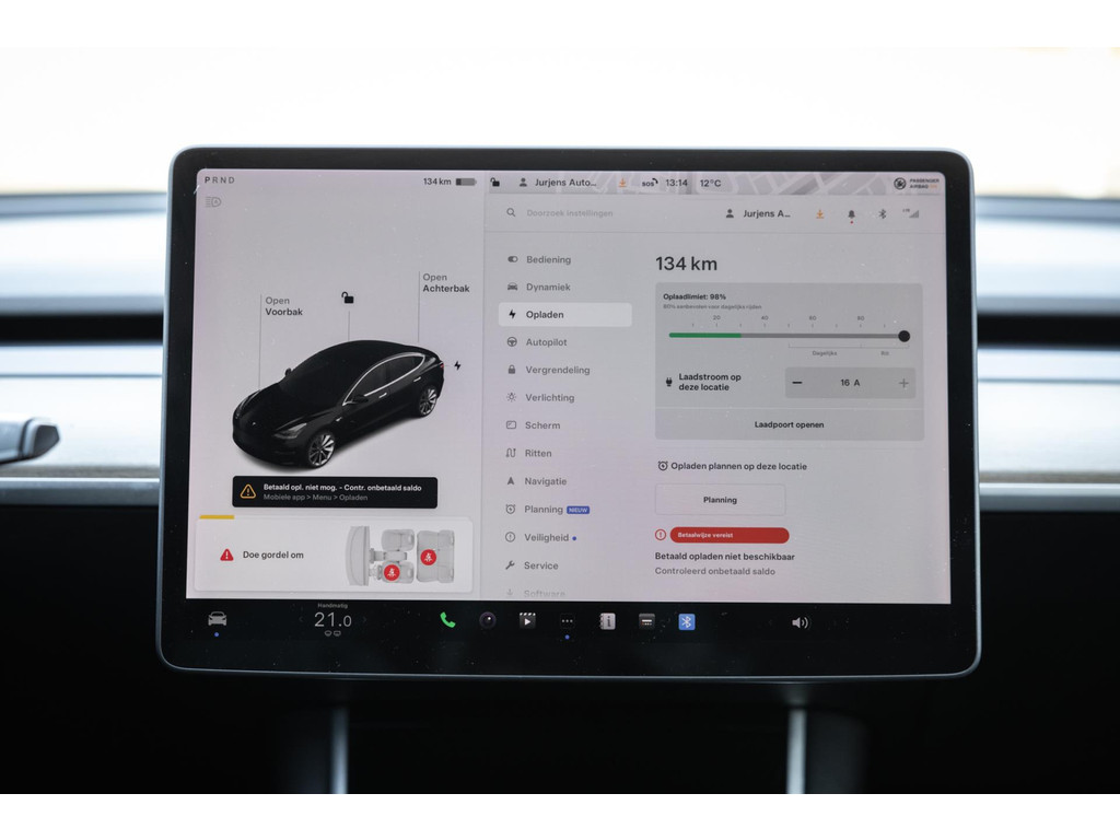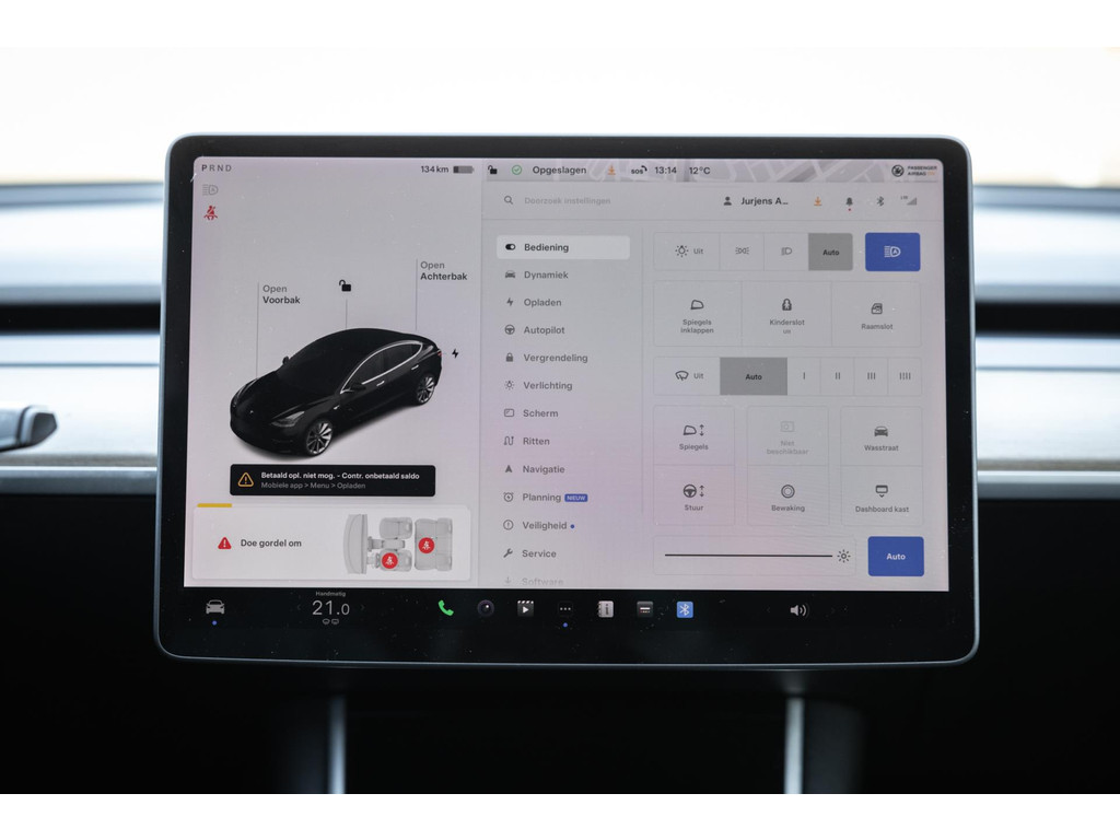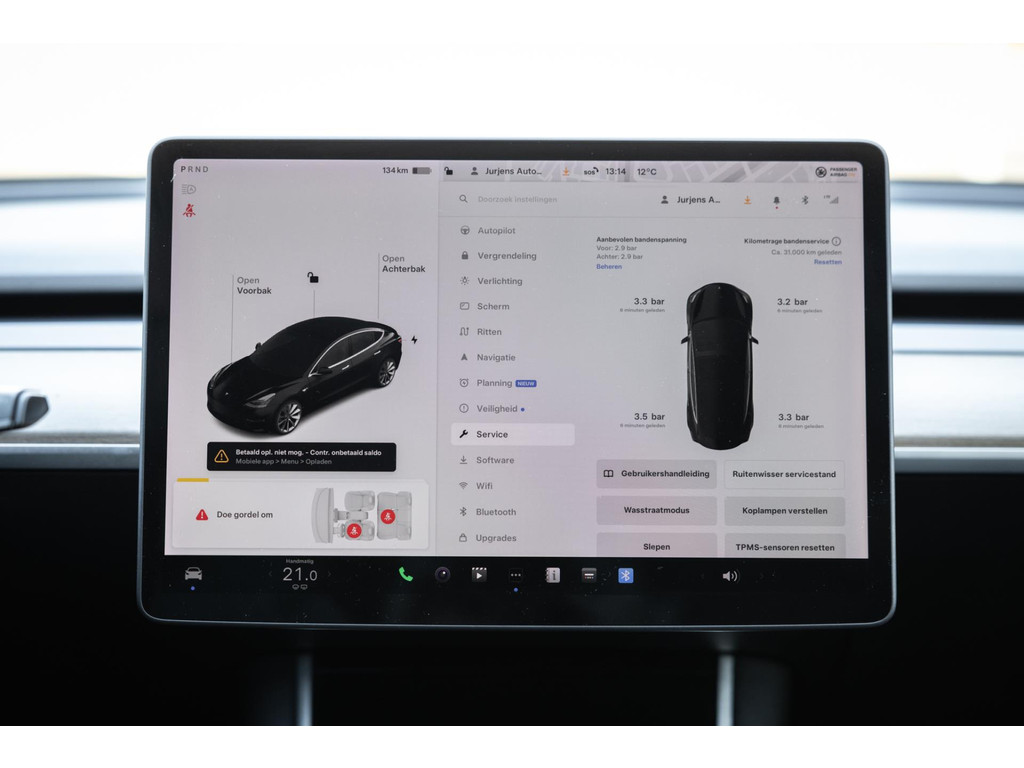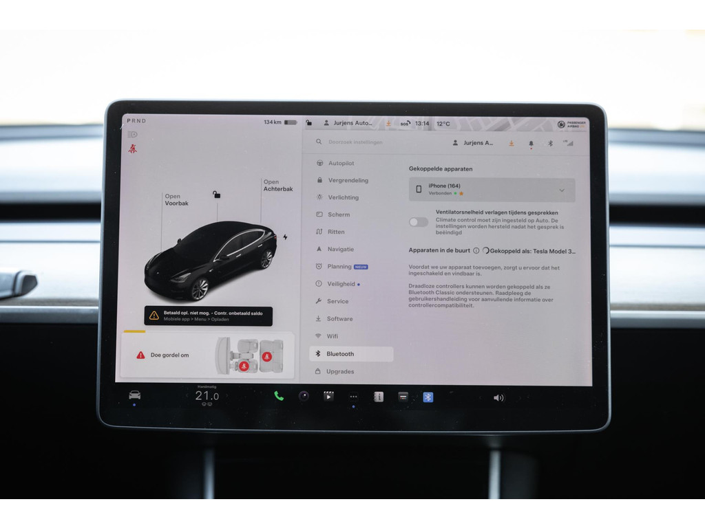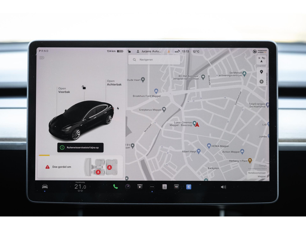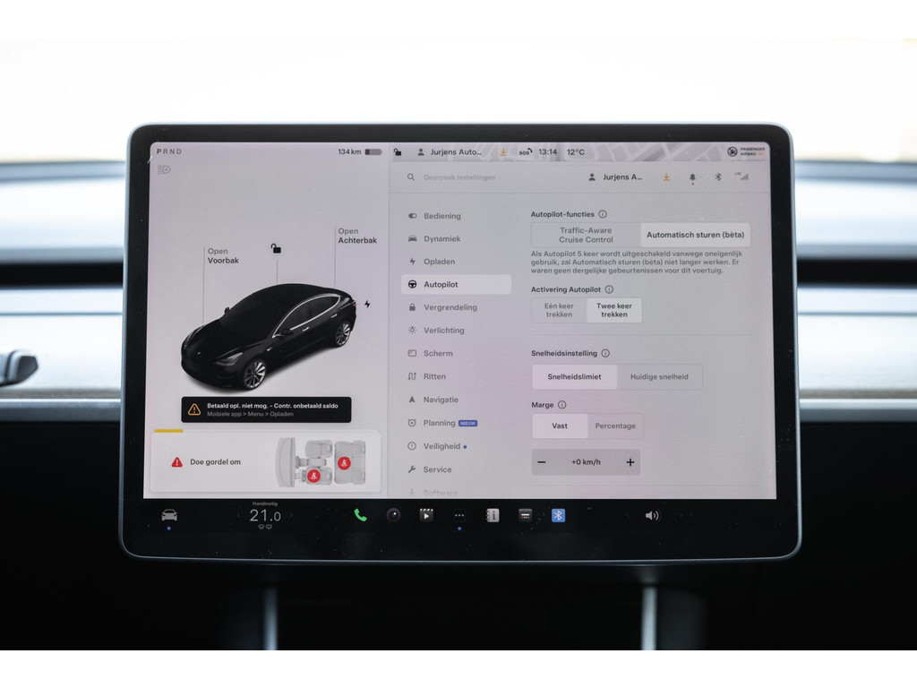 Alle models 3 zijn zo’n beetje gelijkwaardig uitgerust en de standaard ligt hoog. Zo is dit exemplaar voorzien van zwart lederen bekleding. De stoelen zijn elektrisch verstelbaar evenals het stuurwiel. Uiteraard zijn de zetels voorzien van stoelverwarming. Daarnaast een gigantisch glazen panoramadak. Alle verlichting is full LED wat een ongekende lichtopbrengst geeft en voorzien van grootlichtassistent. Het centrale scherm is enorm en biedt een keur aan instellingen, mogelijkheden en luxe. Van data, tot navigatie, van audio tot telefonie en van games tot de meest vreemde mogelijkheden, alles bedien je op het scherm. Uiteraard kent deze Model 3 ook het camerasysteem en is het Premium audiosysteem gekozen. Hel fraai zijn de originele Performance velgen. Niet vaak gezien, maar wel besteld op deze Tesla is de afneembare trekhaak.