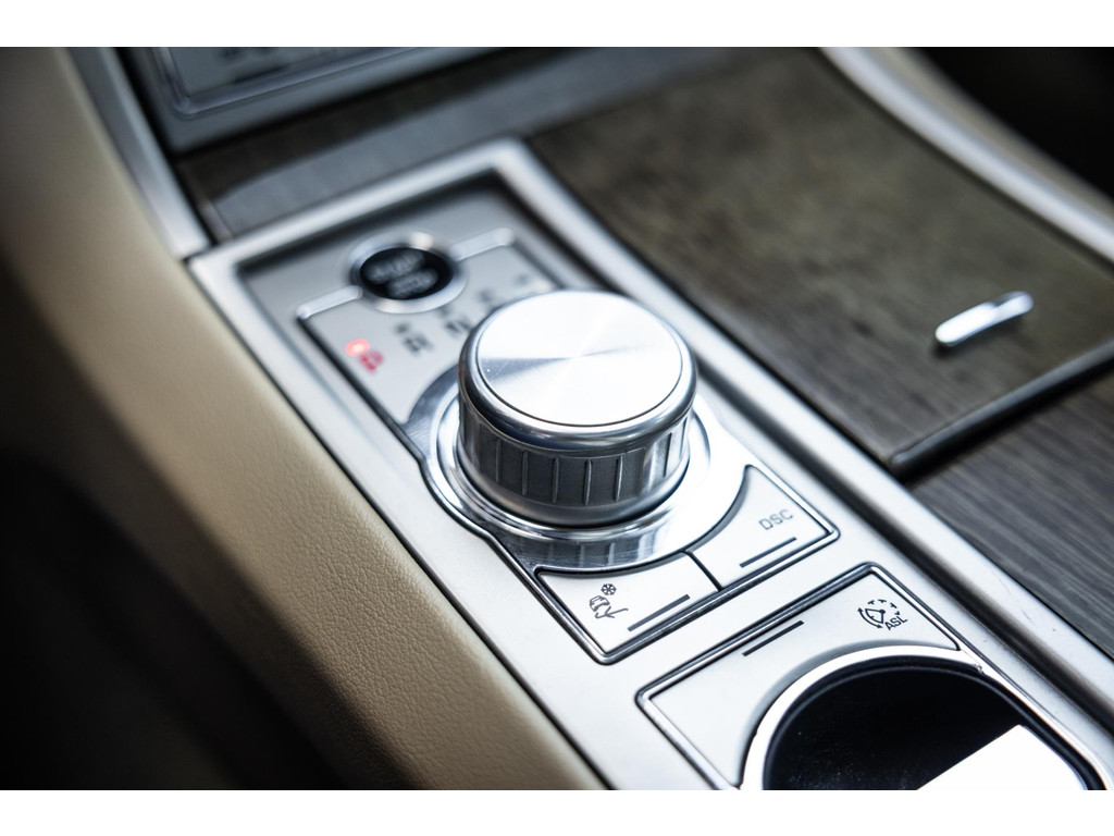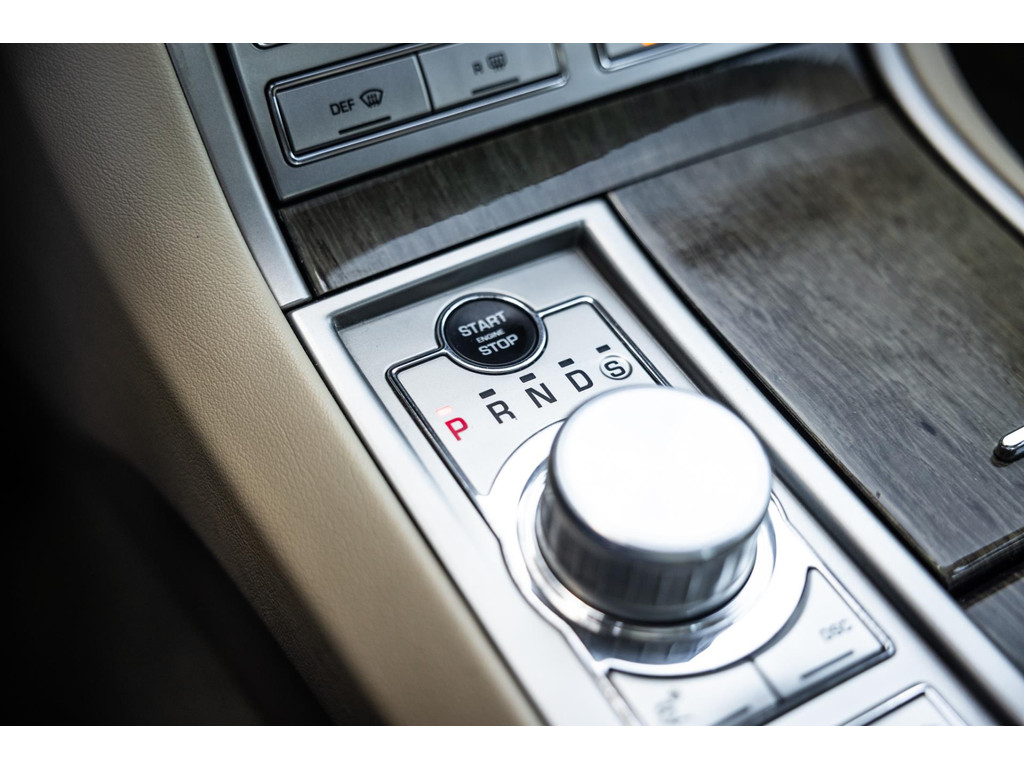 Bij het starten rees de ronde schakelknop elektrisch uit de middenconsole. Tezamen met de elektrisch openende ventilatieroosters een spektakel op zich. We draaien de selectieknop door naar D en zijn onderweg. Rustig en op de achtergrond draait de 4.2 zijn toeren. Oprecht een uiterst comfortabele auto. De automaat schakelt boterzacht terwijl je voelt dat er een overdaad aan koppel en vermogen schuil gaat achter het gaspedaal. Als het nodig is kan de XF in een krankzinnige 6,5 seconden vanuit stilstand naar 100 km/h accelereren en de topsnelheid is begrensd op maar liefst 250 km/h. Het is fijn om te weten dat het kan. Ons vermoeden is dat specifiek dit exemplaar dat nooit gedaan heeft.