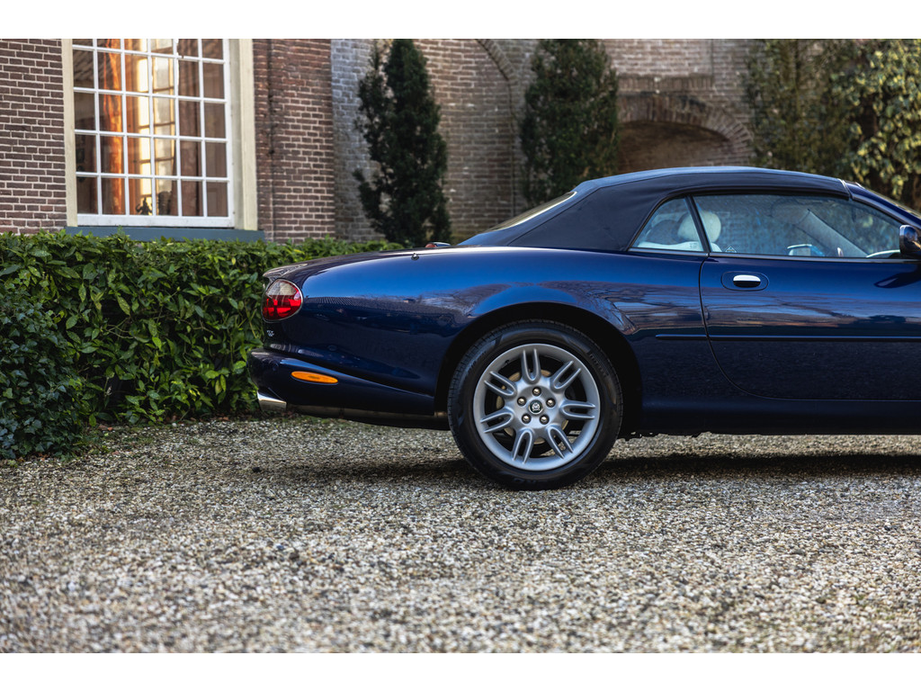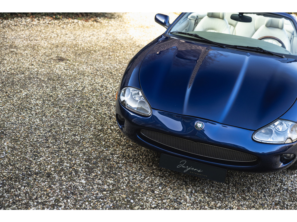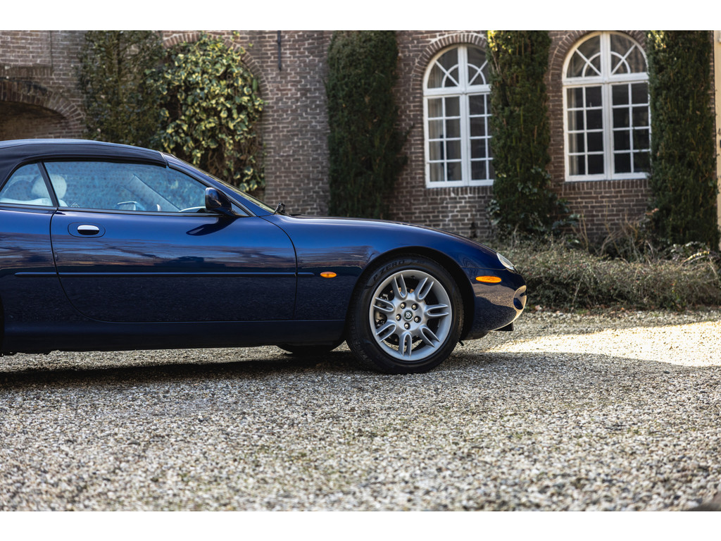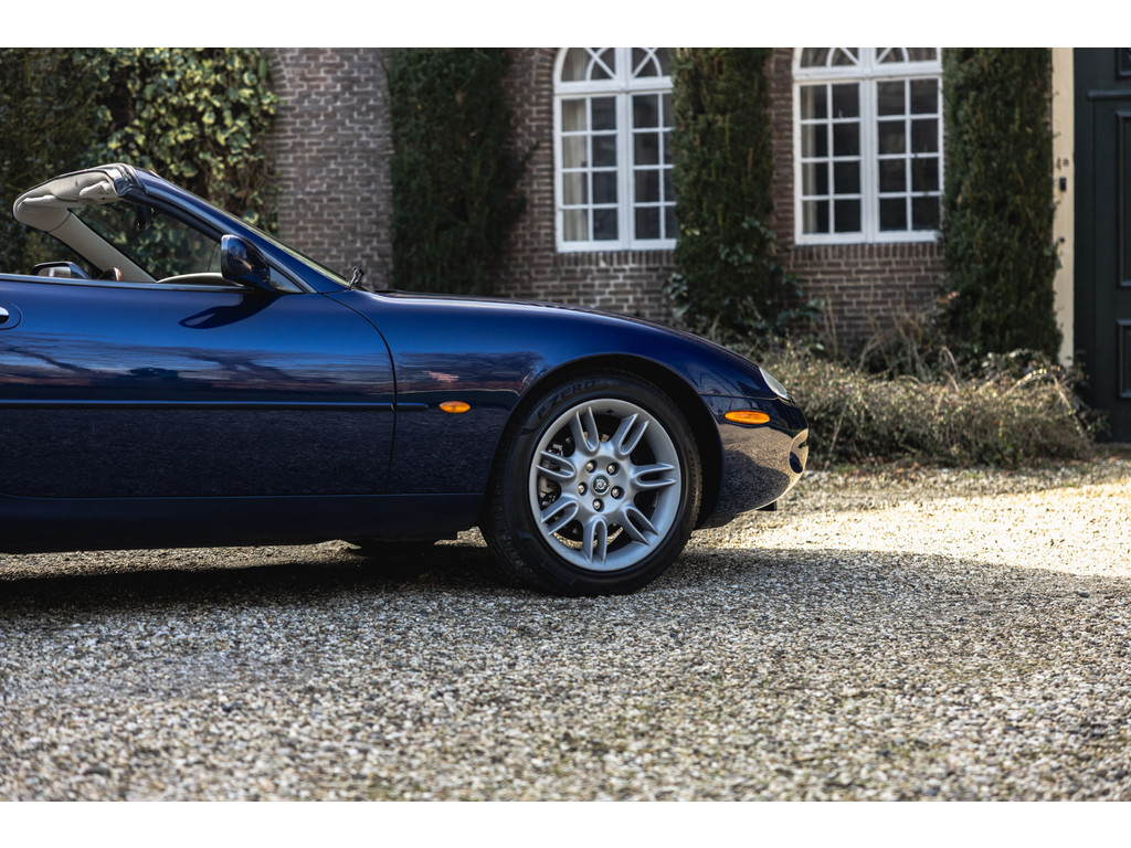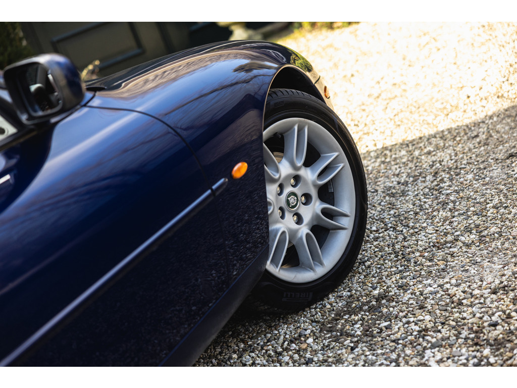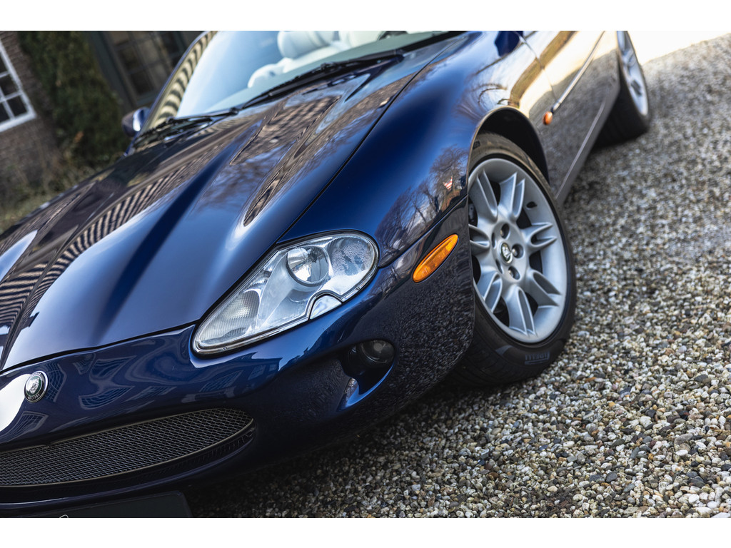 De samenstelling is werkelijk prachtig. De diep donkerblauwe kleur - Pacfici metallic - gecombineerd met het lichte Ivory lederen interieur en de overdadige houten sierlijsten passen perfect bij het model. Het geeft een extra chique uitstraling. Juist in deze kleurstelling komen we prachtige gewelfde delen perfect tot hun recht. De softtop is uitgevoerd in Marine Blue. De 18” Impeller velgen zie je niet vaak op de XK.