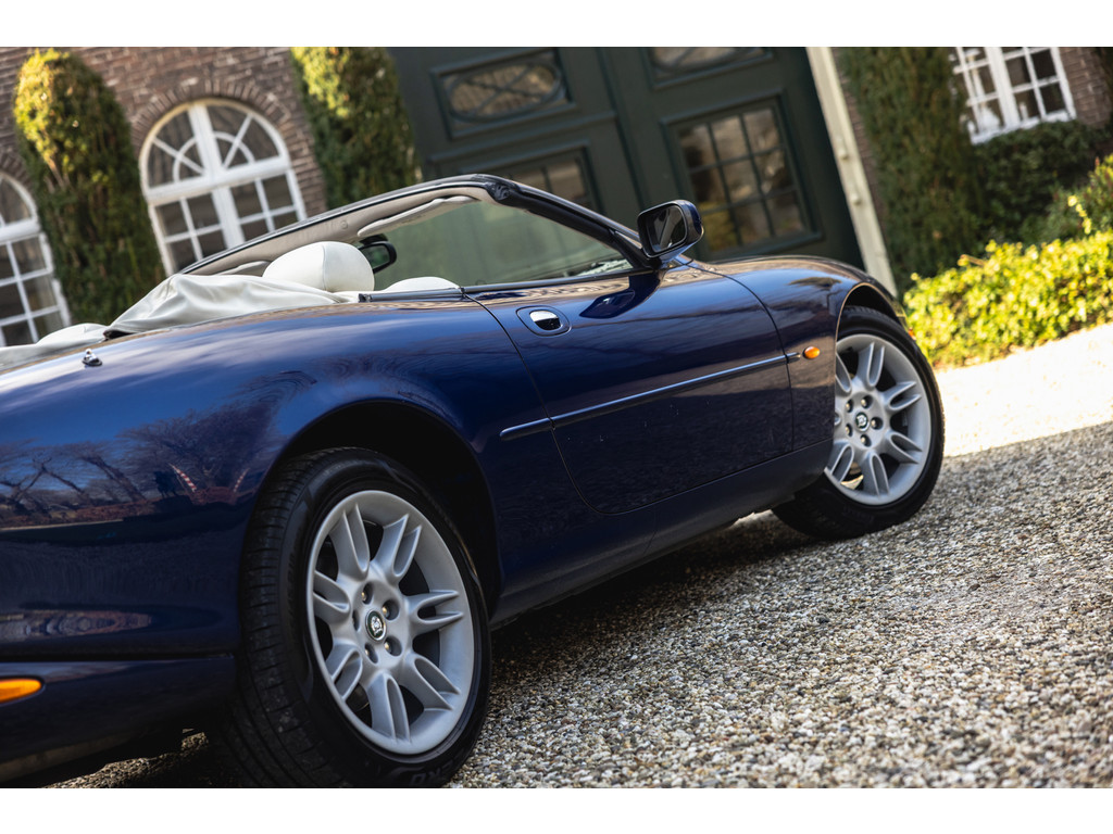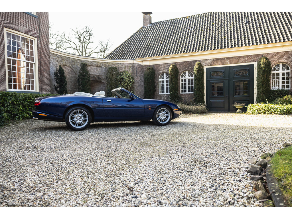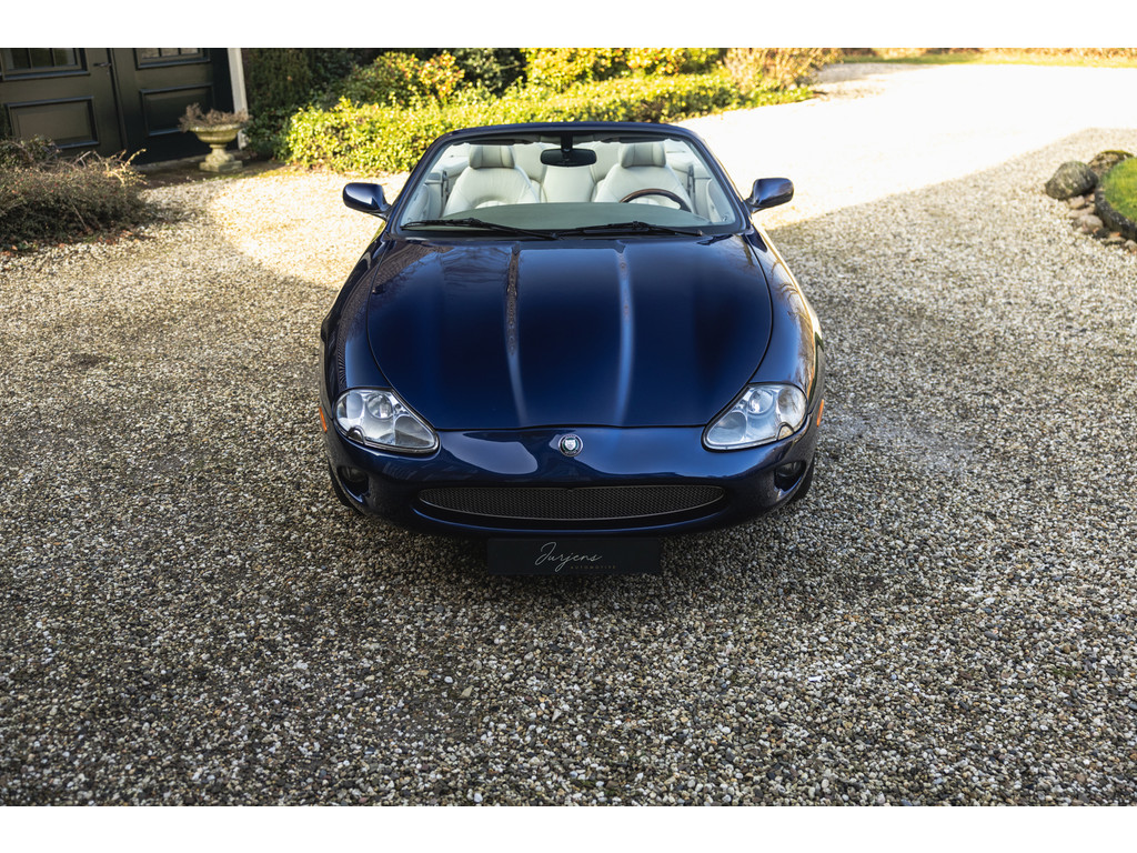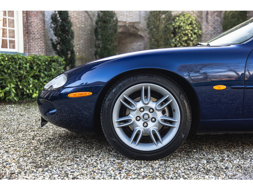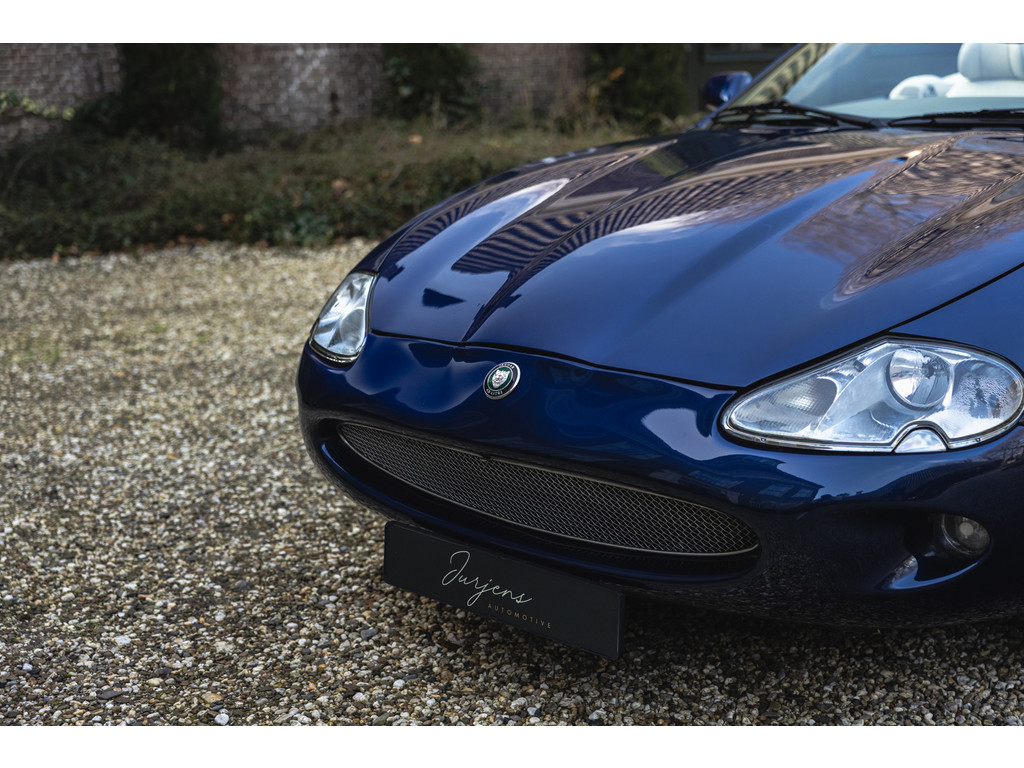De samenstelling is werkelijk prachtig. De diep donkerblauwe kleur - Pacfici metallic - gecombineerd met het lichte Ivory lederen interieur en de overdadige houten sierlijsten passen perfect bij het model. Het geeft een extra chique uitstraling. Juist in deze kleurstelling komen we prachtige gewelfde delen perfect tot hun recht. De softtop is uitgevoerd in Marine Blue. De 18” Impeller velgen zie je niet vaak op de XK.