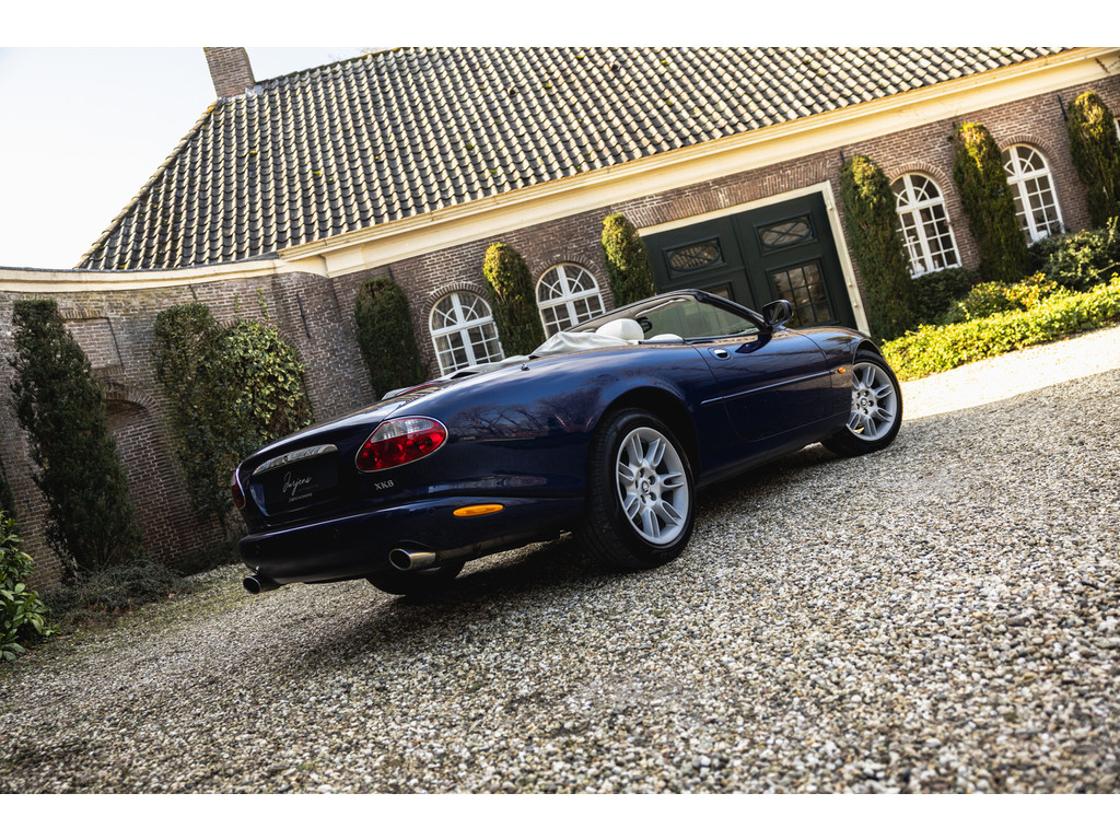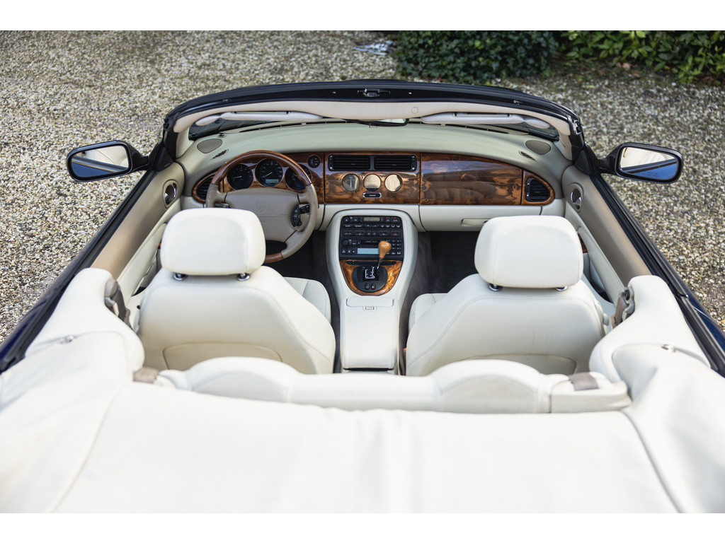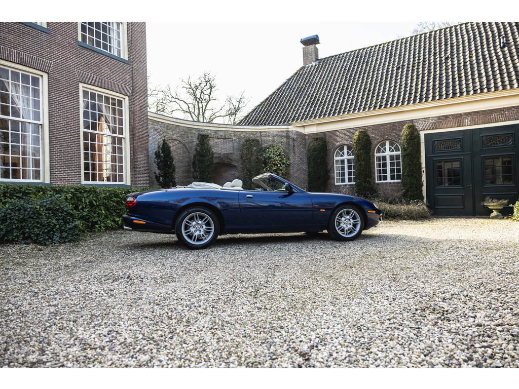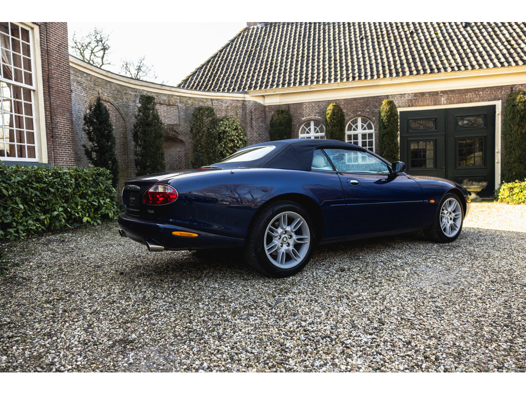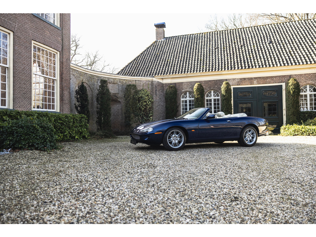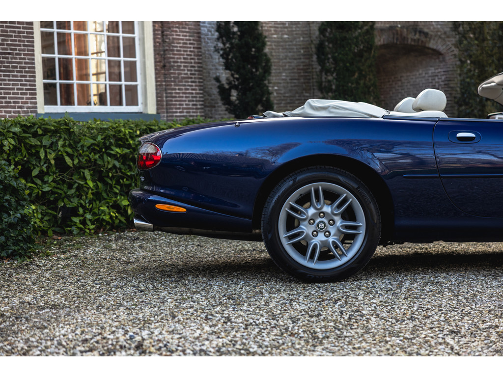 De samenstelling is werkelijk prachtig. De diep donkerblauwe kleur - Pacfici metallic - gecombineerd met het lichte Ivory lederen interieur en de overdadige houten sierlijsten passen perfect bij het model. Het geeft een extra chique uitstraling. Juist in deze kleurstelling komen we prachtige gewelfde delen perfect tot hun recht. De softtop is uitgevoerd in Marine Blue. De 18” Impeller velgen zie je niet vaak op de XK.