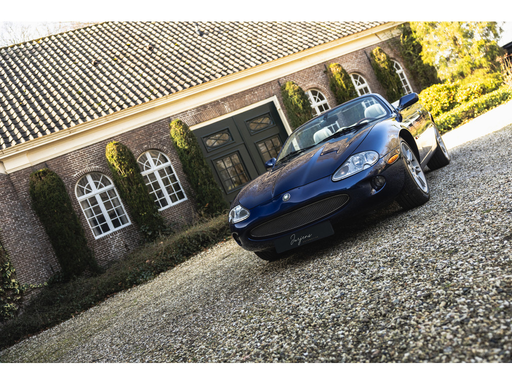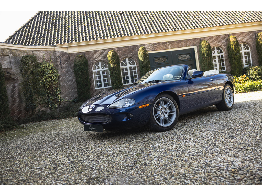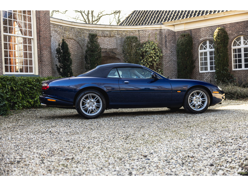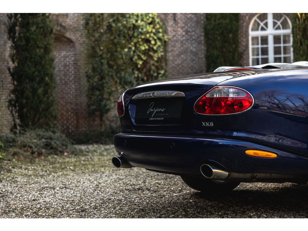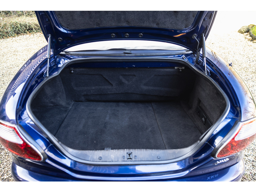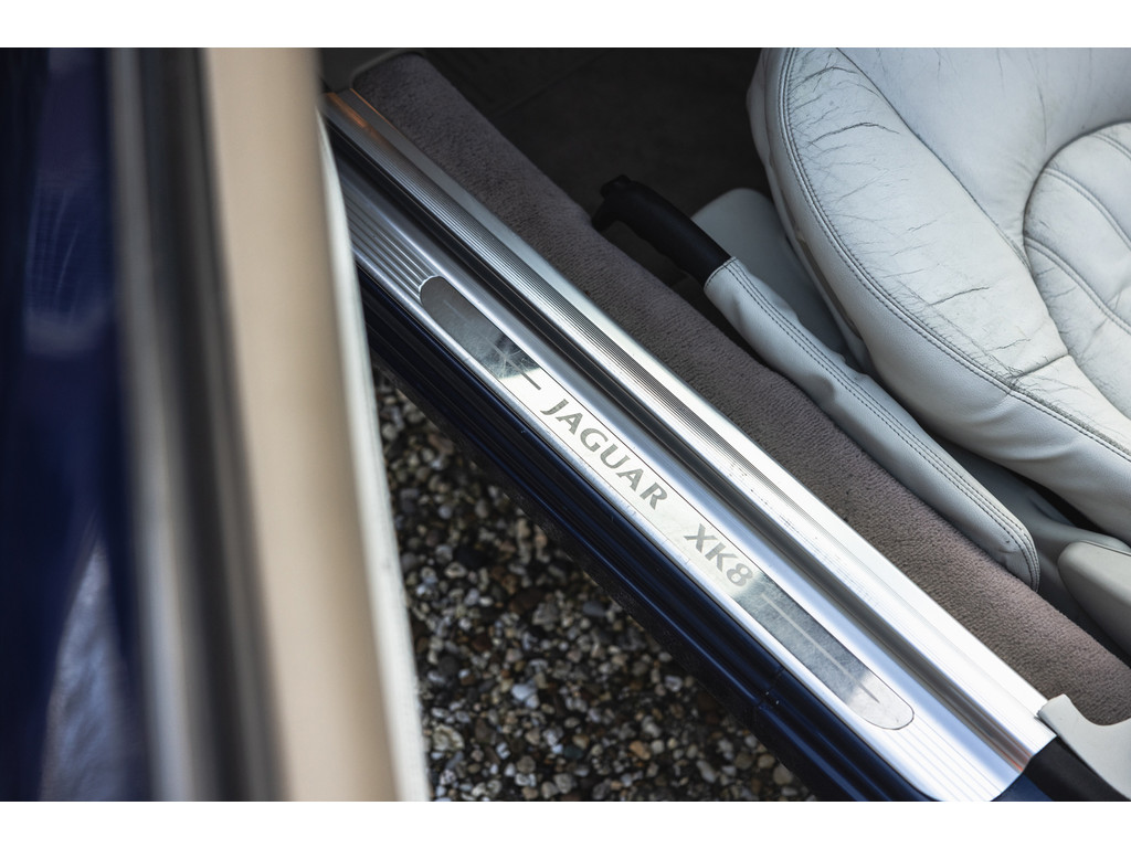 Dit is de Jaguar XK8 Convertible met de prachtige 4.0 V8 in het vooronder. Een exemplaar waar recentelijk heel veel onderhoud aan is uitgevoerd. Vrijwel het gehele onderstel qua draagarmen, stuurkogels, fuseekogels en wiellagers zijn vervangen. Tevens nieuwe motorsteunen, remblokken, remvloeistof en dergelijke. Ook blijkt de kettingspanner modificatie te zijn uitgevoerd. Afgelopen januari is voor meer dan EUR 5.500 de automaatbak nog gereviseerd bij Jaguar specialist Werkman in Kolham. Al dit recente onderhoud is keurig gedocumenteerd en gebundeld in een map. Zelf hebben we de kleppendekselpakkingen nog vervangen voordat we de auto in verkoop namen. Optisch verkeert de XK Convertible in een goede toestand. Het interieur is netjes, maar het leder op de bestuurderstoel kent wat ouderdom verschijnselen. De houten sierlijsten zijn nog mooi diep donker van kleur. De softtop verkeert in een uistekende toestand en de elektrische werking is perfect.