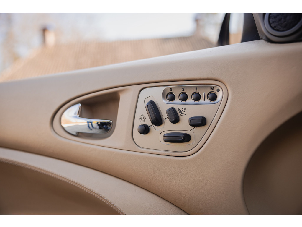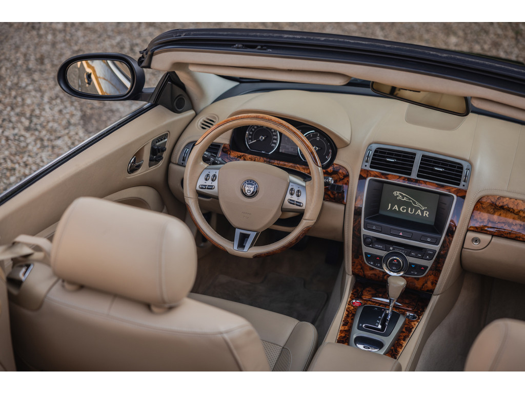 Zoals het een Brit betaamt is het interieur rijkelijk voorzien van leder en houten sierlijsten. In de XK is dat niet anders. De zetels, het dashboard, alles is bekleed in prachtig leder en gecombineerd met chique sierlijsten. Luxe alom. Besef dat de XK inmiddels 20 jaar oud is en dan zulke opties kende. Zo zijn de stoelen volledig elektrische verstelbaar en voorzien van memorystanden en uiteraard beschikken ze over stoelverwarming. Overigens is ook het stuurwiel elektrisch verstelbaar en te verwarmen. In het midden prijkt het grote scherm van het multimediasysteem. Het betreft een touchscreen en het beschikt over klimaatinstelling, bluetooth, navigatie, en audio. Dat laatste werd verzorgd door Alpine. Het Dolby Surround ProLogic systeem levert maar liefst 525W. Het stuurwiel is voorzien van de bedieningsknoppen. Hier vind je ook de bedienen van de adaptieve cruise control. Een bijzondere optie in die tijd. De auto houdt middels radartechniek zelf afstand tot de voorligger. Verder uiteraard dual zone climate control, voorruitverwarming, key-less en de softtop is elektrisch bediend. Dit laatste kan zelfs rijdend tot een bepaalde snelheid. Heel fraai zijn de koplampen met xenon verlichting.