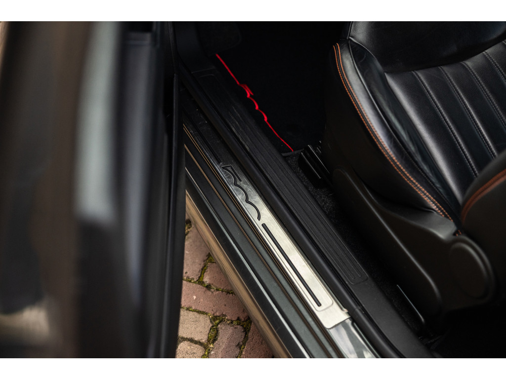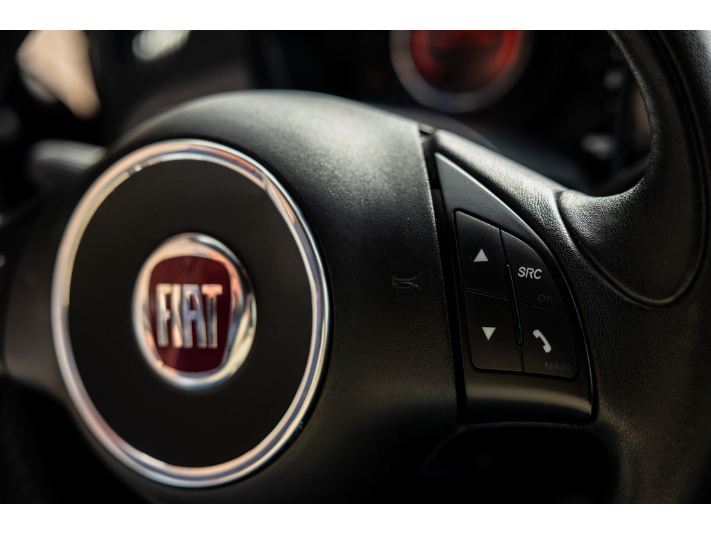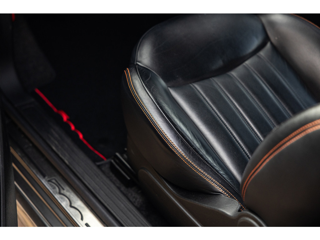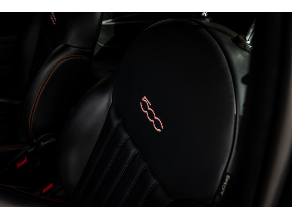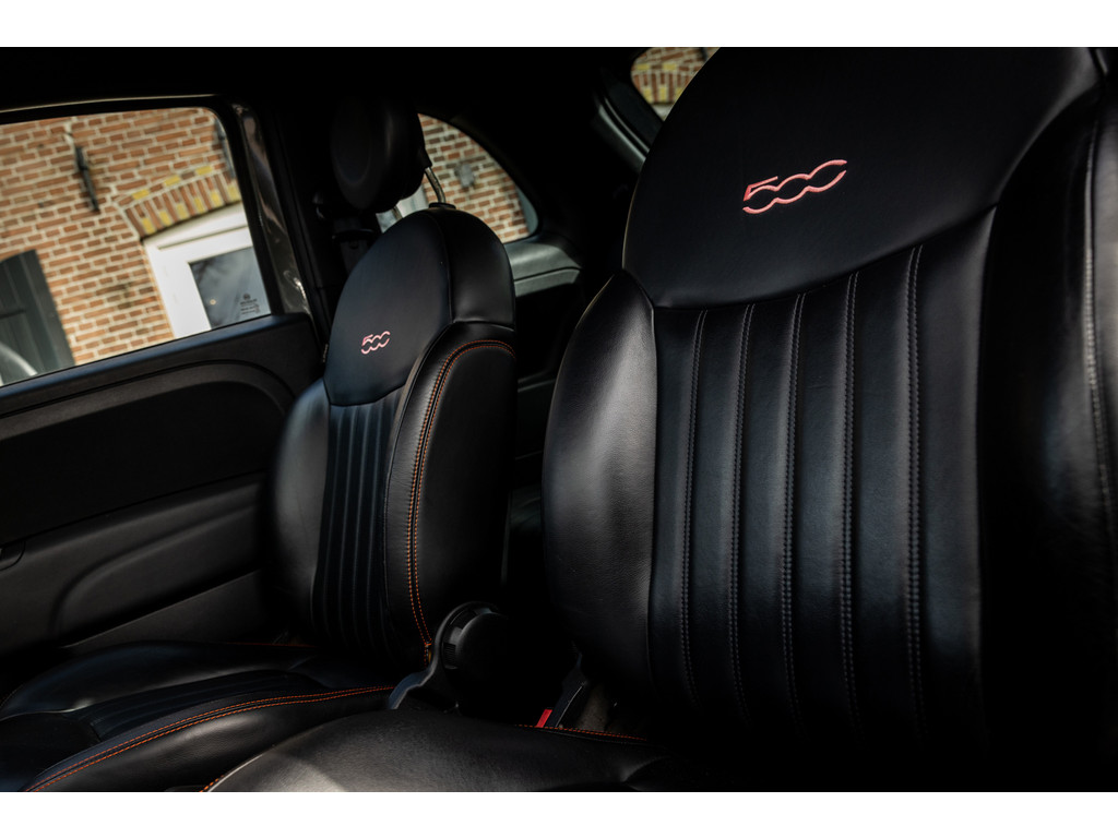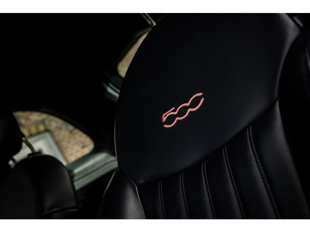 Binnenin wordt je verwend door sportstoelen in zwart leder met prachtige rode stiksel, een dashboard dat in de kleur van het exterieur is gespoten met rood 500 embleem en zwarte hemelbekleding. Verder uiteraard airconditioning, een origineel audiosysteem met Blue&Me en stuurwielbediening. Spiegels en ramen zijn elektrisch.