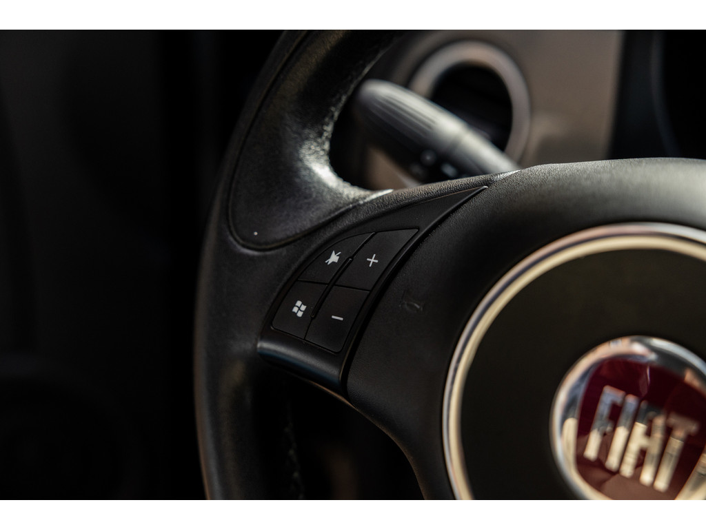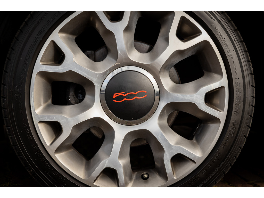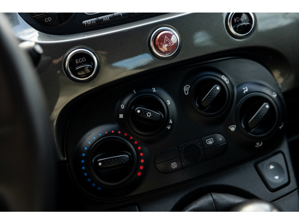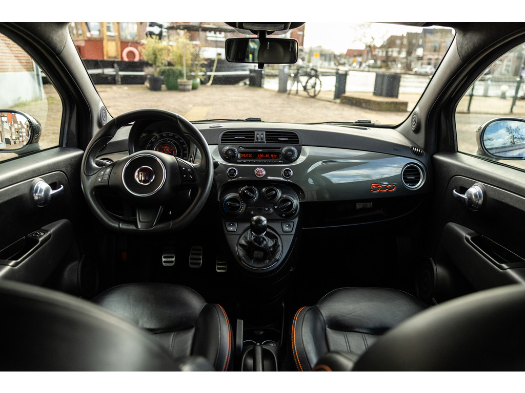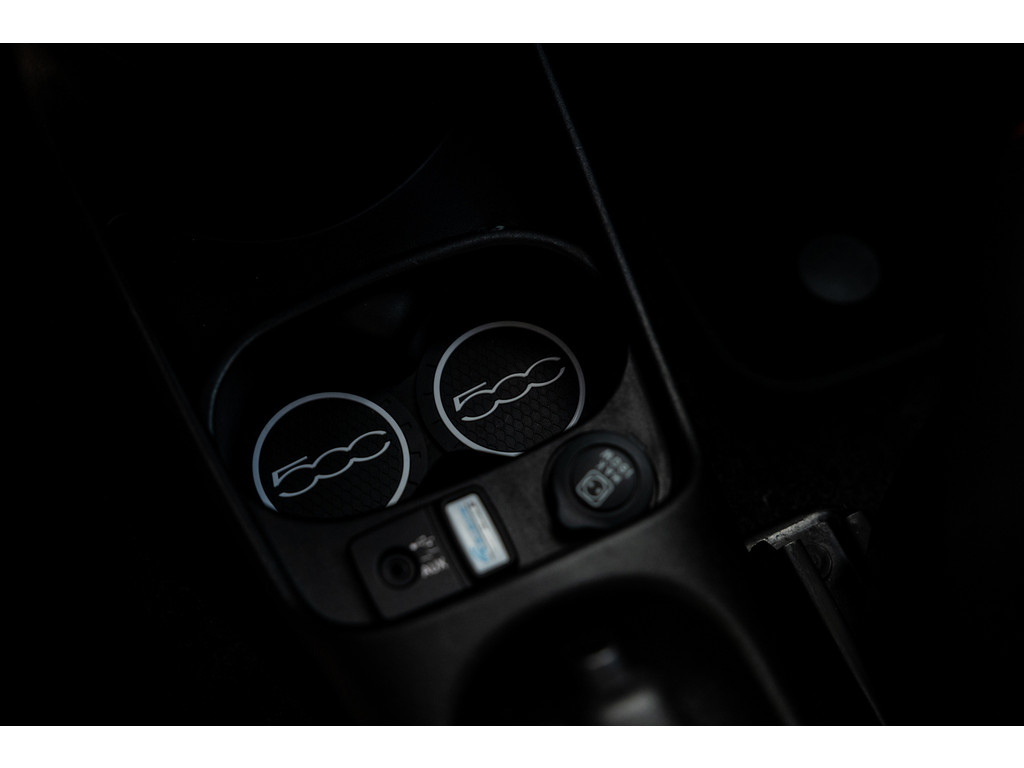 Binnenin wordt je verwend door sportstoelen in zwart leder met prachtige rode stiksel, een dashboard dat in de kleur van het exterieur is gespoten met rood 500 embleem en zwarte hemelbekleding. Verder uiteraard airconditioning, een origineel audiosysteem met Blue&Me en stuurwielbediening. Spiegels en ramen zijn elektrisch.