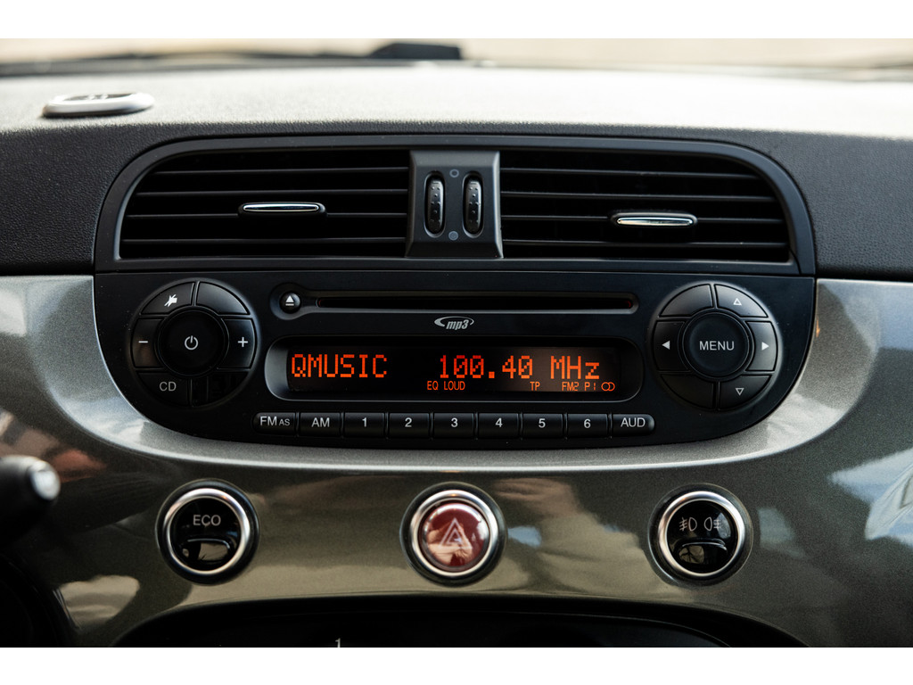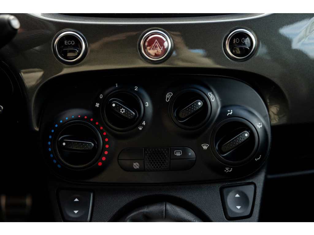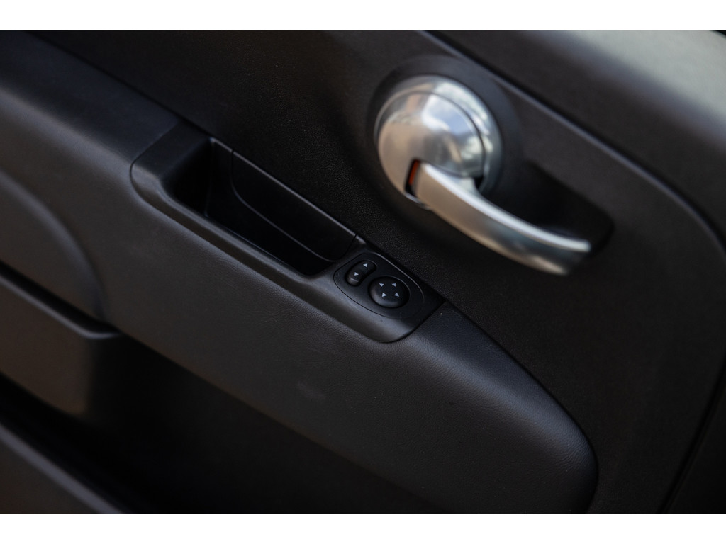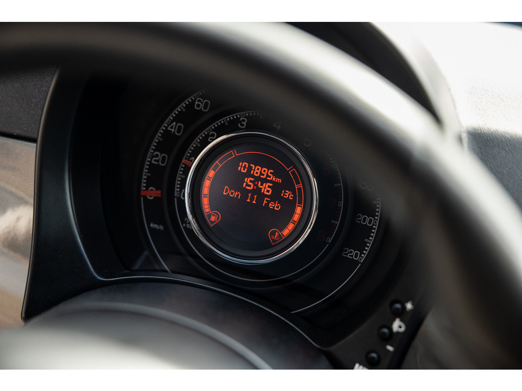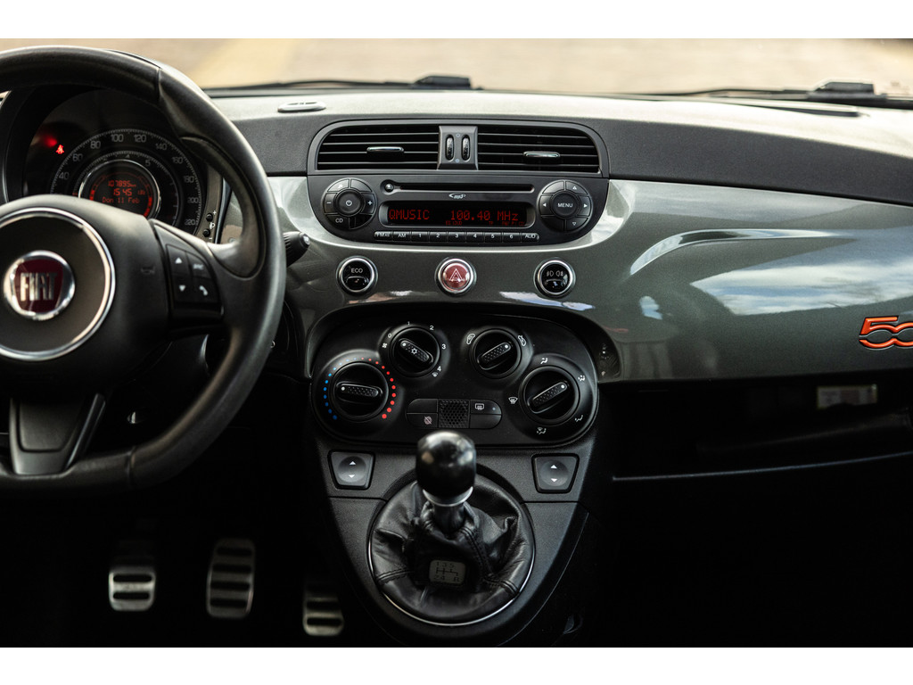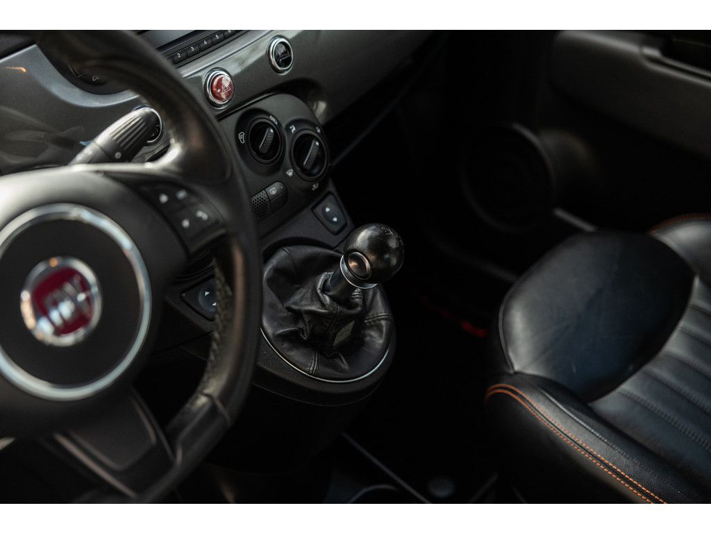 Binnenin wordt je verwend door sportstoelen in zwart leder met prachtige rode stiksel, een dashboard dat in de kleur van het exterieur is gespoten met rood 500 embleem en zwarte hemelbekleding. Verder uiteraard airconditioning, een origineel audiosysteem met Blue&Me en stuurwielbediening. Spiegels en ramen zijn elektrisch.